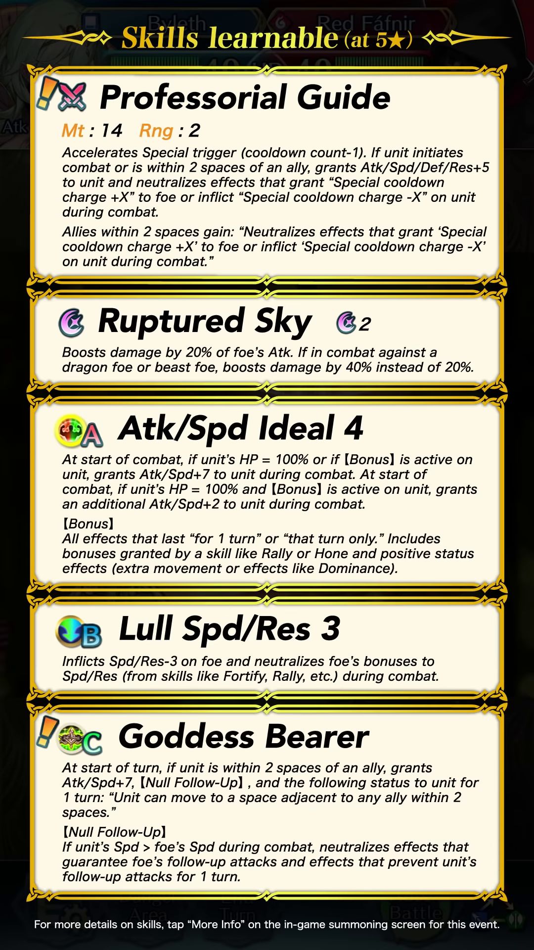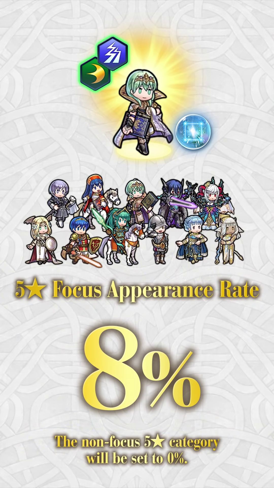 Comme les focus de héros légendaires et mythiques précédents, cet événement permettra aussi de recruter des héros spéciaux 5* qui étaient disponibles autrefois dans de précédents focus. De plus, le taux d’apparition initial des héros 5* sera de 8 %. Cependant, il faut savoir comme d’habitude que le taux d’apparition des héros 5* normaux sera de 0 %. À noter également qu’en invoquant Byleth, Lumière de Fódlan, on recevra une bénédiction du vent. Les héros ayant reçu cette bénédiction obtiendront deux fois plus de PA en combattant et bénéficieront d’un boost s’ils combattent aux côtés de Byleth, Lumière de Fódlan pendant la saison du vent.