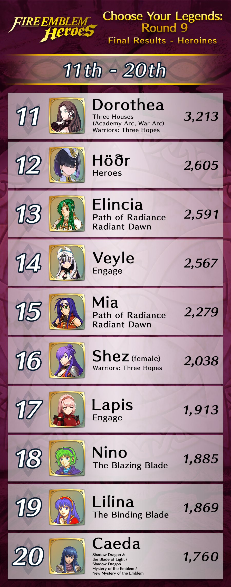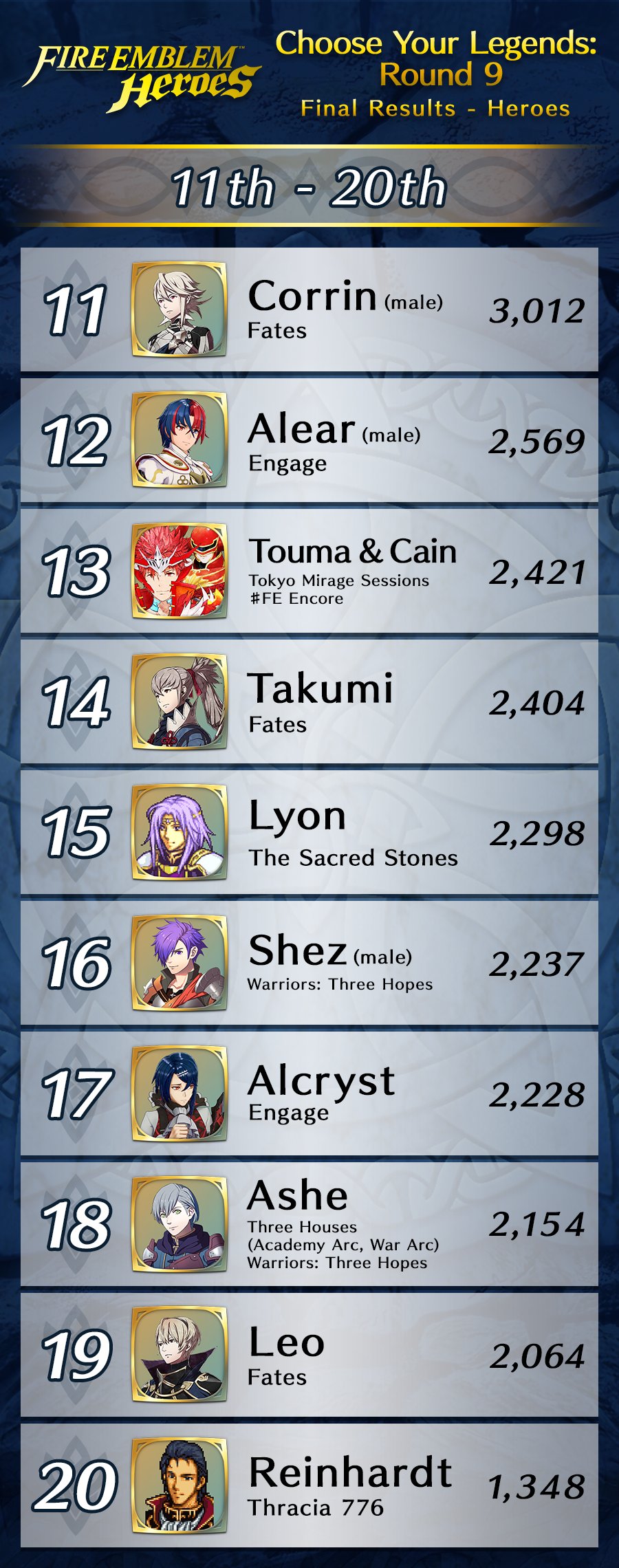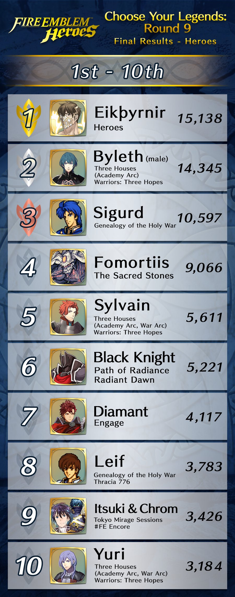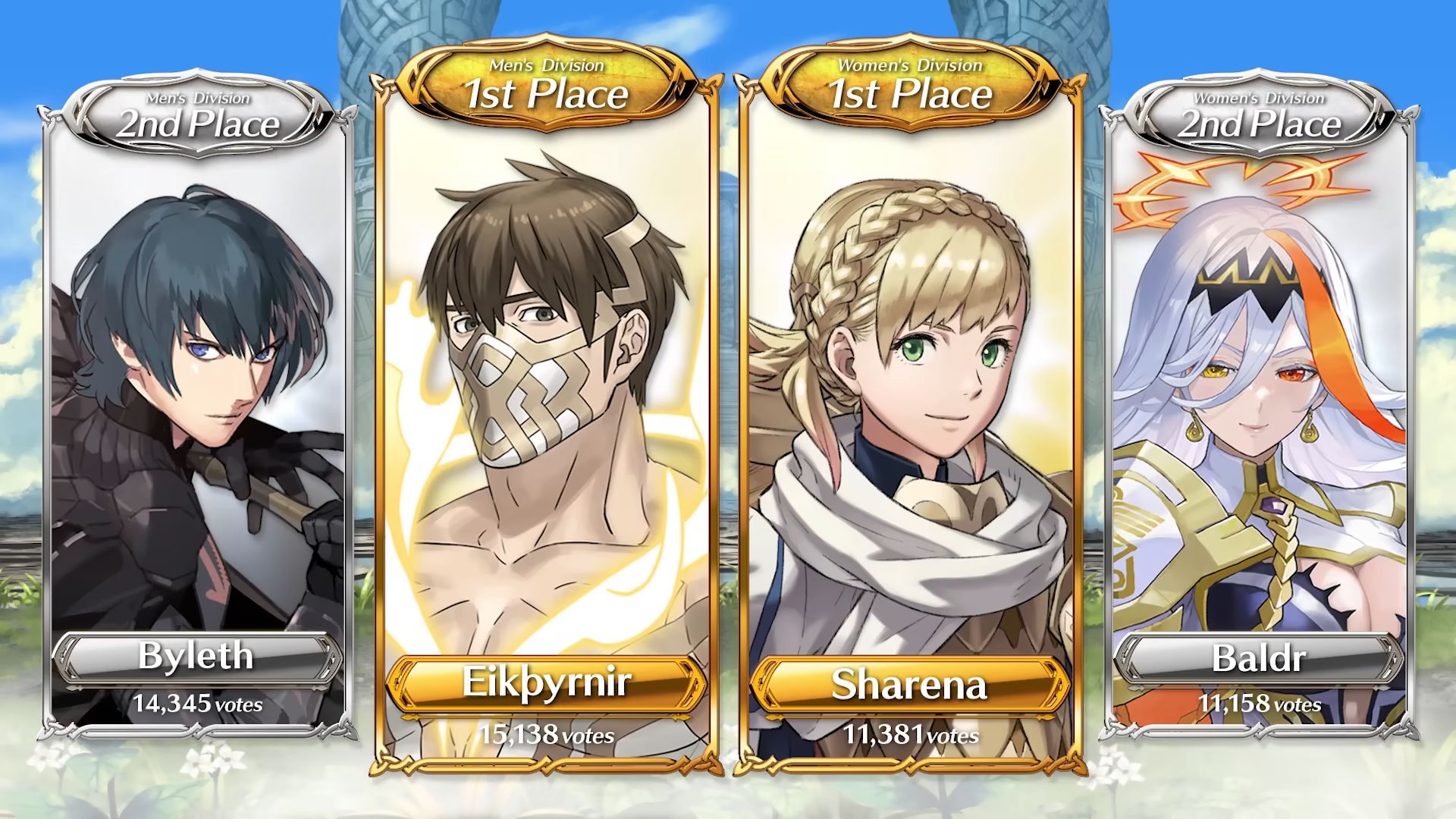 L’événement « Choisissez vos héros n° 9 » s’est terminé le 27 janvier dernier. Les personnages ayant reçu le plus de votes sont donc Eikþyrnir (15 138 votes) d’Heroes, Byleth (homme, 14 345 votes) de Three Houses, Sharena (11 381 votes) d’Heroes et Baldr (11 158 votes) d’Heroes. Ces quatre héros auront droit à une version spéciale, dans un nouveau focus qui sera disponible cet été (certainement en août). Les résultats complets de l’événement « Choisissez vos héros n° 9 » sont accessibles à cette adresse. Vous pouvez découvrir les héros de la précédente édition dans notre article ici.