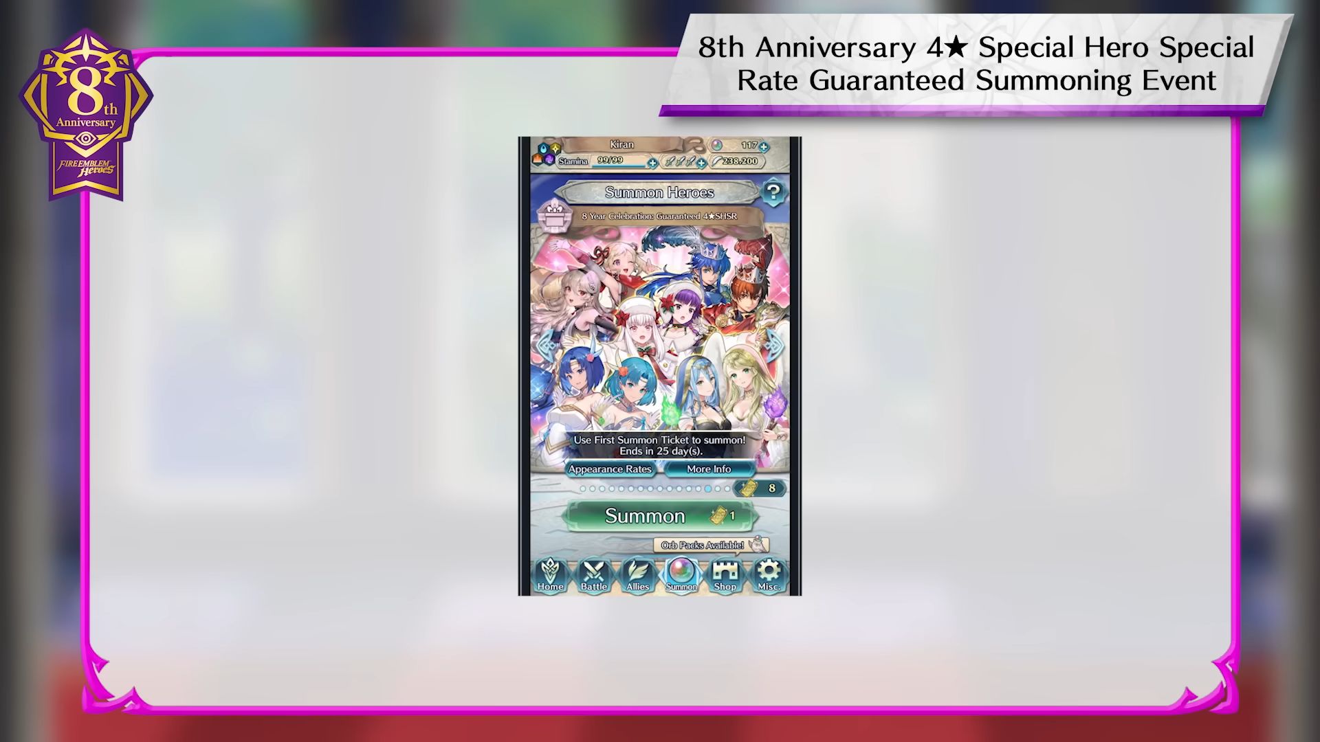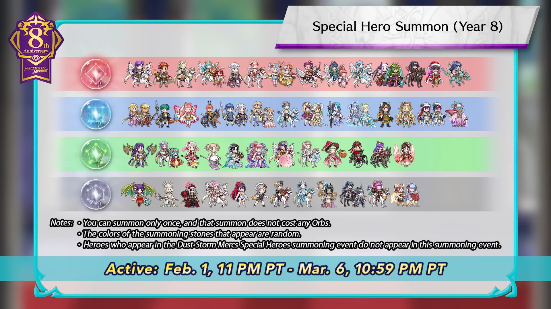 En participant à l’événement d’invocation « Héros spéciaux (8e année) », vous allez pouvoir obtenir un héros spécial 5★ à coup sûr ! Tous les héros spéciaux qui sont apparus dans le jeu l’année dernière sont disponibles dans cet événement. Chaque joueur pourra invoquer un héros pendant cet événement sans utiliser d’orbes ! Consultez la liste de héros pour découvrir les 52 héros apparaissant dans cet événement d’invocation.