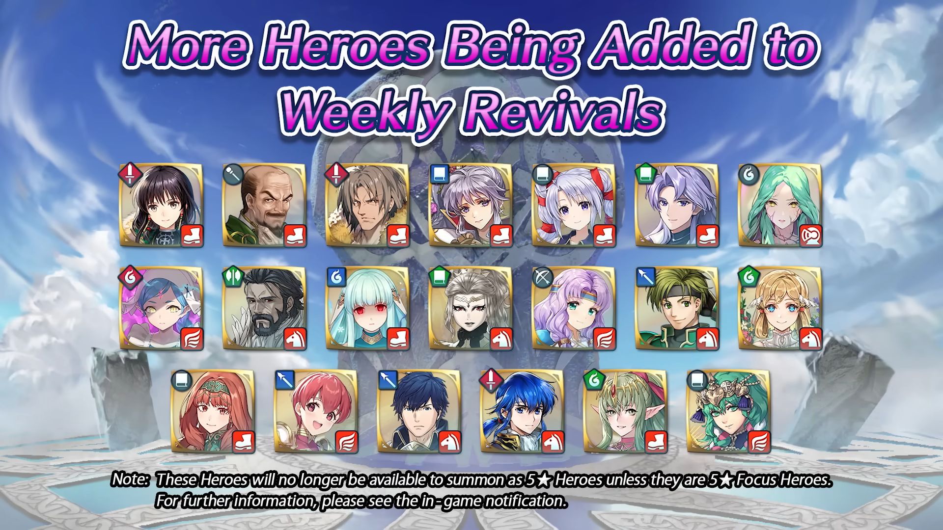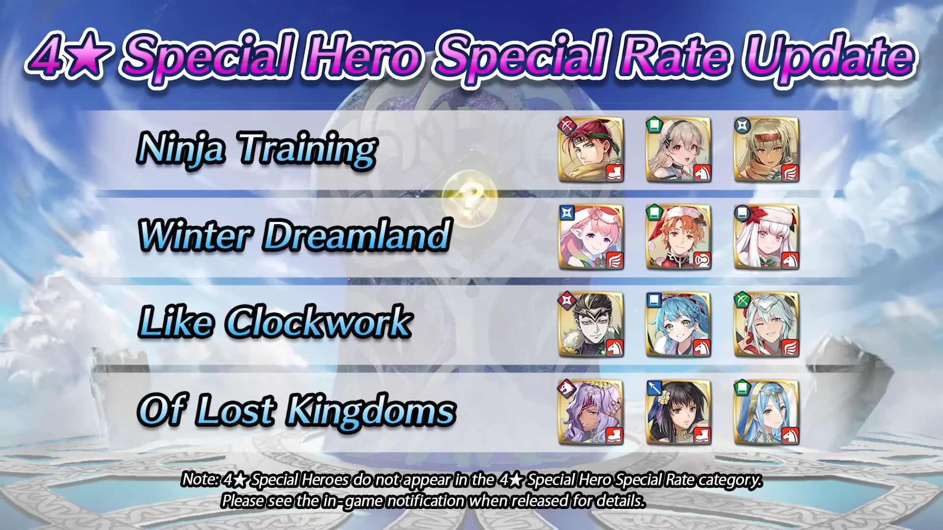 Un total de 39 héros spéciaux apparus entre les versions 5.2 et 6.1 du jeu seront ajoutés à la catégorie Taux héros spéciaux 4★. Ce taux sera aussi actif dans les événements d’invocation dans lesquels ces héros sont initialement apparus.
