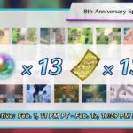Une carte à récompense apparaîtra quotidiennement pendant 13 jours consécutifs. Deux niveaux de difficulté seront disponibles pour ces cartes : Normal et Difficile. Vous pouvez obtenir 13 orbes et 13 tickets d’invocation pour le focus du huitième anniversaire « Célébration : Taux h. spéc. 4★ garanti ».