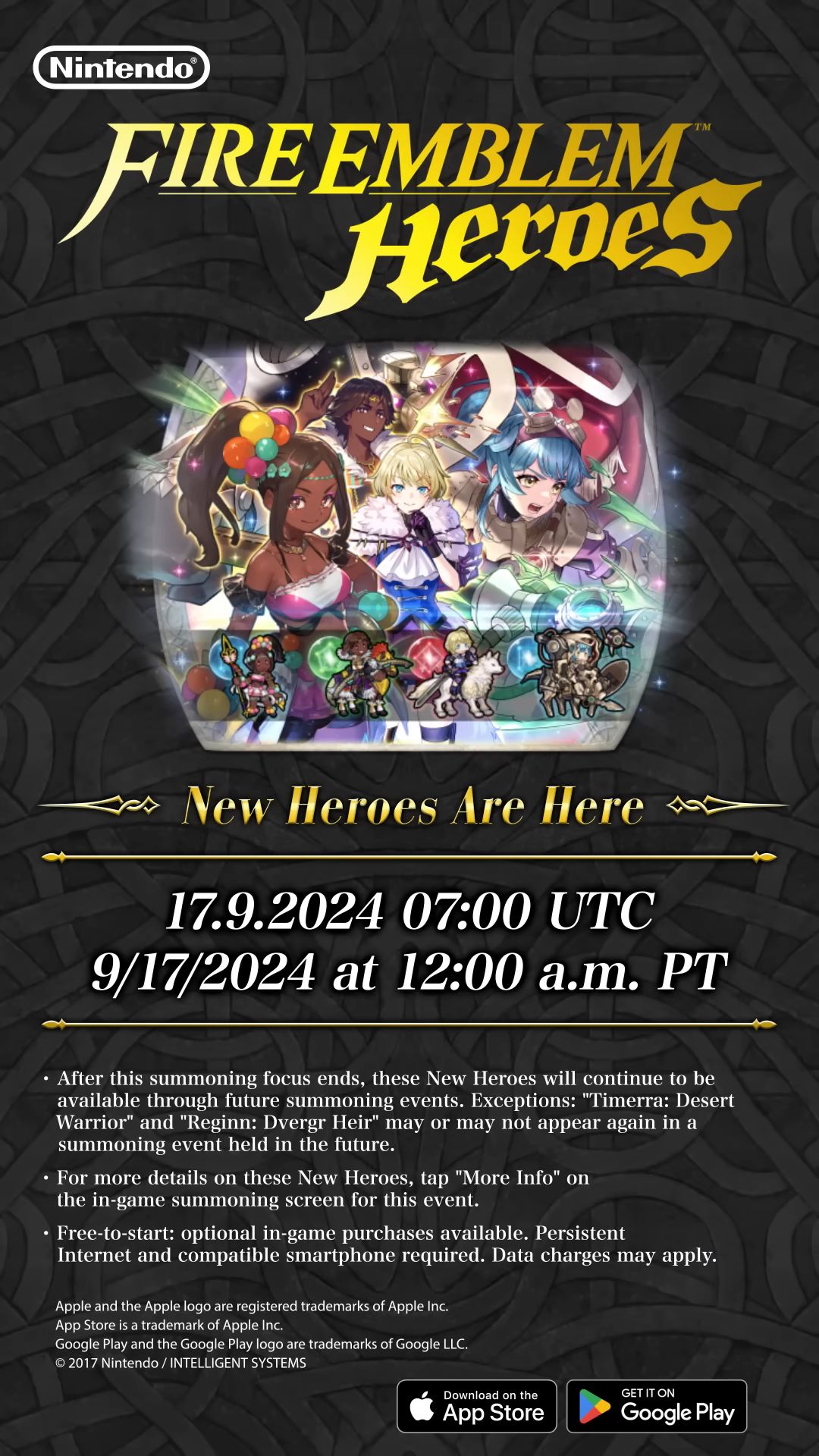 Nintendo et Intelligent Systems ont lancé un focus de nouveaux héros pour Fire Emblem Heroes ajoutant la toute première héroïne renforcée, Reginn, Héritière naine, ainsi que trois personnages issus de Fire Emblem Engage : Timerra (fantassin, lance) en symbiose, Fogado (unité montée, arc vert) et Merrin (unité montée, épée). Dans le cadre de l’introduction des héros renforcés, il est également possible d’obtenir gratuitement deux exemplaires de Pandreo (fantassin, bâton) via des quêtes disponibles jusqu’au 4 octobre à 8:59. Il y a aussi une grande bataille contre Marni (unité cuirassée, hache) jusqu’au 26 septembre à 8:59. D’autres événements de célébration pour l’arrivée des héros renforcés sont détaillés à cette adresse. Il y a aussi les informations concernant la dernière mise à jour sortie, la version 8.9.0.