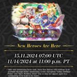 Nintendo et Intelligent Systems ont récemment lancé un focus de nouveaux héros pour Fire Emblem Heroes, disponible jusqu’au 6 décembre à 7:59, ajoutant Þjazi (unité cuirassée, hache), apparue dans le scénario « Ancien roi, future reine », qui est une héroïne mystérieuse, et trois personnages issus de l’épisode The Binding Blade : Elffin (fantassin, tome gris), Ogier (fantassin, épée) et une version mystérieuse de Lilina (fantassin, tome vert). Bors (unité cuirassée, lance) apparaît également sans faire partie du focus en versions 3 et 4 étoiles. Il y a aussi une grande bataille contre Zeiss (unité volante, lance) jusqu’au 23 novembre à 7:59. De plus, les événements du « vendrediscount » de cette année ont été lancés. Ils sont disponibles jusqu’au 22 décembre à 7:59 et sont détaillés à cette adresse.