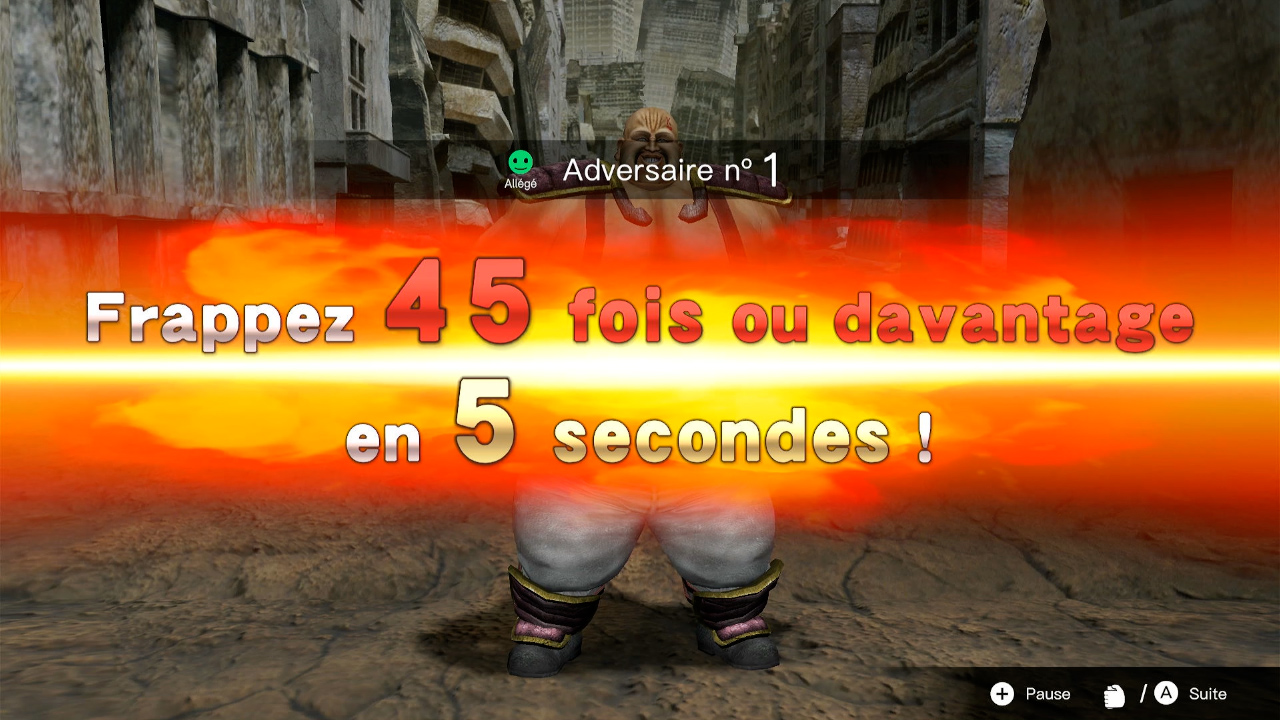 Le mode Raoh comprend le Défi du coup unique, durant lequel vous rouez de coups des hors-la-loi à l’aide de frappes rapides et précises, ainsi que le Test de vitesse de coups, qui mesure la vitesse de vos coups de poing. Devenez Raoh et donnez à vos ennemis un aperçu de sa force légendaire !
