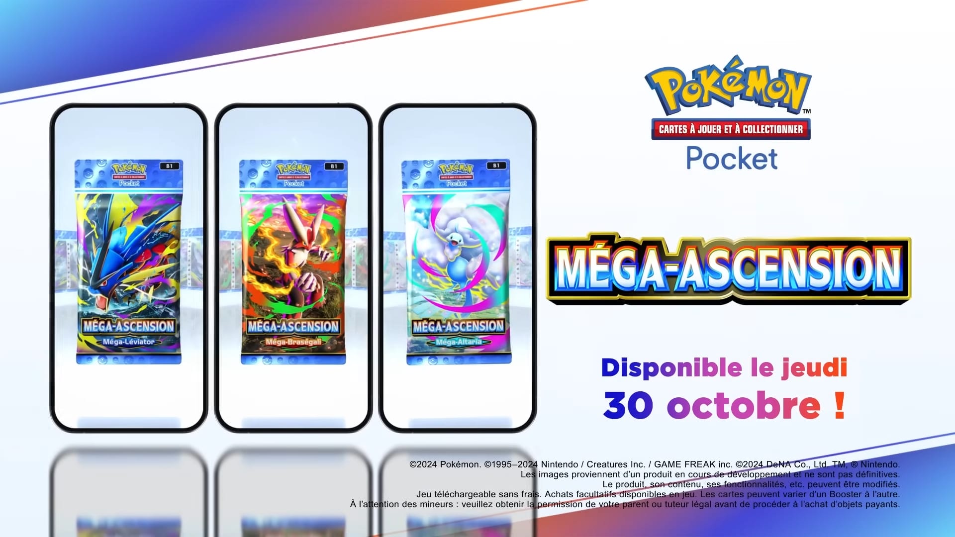 En août dernier, The Pokémon Company annonçait l’arrivée des cartes Pokémon-ex Méga-Évolution dans le Jeu de Cartes à Collectionner Pokémon Pocket (Pokémon Trading Card Game Pocket) de Creatures et DeNa sur Android et iOS pour cet automne. On sait désormais qu’une nouvelle extension, appelée Méga-Ascension, avec les premières cartes de Pokémon méga-évolués sera disponible à partir du jeudi 30 octobre 2025 à 08:00 (heure française). Trois Boosters appelés seront disponibles, à l’effigie de Méga-Léviator, Méga-Braségali et Méga-Altaria. Contrairement à l’extension spéciale Booster de Luxe ex, l’extension Méga-Ascension demeurera disponible. Dans le même temps, The Pokémon Company a annoncé que le jeu a dépassé les 150 millions de téléchargements depuis sa sortie mondiale datant du 30 octobre 2024.