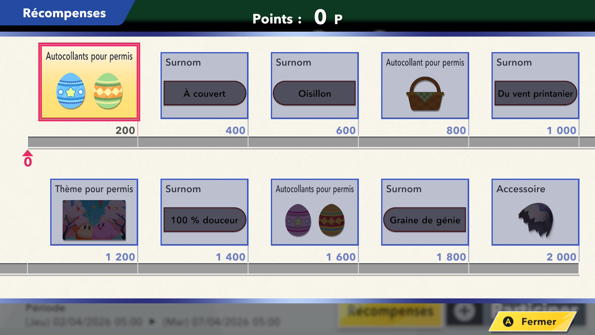 Plusieurs récompenses sont à la clé lors de cet événement : cinq autocollants pour permis, cinq surnoms, un thème pour permis et un accessoire.