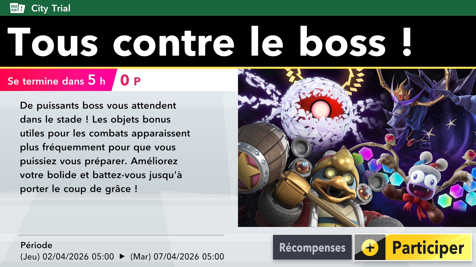 De plus, un nouvel événement est également en cours dans Kirby Air Riders. Intitulé « Tous contre le boss ! » et disponible jusqu’au mardi 7 avril 2026 à 05:00 du matin, il concerne le mode City Trial et permet de participer à chaque fois à des combats de boss dans le stade. Pour se préparer, les objets bonus utiles pour les combats apparaissent plus fréquemment avant d’affronter le boss.