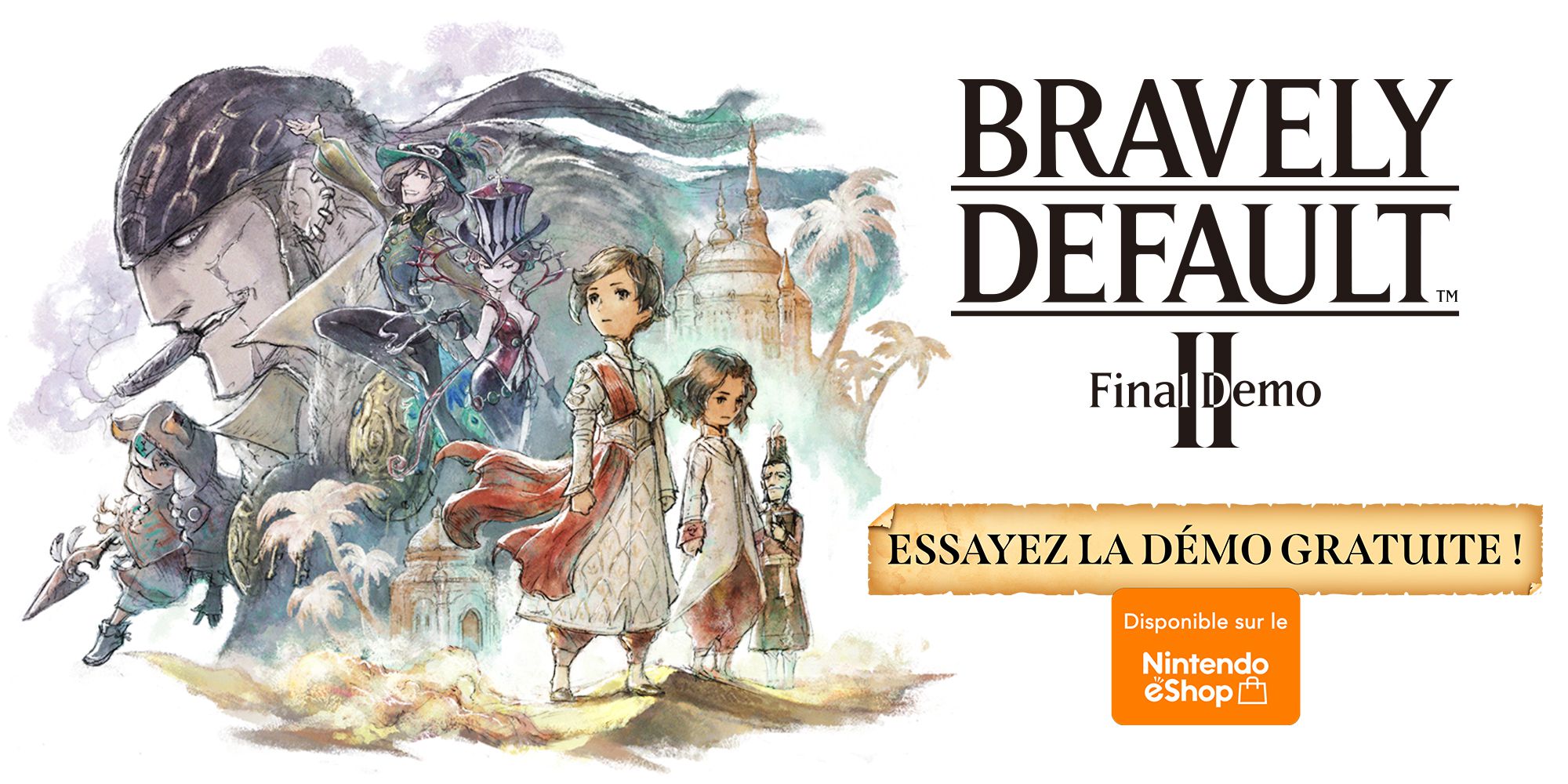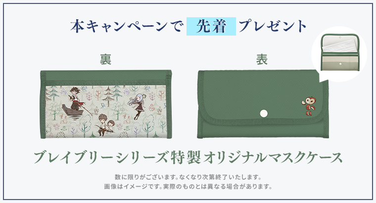En parlant d’offre, en achetant le jeu sur le Square Enix e-STORE ainsi qu’un ou des produits dérivés Bravely Default II pour 3 000 yens, un étui spécial avec un masque de la série Bravely sera offert, le tout avec un dessous de verre et un set de table contenant des illustrations spéciales du character designer Naoki Ikushima / ikusy. La boutique propose un guide officiel, un artbook officiel, un support en acrylique avec les protagonistes, un dessous de verre et un verre.