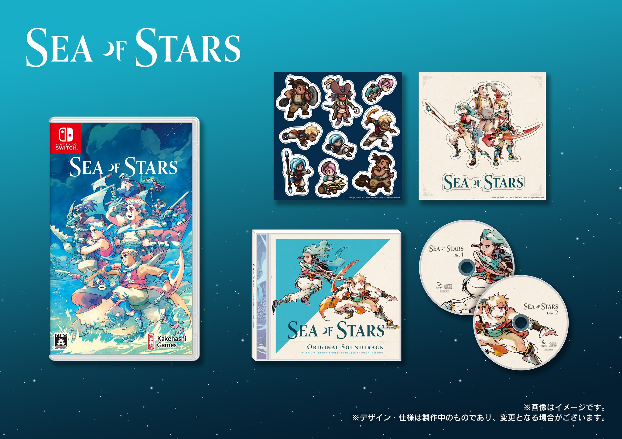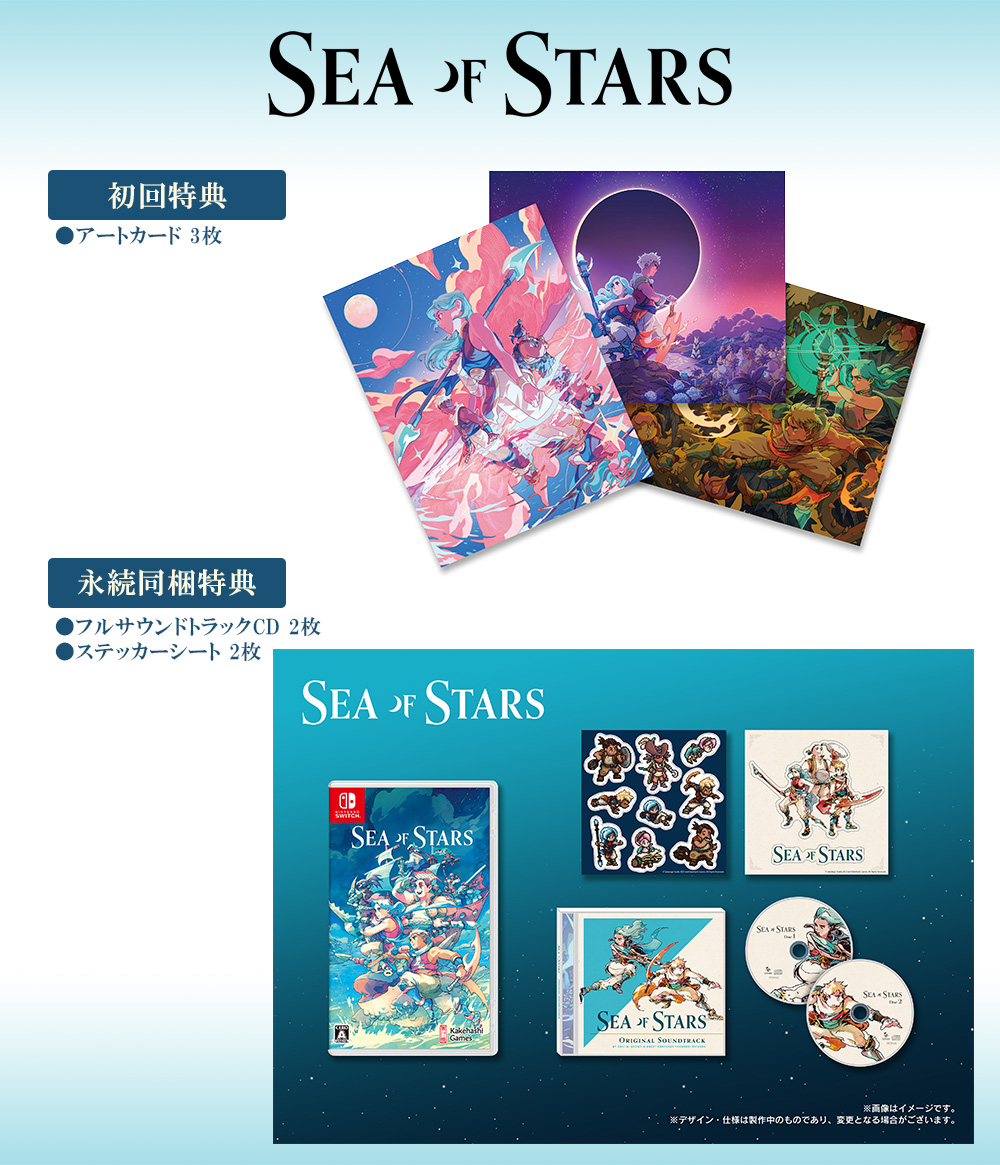 Kakehashi Games, qui édite Sea of Stars au Japon, proposera ce 7 décembre 2023 une édition physique japonaise sur Switch. Cette édition physique coûte 5 980 yens et comprendra, en plus du jeu, la bande originale sur deux disques (le troisième disque proposé en streaming et en téléchargement ne sera pas inclus). L’édition physique japonaise sera accompagnée de deux feuilles d’autocollants et de trois cartes illustrées en guise de bonus de précommande. D’autres bonus exclusifs seront offerts chez ebten et différentes boutiques qui sont listées sur le site de Kakehashi Games. Il est encore possible de précommander l’édition physique sur la version japonaise d’Amazon. Si nous en parlons, c’est aussi parce que la version japonaise de Sea of Stars comprend bien toutes les langues (français, anglais, espagnol, allemand, portugais, coréen, russe et chinois (traditionnel et simplifié) en plus du japonais), ce qui sera donc aussi le cas de l’édition physique.
