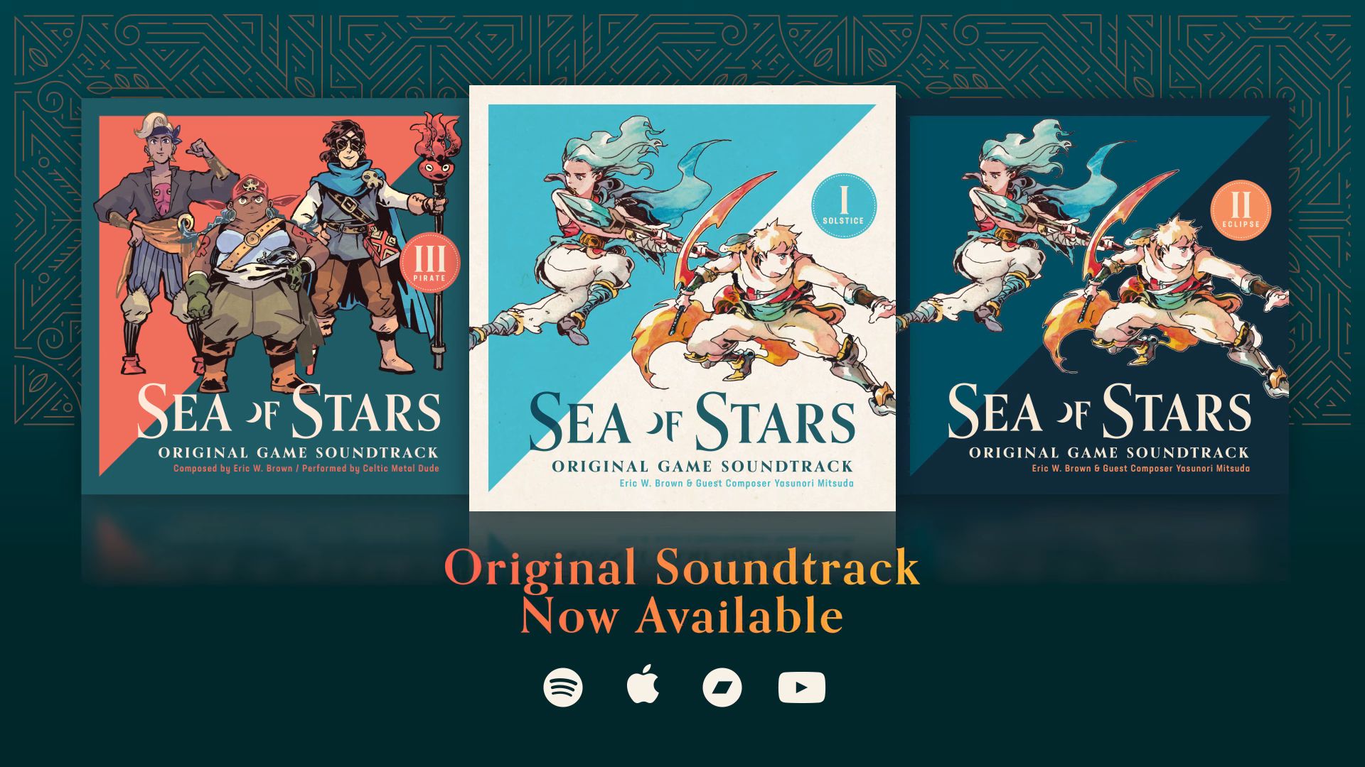 Jusque-là proposée uniquement sur Steam par Sabotage Studio, la bande originale complète du RPG Sea of Stars, qui est aussi la préquelle de The Messenger, est désormais disponible depuis ce 1er décembre 2023 en streaming et en téléchargement sur Bandcamp, Apple Music (disque 1 / disque 2 / disque 3), YouTube (disque 1 / disque 2 / disque 3) et Spotify via le label Magic Hammer Music. Pour rappel, quatre musiciens ont travaillé sur les musiques : Eric W. Brown, Yasunori Mitsuda, Vincent Jake Jones et Reece Miller (Celtic Metal Dude). Le premier disque correspond aux pistes du Solstice, le deuxième à l’Éclipse et le troisième aux musiques jouées par les pirates du Bardcore Band. Au total, il y a 206 pistes. À noter que sur Bandcamp, les morceaux de Yasunori Mitsuda ne sont pas inclus pour le moment, mais Magic Hammer Music prévoit de les ajouter dès que possible. Pour en savoir plus sur les musiques, en complément du documentaire très riche en informations diffusé par The Escapist, Sabotage Studio a créé un site spécial entièrement dédié à l’audio du jeu. Nous revenons sur le travail de chaque musicien ainsi que sur l’audio du jeu globalement dans la suite de l’article. À noter que les deux premiers disques seront également inclus au sein d’un album au format CD dans l’édition physique japonaise sur Nintendo Switch disponible ce 7 décembre 2023. Vous retrouverez les informations à ce sujet dans la suite de notre article ou directement à cette adresse.