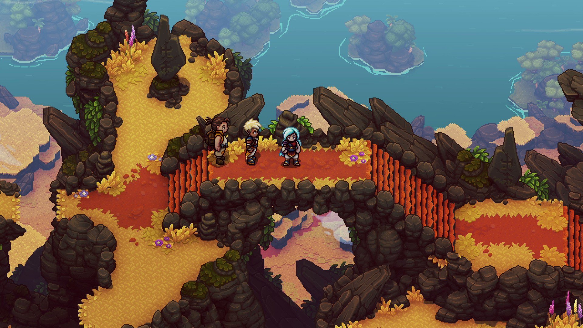 • Navigation sans entrave. Nagez, grimpez, sautez ou longez des corniches alors que vous traversez avec fluidité le monde de Sea of Stars grâce à un système de navigation basé sur l’expertise des jeux de plateforme, qui se démarque des mouvements classiques et restrictifs du genre.