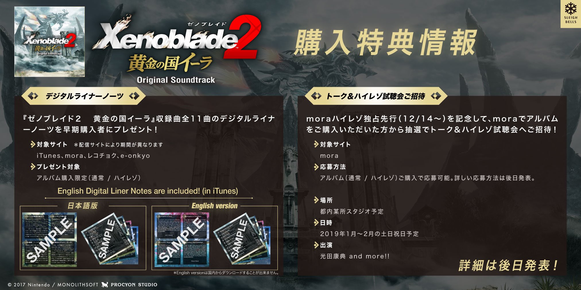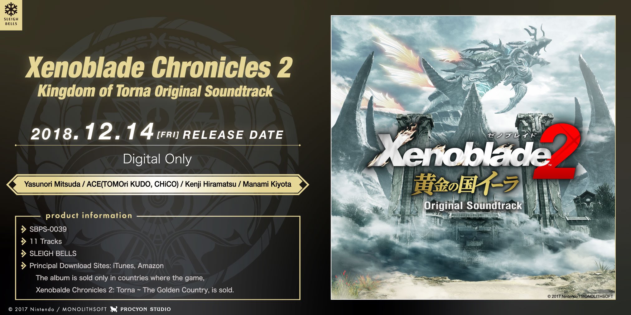 En plus de la nouvelle tenue pour Mythra, Monolith Software et PROCYON STUDIO / SLEIGH BELLS ont annoncé une autre surprise à l’occasion du premier anniversaire de Xenoblade Chronicles 2. En effet, la bande originale de Xenoblade Chronicles 2 : Torna – The Golden Country sera bien commercialisée, et ce très rapidement puisque la sortie de l’album est prévu pour le 14 décembre prochain mondialement. Cependant, contrairement à la bande originale du jeu principal (voir notre article), la bande originale sera vendue exclusivement en version dématérialisée sur iTunes, Amazon, mora, RecoChoku, animelo mix et Google Play Music pour la version 44.1 kHz / 16 bit, et uniquement sur mora, e-onkyo music, RecoChoku et music.jp pour la version 96 kHz / 24 bit.