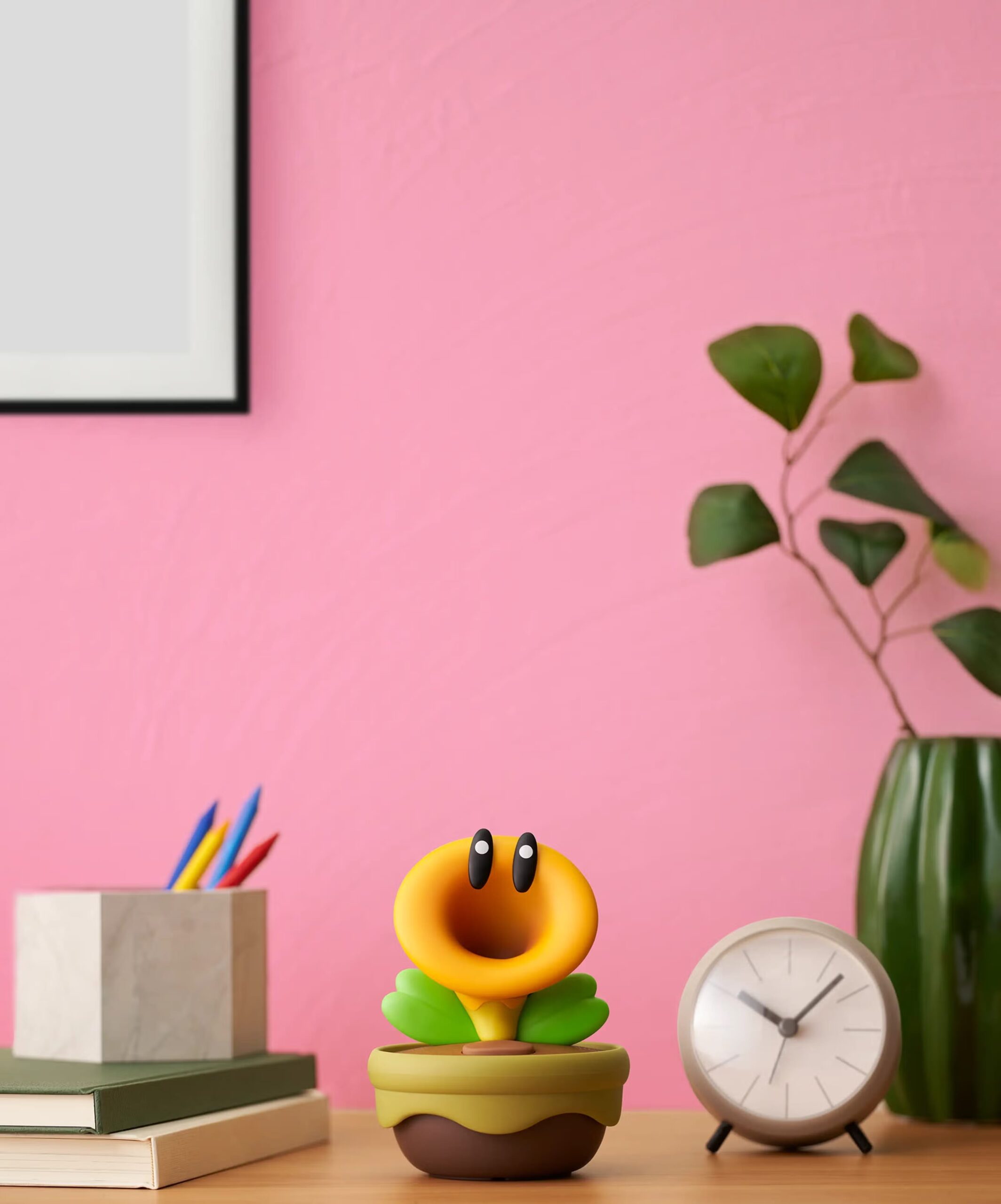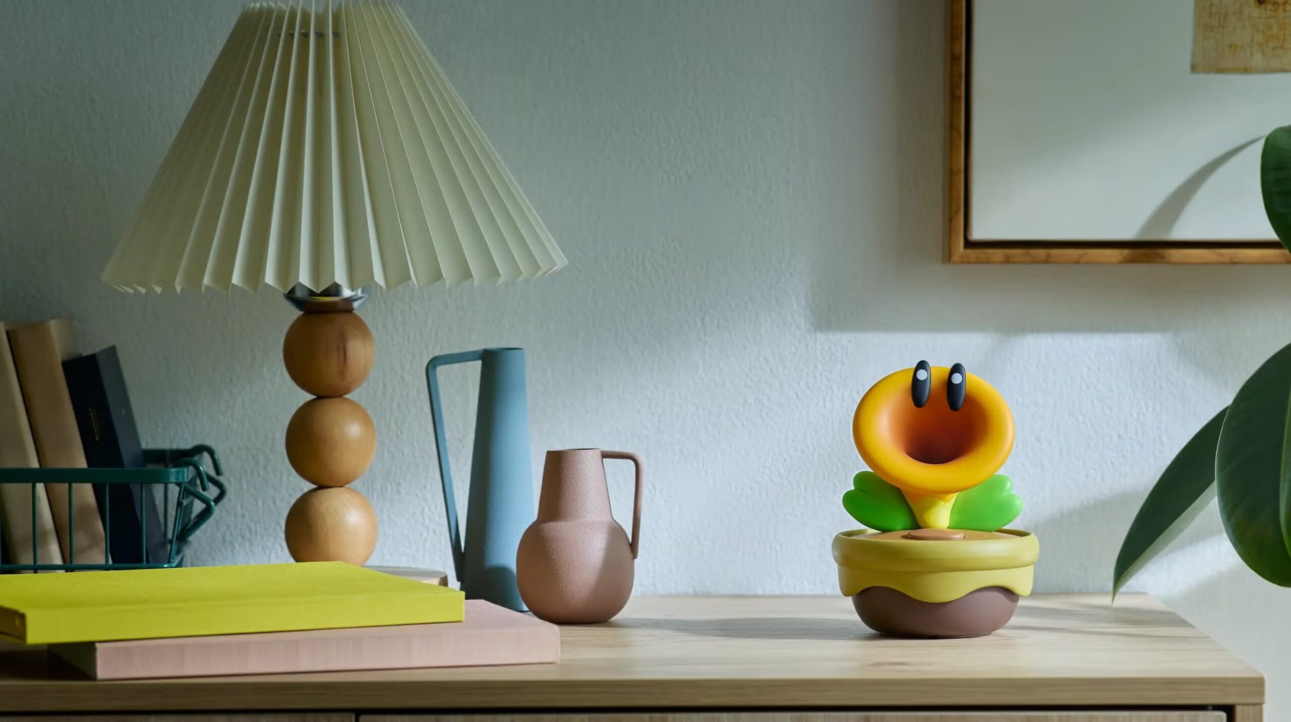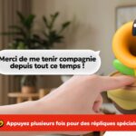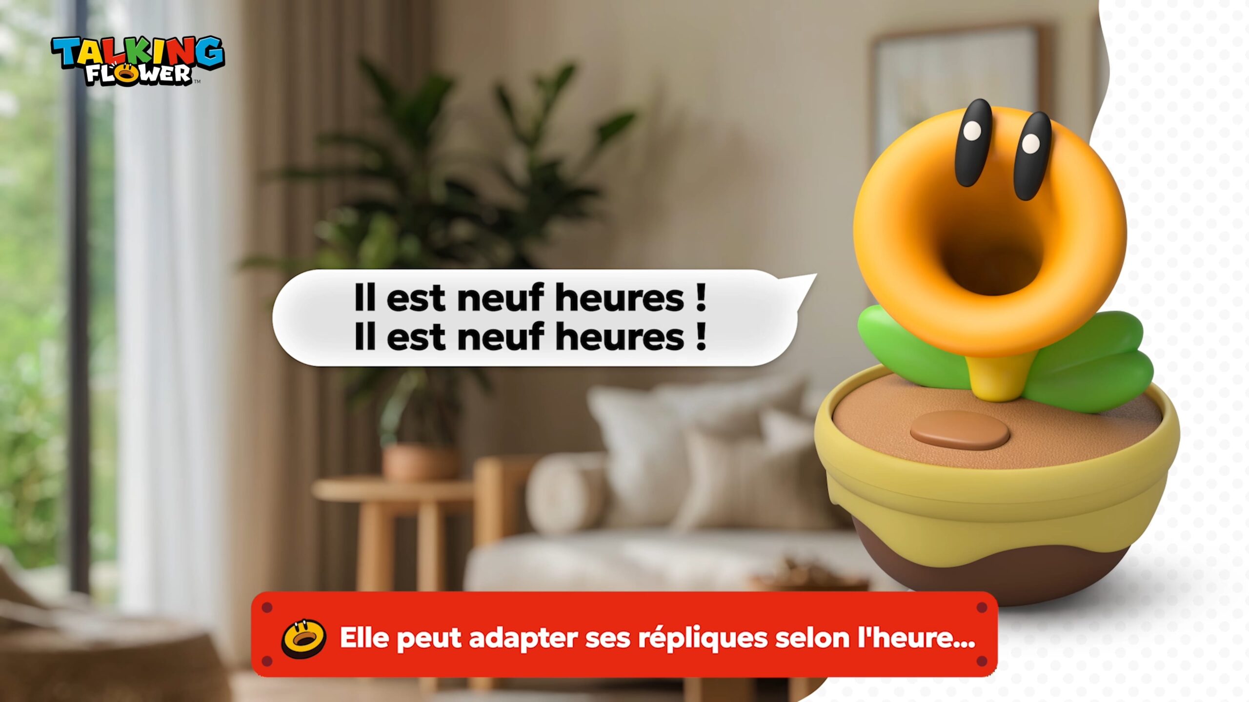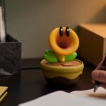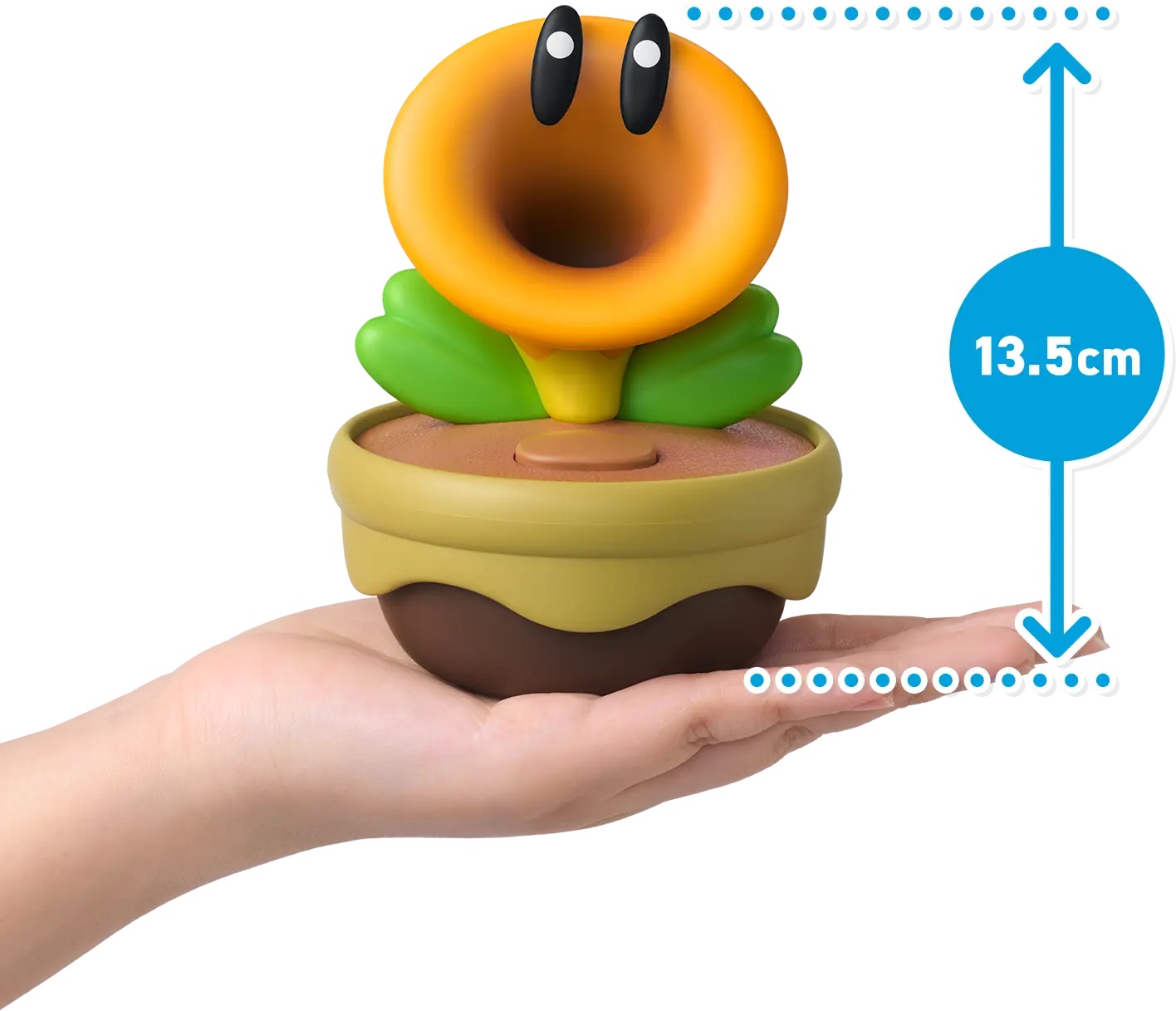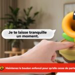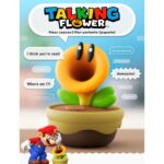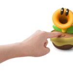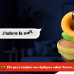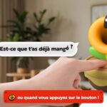 Pour que cette réplique de fleur cancan, il faudra utiliser des piles. On pourra la laisser s’exprimer quand elle en a envie, ou appuyer sur le bouton pour la faire parler. Si l’on appuie plusieurs fois, elle pourra dire une réplique spéciale. Il sera possible de paramétrer l’objet pour qu’il nous salue au réveil ou nous souhaite bonne nuit. La fleur cancan commentera aussi différents moments de la journée, pourra ressentir la température, nous dire quand il faudra changer ses piles, ainsi que dire l’heure. En maintenant le bouton enfoncé, elle s’exclamera « Je suis une fleur prodiiige ! » et se mettra à jouer de la musique provenant de Super Mario Bros. Wonder. Maintenir le bouton enfoncé permettra aussi à la fleur cancan d’arrêter de parler.