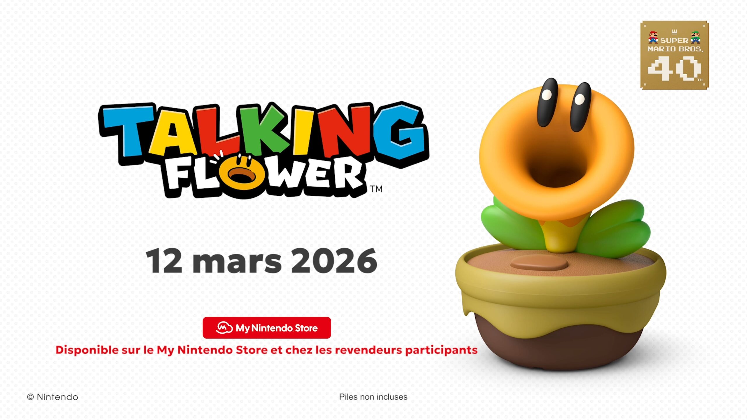 Lors du Nintendo Direct du 12 septembre 2025, en plus de Super Mario Bros. Wonder – Nintendo Switch 2 Edition + Rendez-vous au parc Bellabel, dont la sortie est désormais fixée au 26 mars 2026, une véritable réplique de la fleur cancan du Royaume des Fleurs avait été annoncée. On sait maintenant qu’elle sortira dès le 12 mars prochain. Elle peut être d’ores et déjà précommandée au prix de 29,99 € sur la boutique My Nintendo Store européenne. Elle pourra parler en 11 langues : français, anglais, allemand, espagnol d’Espagne et d’Amérique latine, italien, néerlandais, portugais du Brésil, japonais, chinois et coréen. Nintendo note que la fleur cancan n’interagira pas avec nous et ne répondra pas aux commandes vocales. La vidéo ci-dessous a d’abord été diffusée dans l’application Nintendo Today! sur Android et iOS.