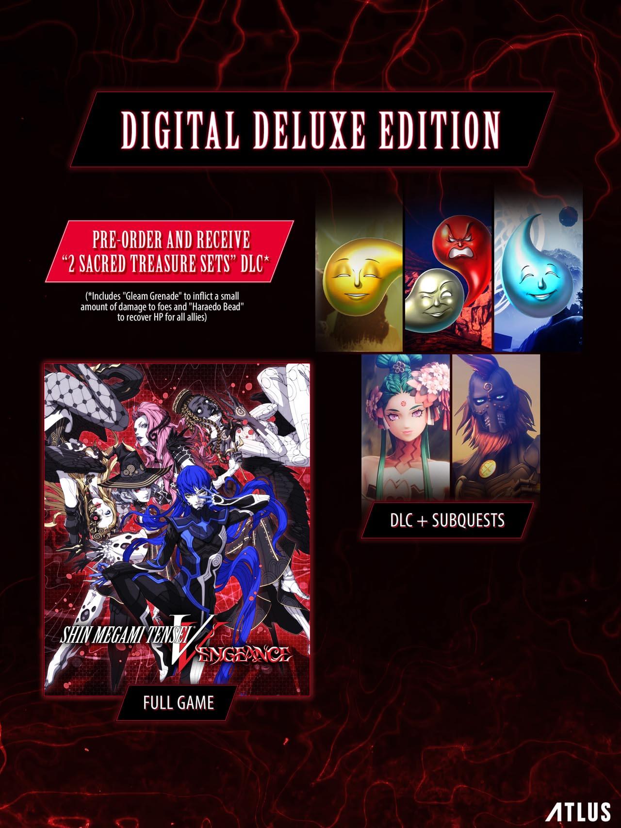 Lorsque le jeu sortira, plusieurs DLC complètement nouveaux seront disponibles. Une édition deluxe en téléchargement sera également disponible, comprenant à la fois le jeu de base et tous les DLC. En plus de DLC permettant de gagner plus facilement des points d’expérience et de l’argent dans le jeu, il y aura deux DLC qui permettront de rencontrer et recruter deux démons supplémentaires. Le premier démon supplémentaire qui pourra être rencontré et recruté via un DLC est Dagda de Shin Megami Tensei IV : Final. Lorsque le protagoniste part enquêter sur une réaction mystérieuse, il rencontre Danu, la déesse mère de la terre, qui prétend venir ‘un monde qui existe dans un autre univers. Danu est apparemment à la recherche de son fils, Dagda. Le Nahobino part alors à la recherche de Dagda avec Danu. En terminant le jeu, Dagda pourra devenir un allié et la fusion avec lui sera débloquée. Le DLC de Dagda se nomme Sainte volonté et dissidence profane.