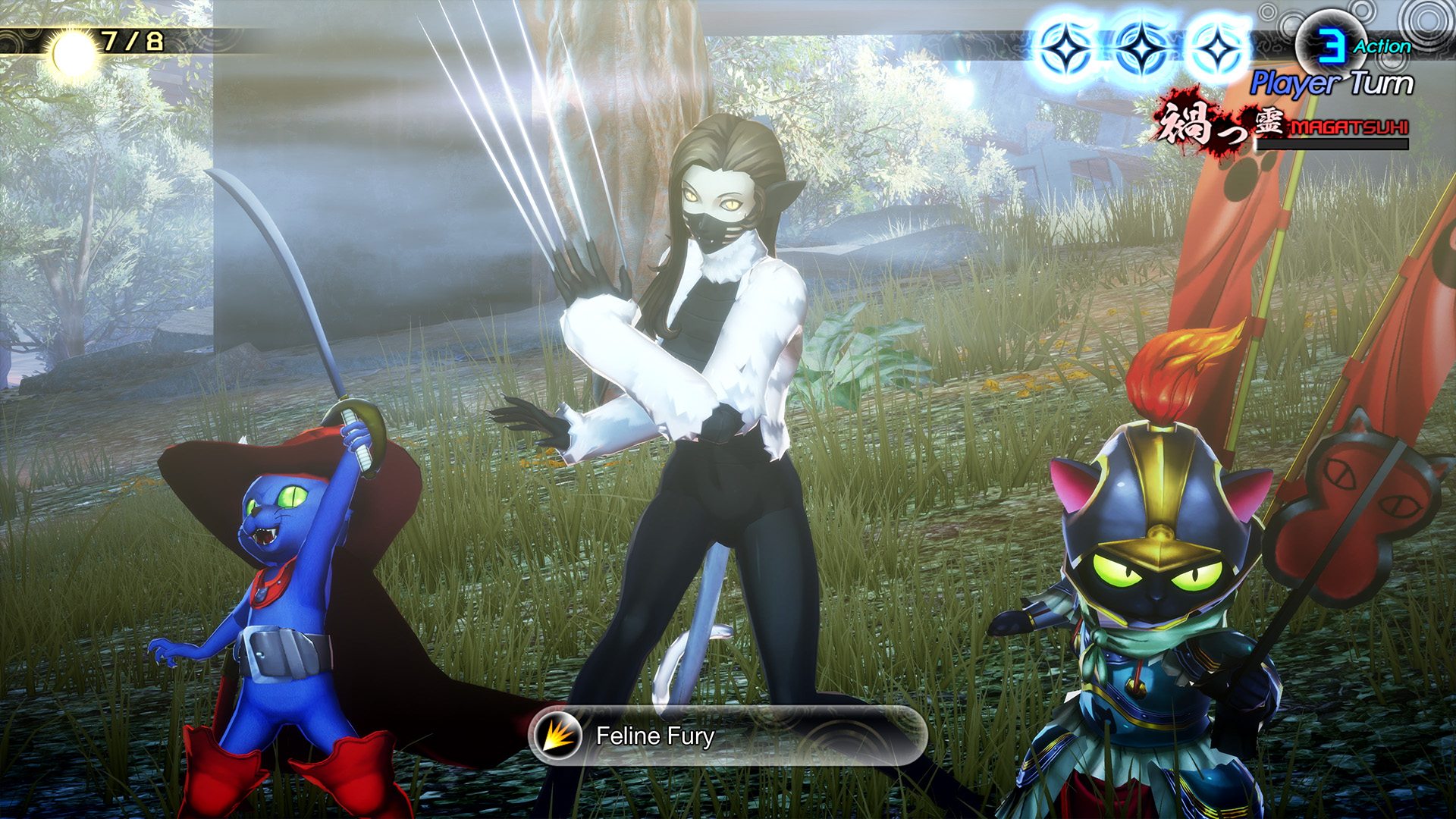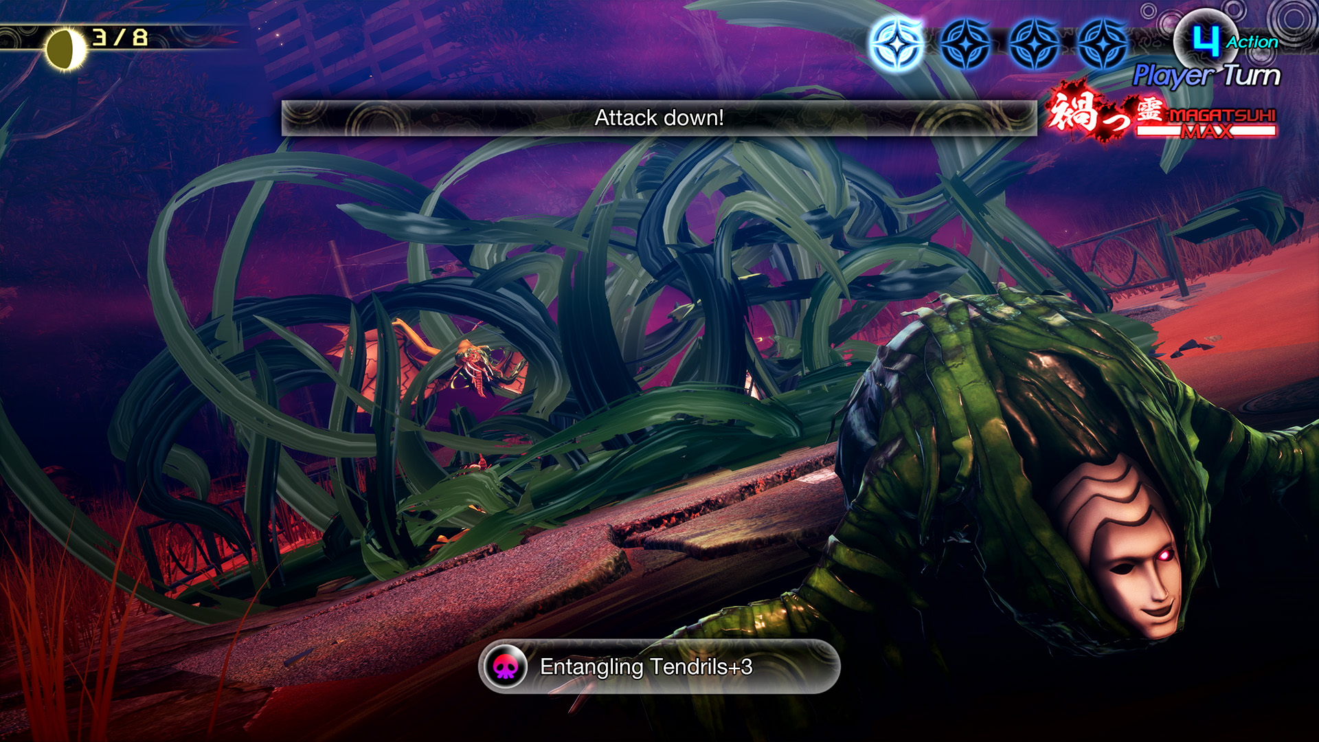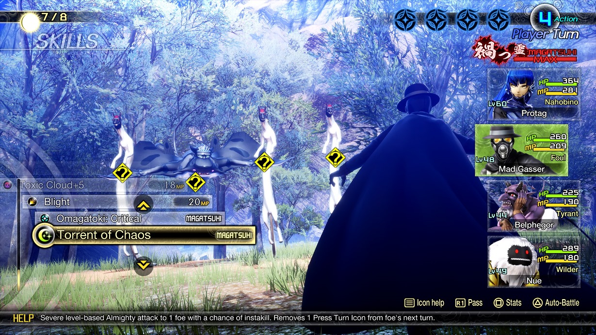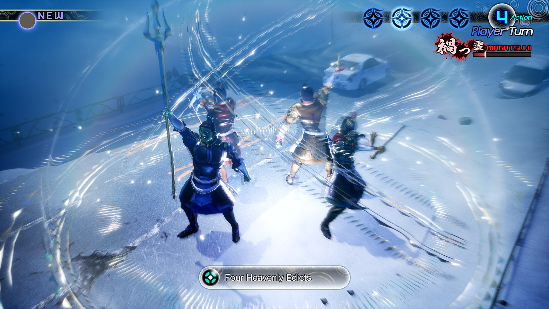 Au fur et à mesure du combat, nos actions rempliront la jauge Magatsuhi. Une fois cette jauge remplie, on pourra utiliser une compétence Magatsuhi spéciale. Les compétences Magatsuhi ont une variété d’effets, comme endommager les ennemis, renforcer l’équipe et la guérir. Dans Vengeance, il y aura plus de 50 compétences Magatsuhi, dont plus de 20 complètement inédites qui ont été ajoutées spécialement à cette version, comme celles que seuls certains démons pourront utiliser. Chaque compétence permet d’utiliser de puissantes capacités, il faudra donc garder l’œil ouvert pour les activer en combat. En plus des compétences Magatsuhi introduites dans Shin Megami Tensei V, il existe désormais des compétences qui pourront être activées lorsqu’il existe une forte relation mythologique entre deux démons ou lorsqu’il y a des démons du même alignement dans le groupe pour Vengeance.