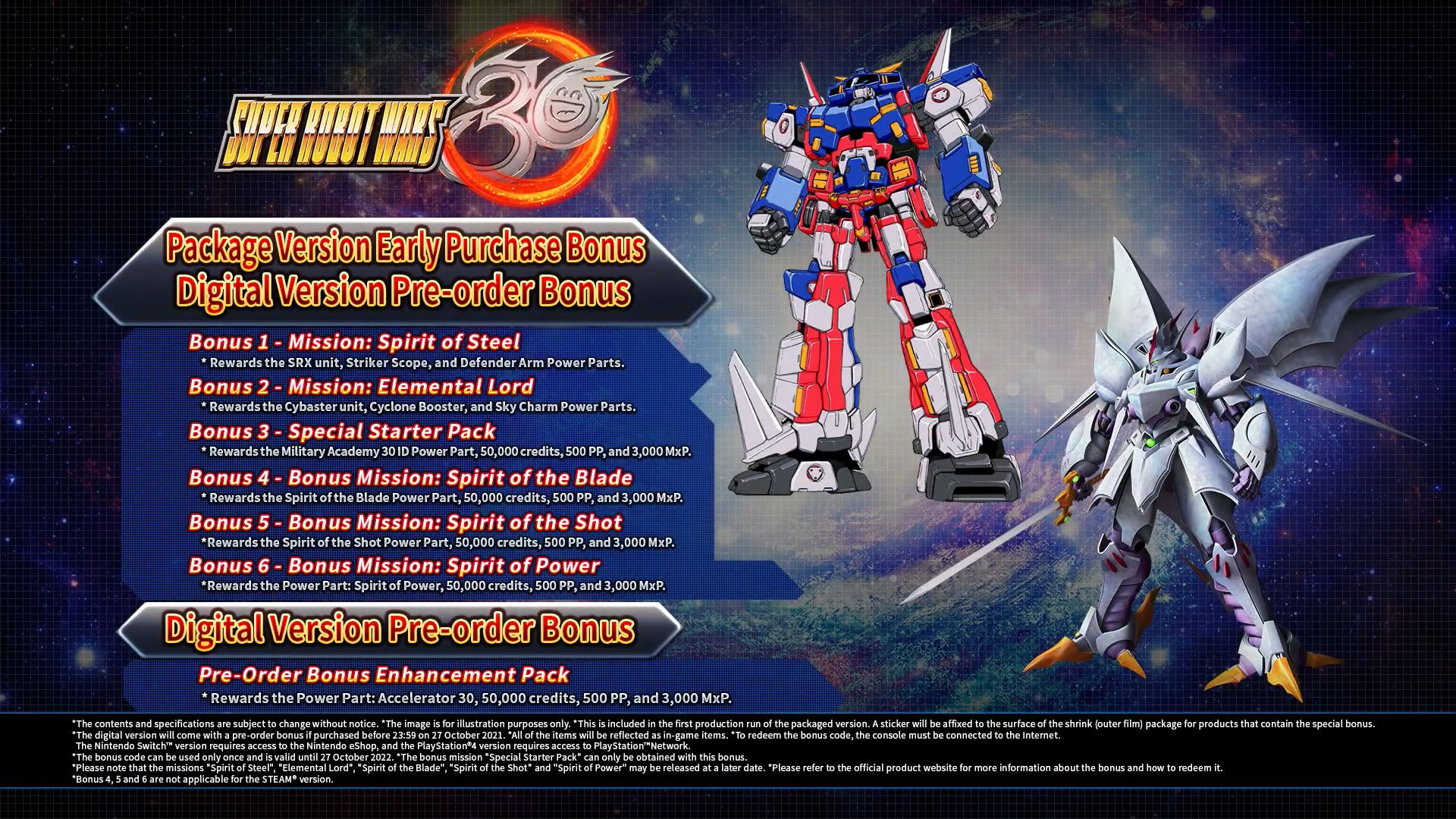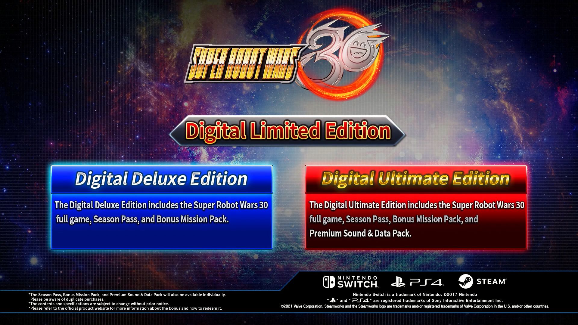 Super Robot Wars 30 sera disponible précisément le 28 octobre prochain sur Nintendo Switch, PlayStation 4 et PC via Steam au Japon sous la forme de plusieurs éditions listées dans la suite de cet article. Bandai Namco Entertainment Asia sortira le jeu à la même date en Asie avec des sous-titres en anglais. Super Robot Wars 30 sortira aussi en Europe et aux États-Unis, mais uniquement sur PC. Les précommandes ont déjà débuté sur Steam, la version standard coûtant 49,99 €, la Digital Deluxe Edition 74,99 € et l’Ultimate Edition 94,99 €.