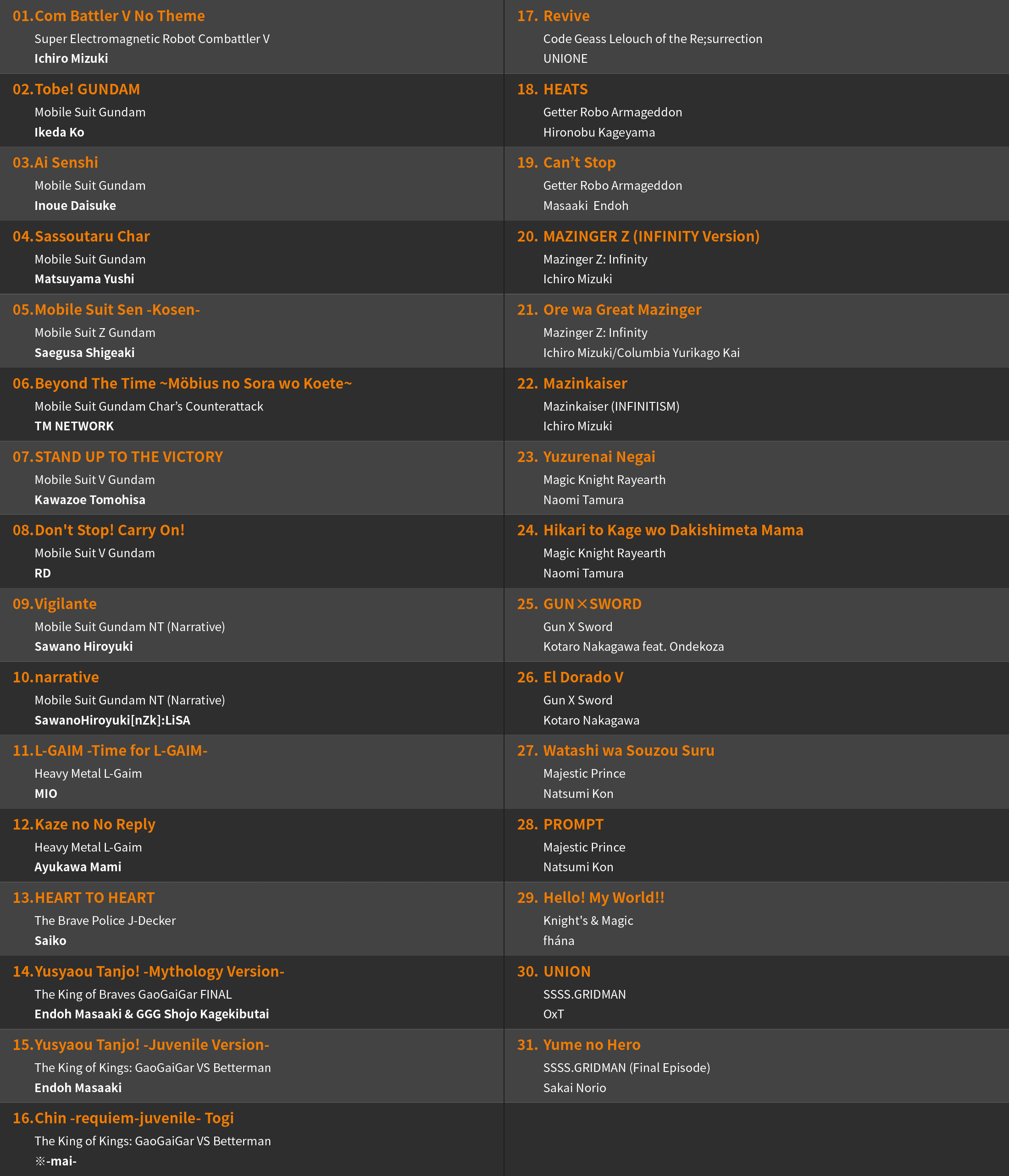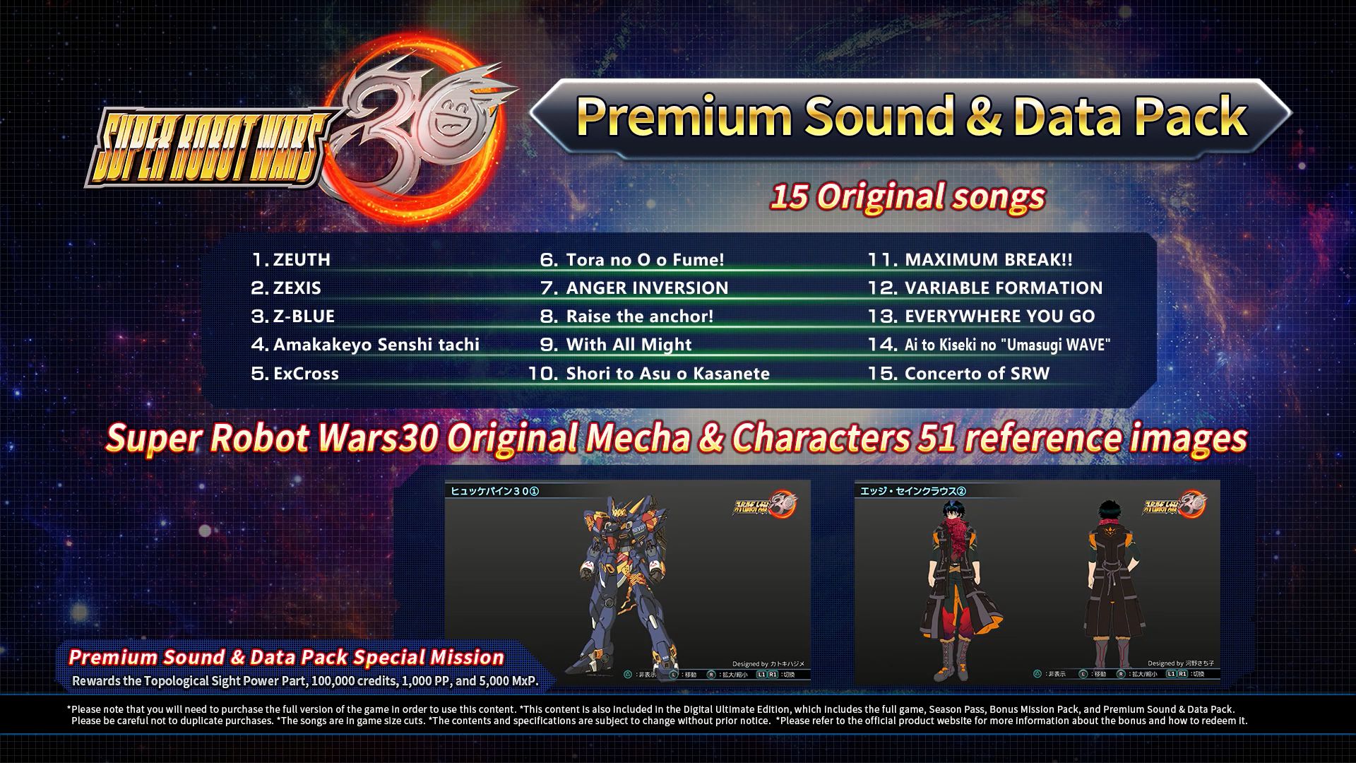 Note : selon l’un des producteurs du jeu, Shohei Mogami, les DLC qui ajouteront les grandes séries (Voltes V, Sakura Wars, Iron-Blooded Orphans, Ultraman) contiendront aussi des versions instrumentales des plus célèbres chansons thèmes figurant dans les mêmes séries. Cependant, certainement en raison des droits, les versions vocales ne seront pas incluses, même dans le pack de DLC Premium Sound. Il y aura toutefois un moyen de contourner le problème : se servir du DLC Custom BGM permettant de mettre des morceaux de notre choix dans le jeu, mais uniquement pour les versions PlayStation 4 et PC.