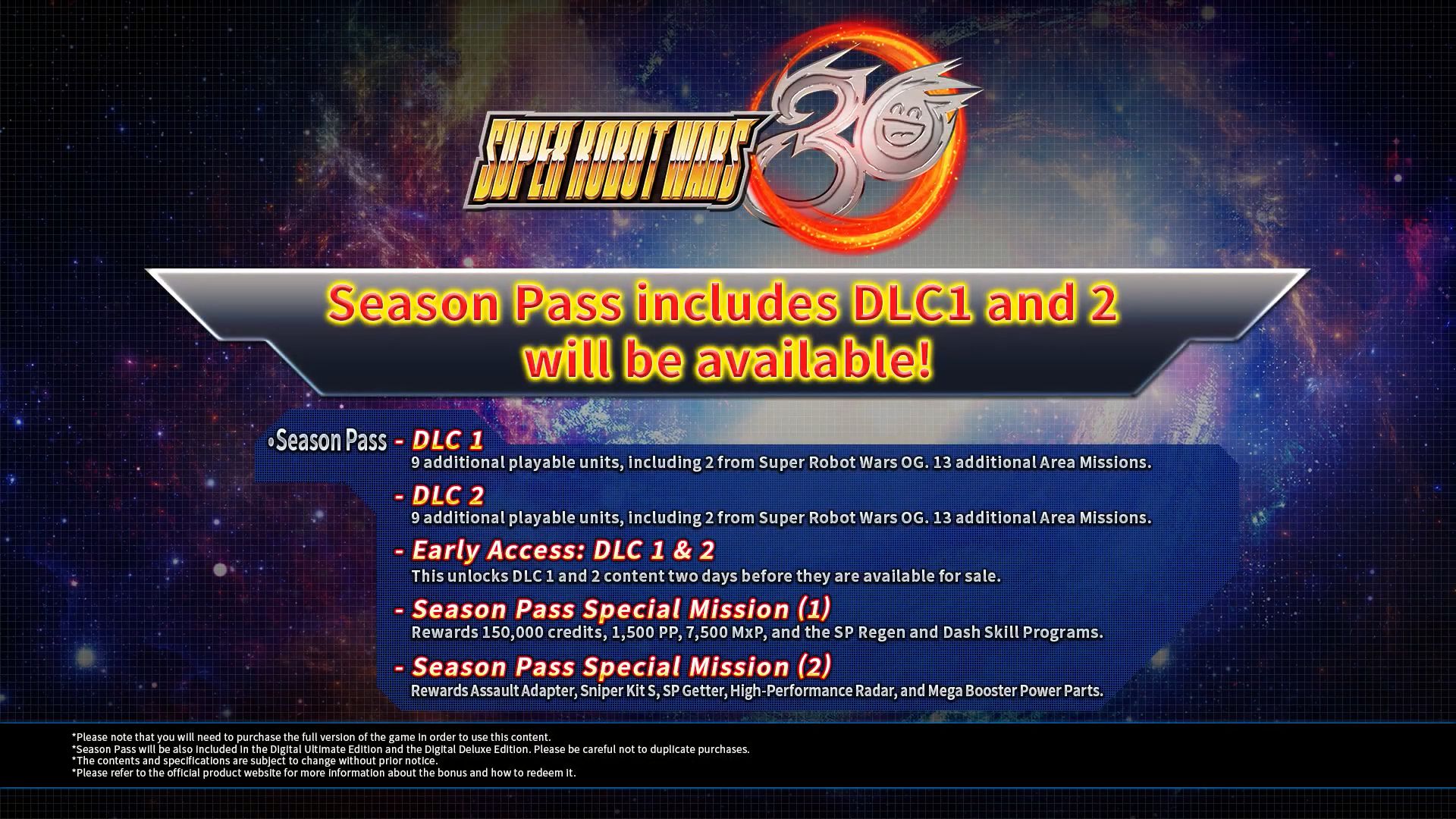 Mise à jour : le deuxième DLC sera disponible le 23 décembre (le 21 décembre pour les personnes possédant le Season Pass). La mise à jour qui le rendra accessible comprendra aussi Didarion (ou Deedalion), le protagoniste du jeu mobile Super Robot Wars DD, dans le cadre d’un crossover, puisque Edge Sainklaus apparaît aussi avec son Huckebein 30 dans DD. Didarion rejoindra l’équipe après avoir terminé la mission bonus Dimension Driver. Il y aura aussi le Super Expert Mode qui augmentera les limites des améliorations (par 5) et le niveau des personnages (de 99 à 200) ainsi que les stats (de 400 à 999). Concernant le DLC, il y aura la mission Another Battlefield et la mission commémorative Congratulations on 19 Million célébrant les 19 millions d’exemplaires vendus en totalisant les ventes de tous les jeux de la série dans le monde.