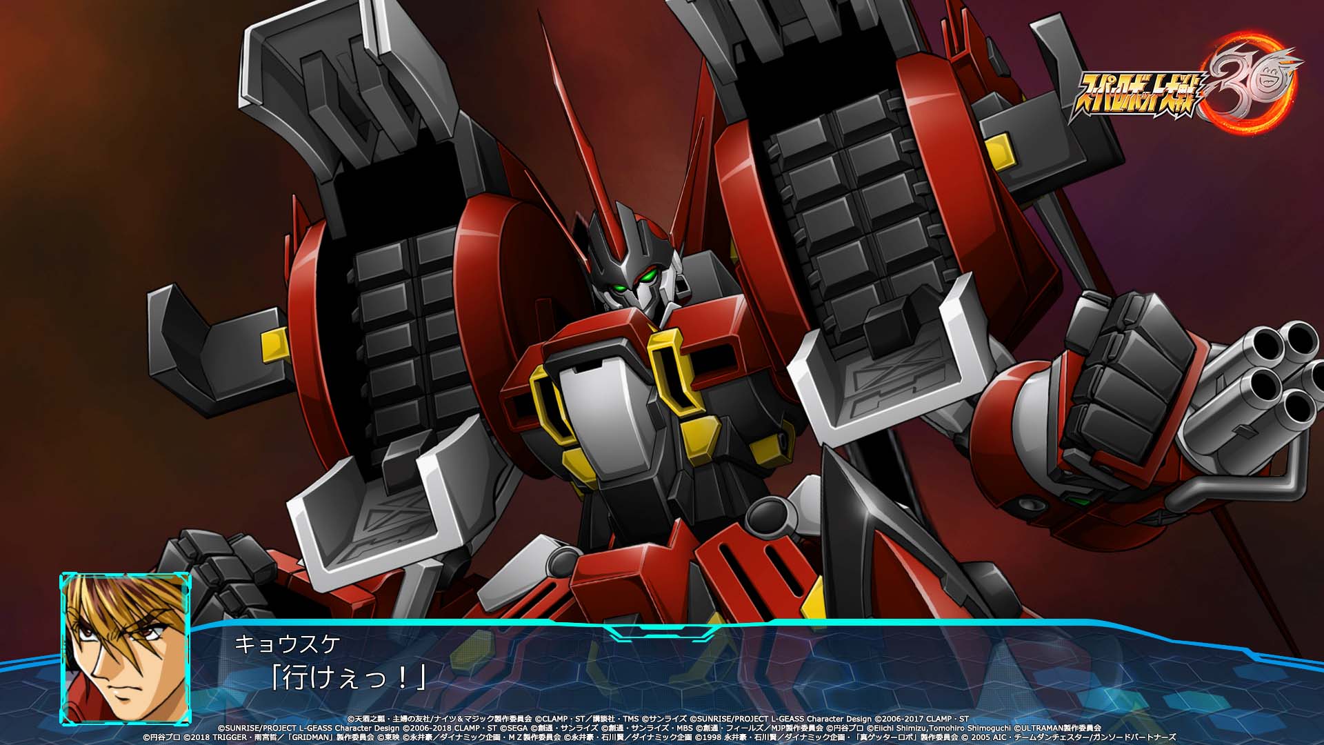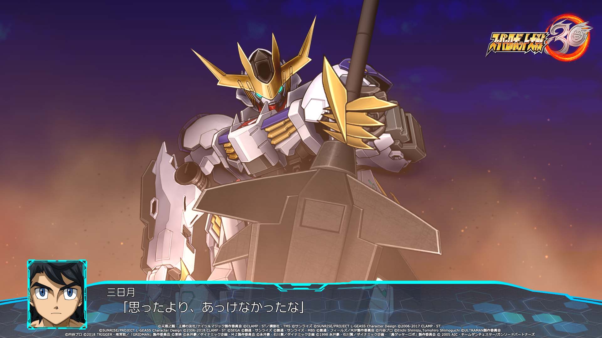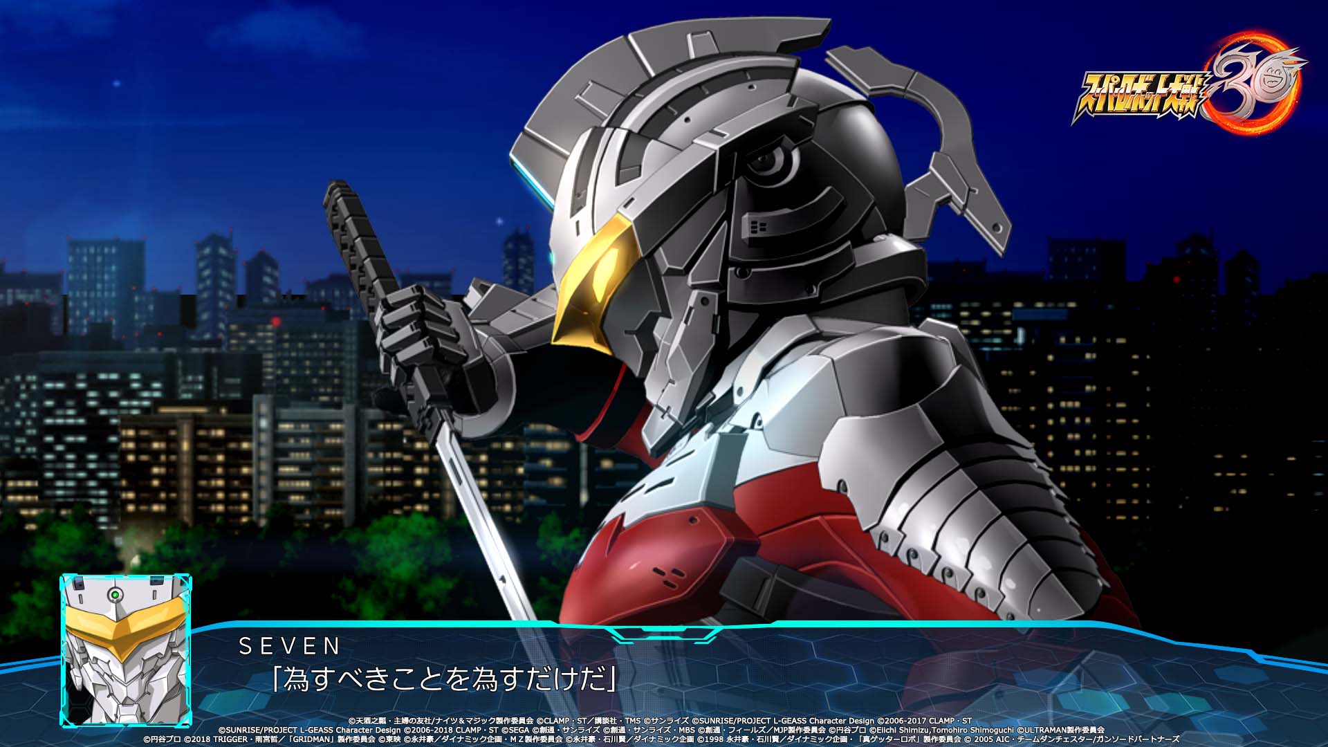 Les deux protagonistes auront également droit à leur propre chanson thème. Pour Edge Sainklaus, il s’agira de Sasurai no Yaiba ~Sleeping beast~ par Masaaki Endoh (JAM Project). Pour Az Sainklaus, ce sera Divine beast par M.A.R.Y. 4 TUNES. Et ce n’est pas tout, la chanson thème du jeu sera interprétée par le groupe légendaire JAM Project : Drei Kreuz ~Hagane no Survivor~. Elle a d’ailleurs été jouée au cours de l’émission Super Robot Wars Hagane no Chou Kanshasai 2021 ce 11 juillet. Le single avec la version longue de la chanson sortira le 22 décembre prochain au Japon. Autre artiste mis en avant dans l’émission et dans les vidéos promotionnelles : le très célèbre mangaka Go Nagai, qui s’est occupé du design du « 30 » du logo du jeu :