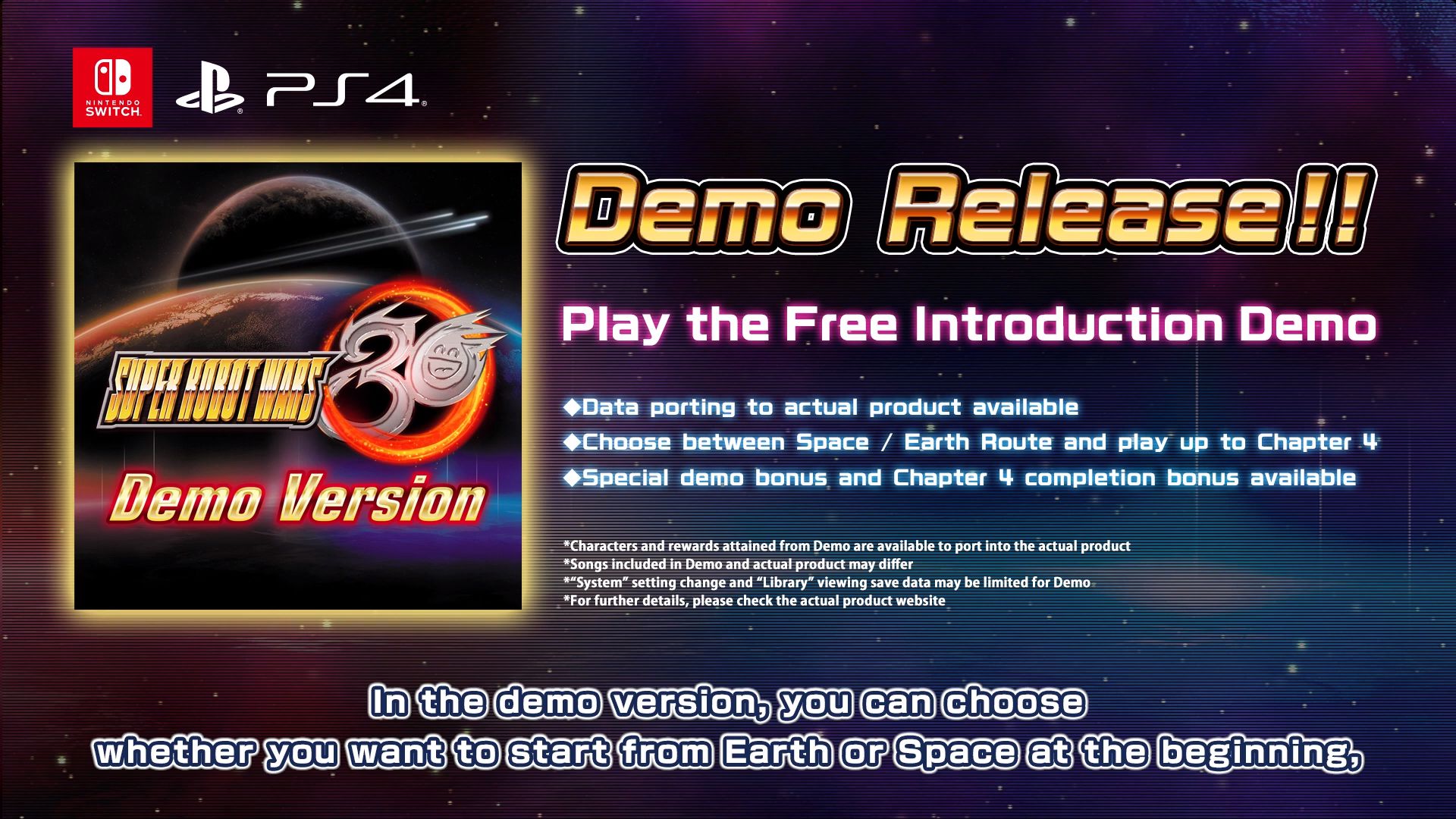 Il y a quelques jours, Bandai Namco et B.B. Studio ont sorti une démo gratuite du jeu sur Switch et PS4 au Japon et en Asie (ce qui permet donc de profiter de la traduction anglaise). Dans cette démo, il est possible de choisir entre les routes de l’Espace et de la Terre, puis de jouer jusqu’au chapitre 4. Il y a même un bonus si l’on a réussi à terminer le chapitre 4. Les données de sauvegarde pourront ensuite être transférées vers le jeu complet dès qu’il sortira le 28 octobre.