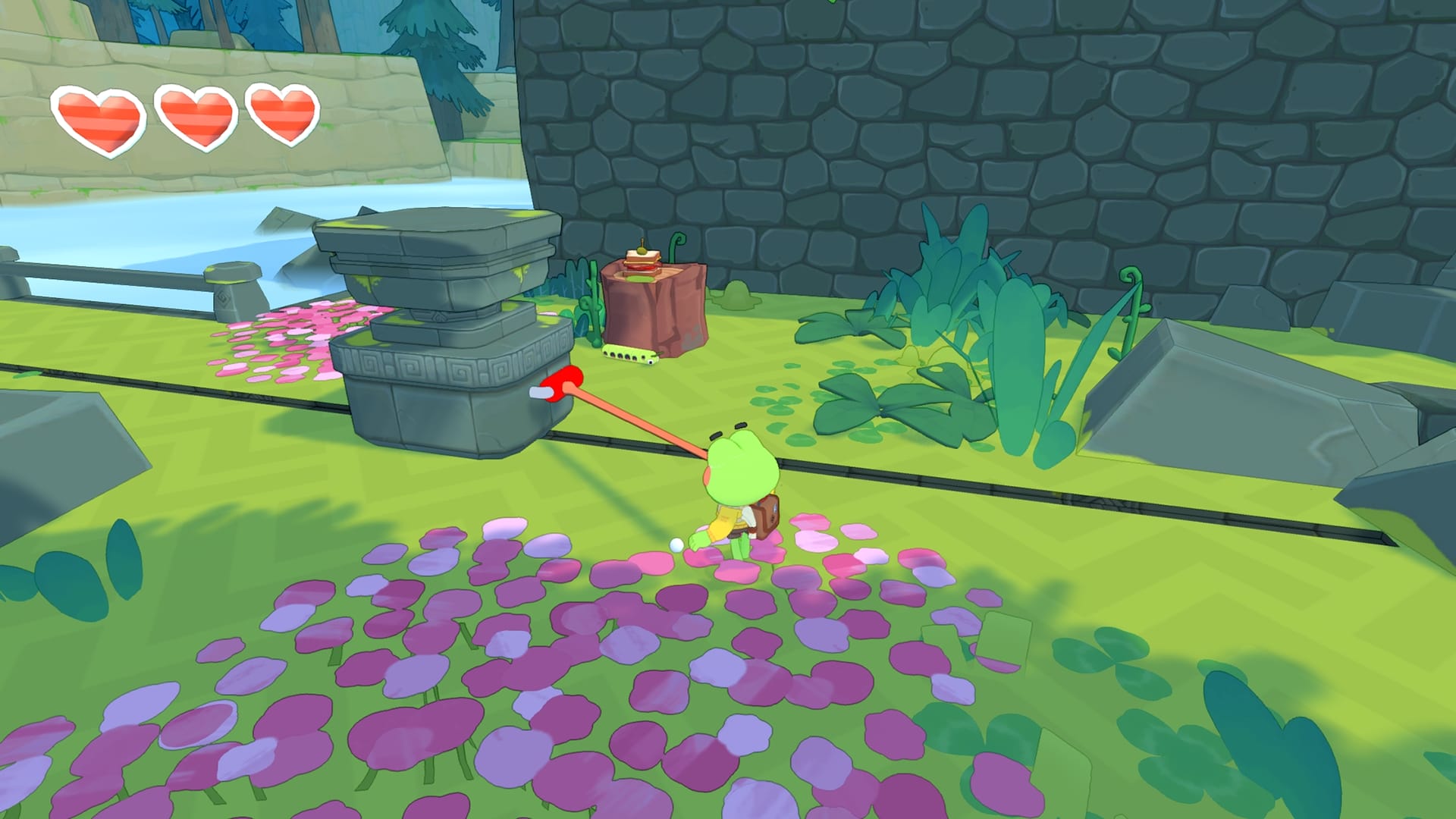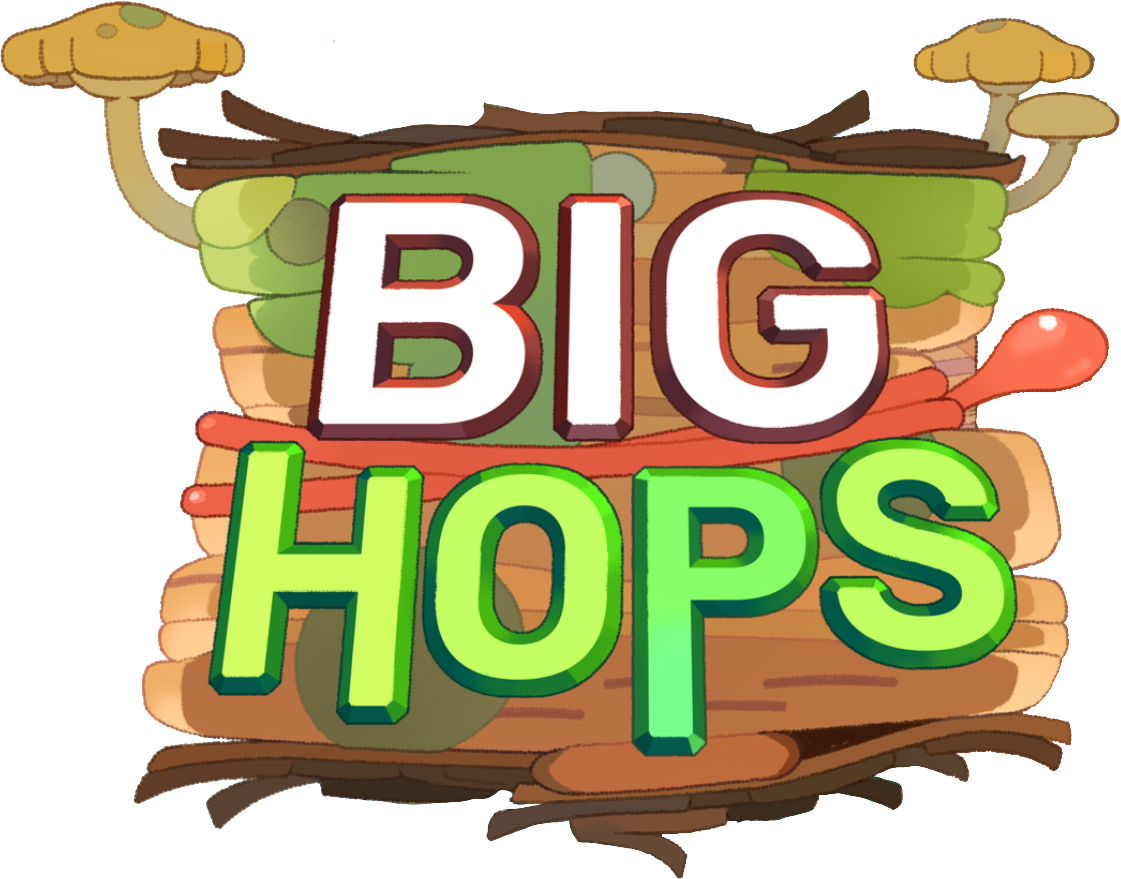 Dans Big Hops, on peut rouler, plonger, sauter accroupi, courir sur les murs, escalader, nager, glisser, marcher sur un fil, se balancer à l’aide d’une barre, glisser sur des rails, voyager en wagonnet et bien plus encore. Luckshot Games y cite ici l’inspiration de Mario, Sonic Adventure, The Legend of Zelda : Breath of the Wild et A Hat in Time. Le studio indique aussi que ce n’est que le moveset de base de Hop, le héros pouvant aller encore plus loin avec des capacités propres aux grenouilles et d’autres façons de tracer différents chemins. La mécanique principale de Big Hops repose sur la langue de grenouille polyvalente de Hop. Celle-ci est le principal moyen d’interaction avec l’environnement. On peut l’utiliser pour attirer des objets vers le protagoniste, se propulser le long des murs et se balancer à toute vitesse. Des éléments comme des portes, des interrupteurs, des bouchons, des ventouses, des fleurs, des lanceurs et des leviers peuvent être actionnés en un clin d’Å“il à l’aide de la langue de Hop. Luckshot Games promet que même après plus de 10 heures de jeu, on découvrira sans cesse de nouvelles interactions loufoques avec la langue du héros.