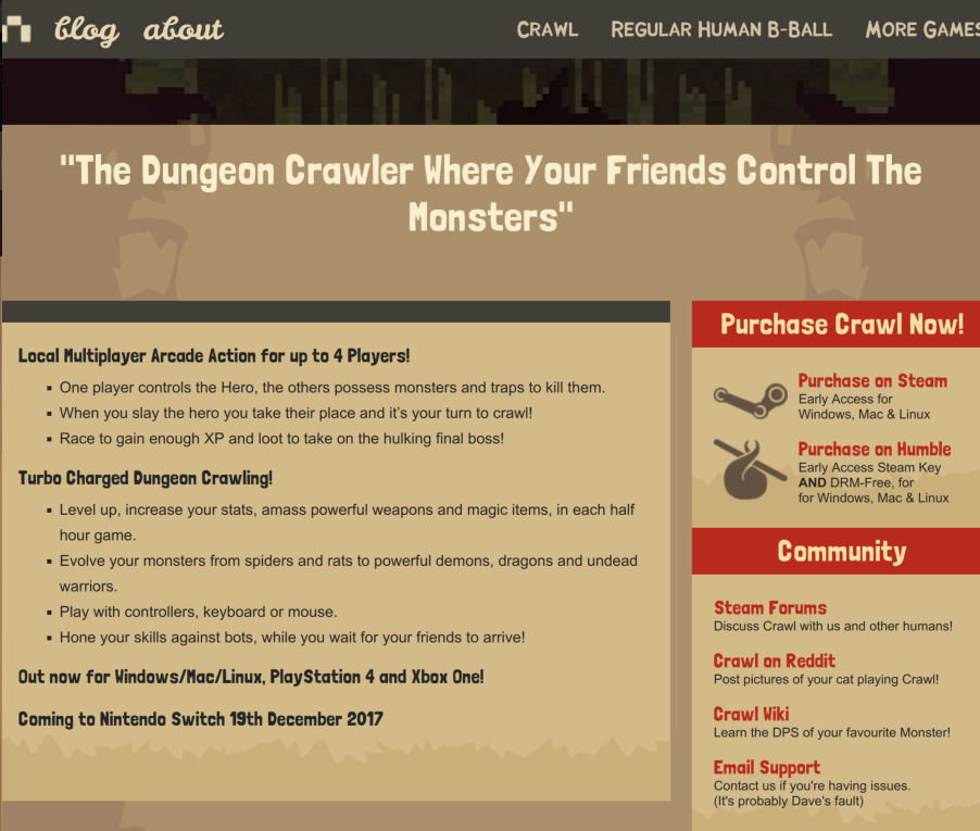 Dungeon crawler arcade au visuel pixélisé mâtiné de nostalgie, Crawl a été annoncé sur l’eShop de la Nintendo Switch pour le 19 décembre prochain par le studio Powerhoof sur son site officiel. Déjà disponible sur PC, Mac, Linux, PlayStation 4 et Xbox One, Crawl se présente sous la forme d’un jeu d’action multijoueur en local jusqu’à quatre participants, où l’un incarne le héros et les autres l’ensemble des monstres. Lorsqu’un ennemi tue le héros, il devient héros lui-même et ainsi de suite jusqu’à atteindre l’antre du boss qui, lui aussi, est contrôlé par les joueurs incarnant les monstres.