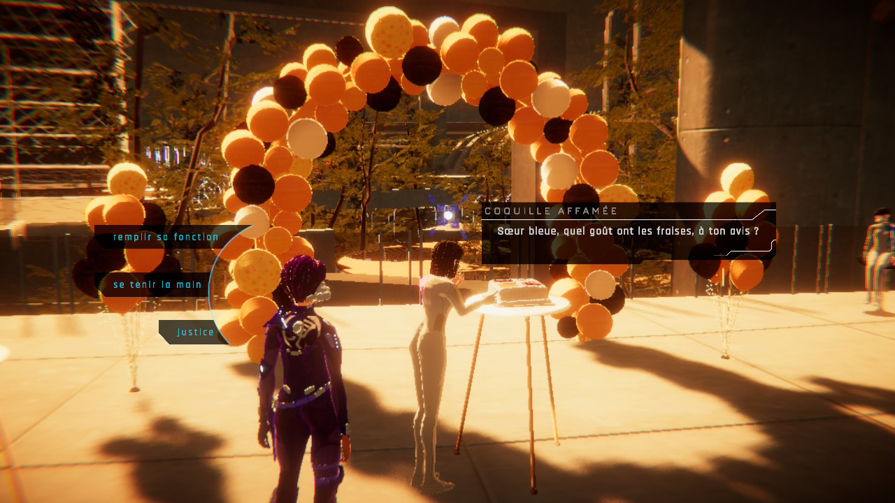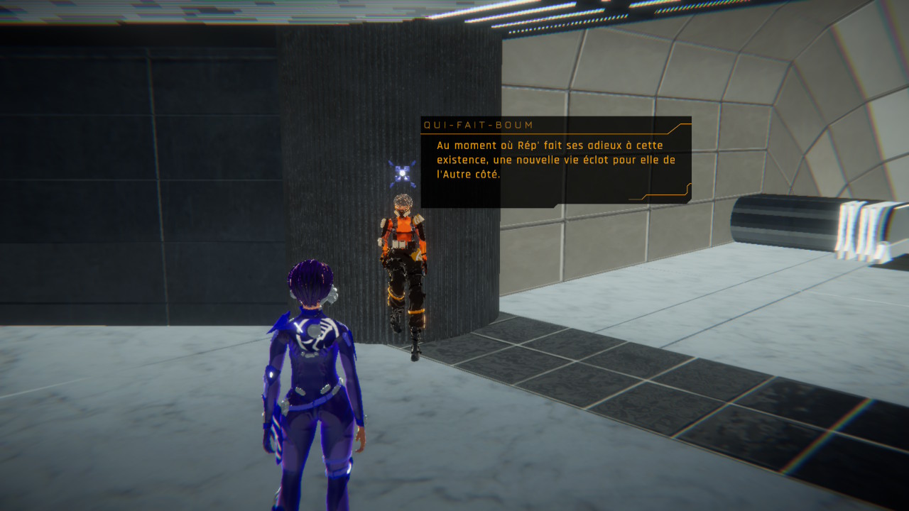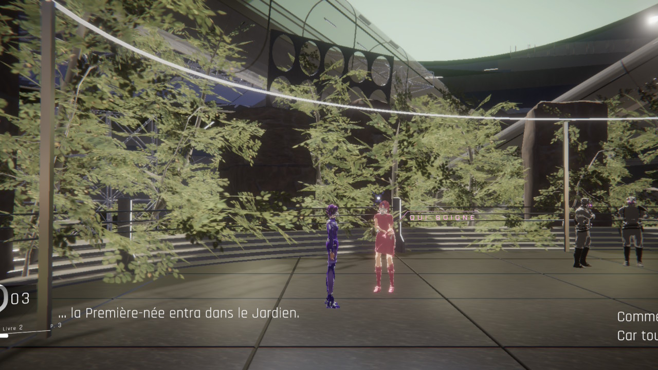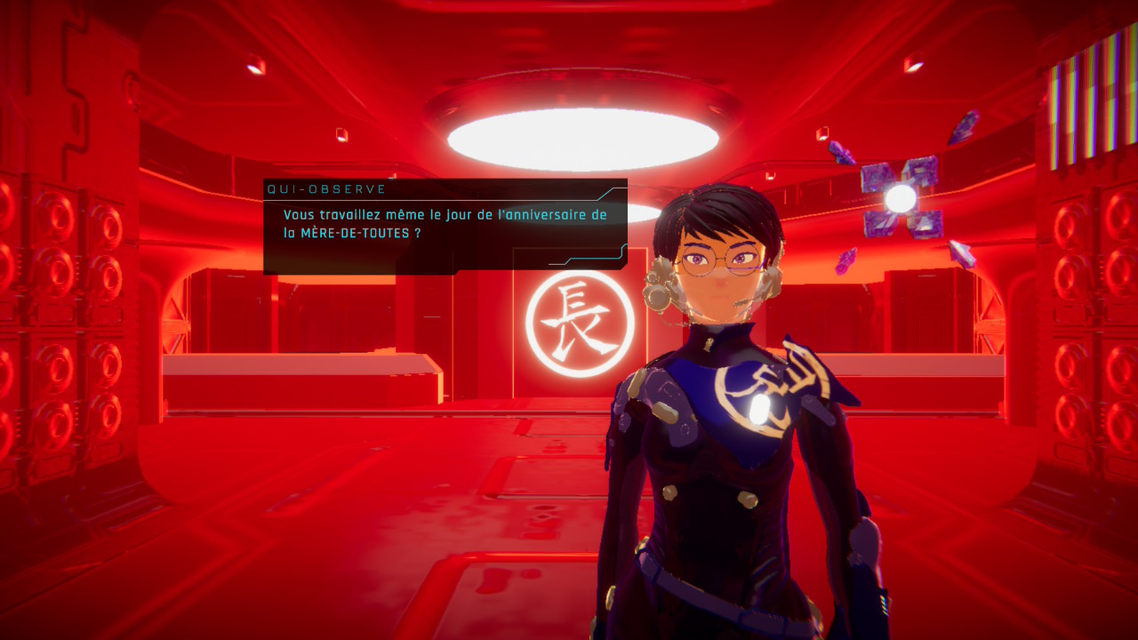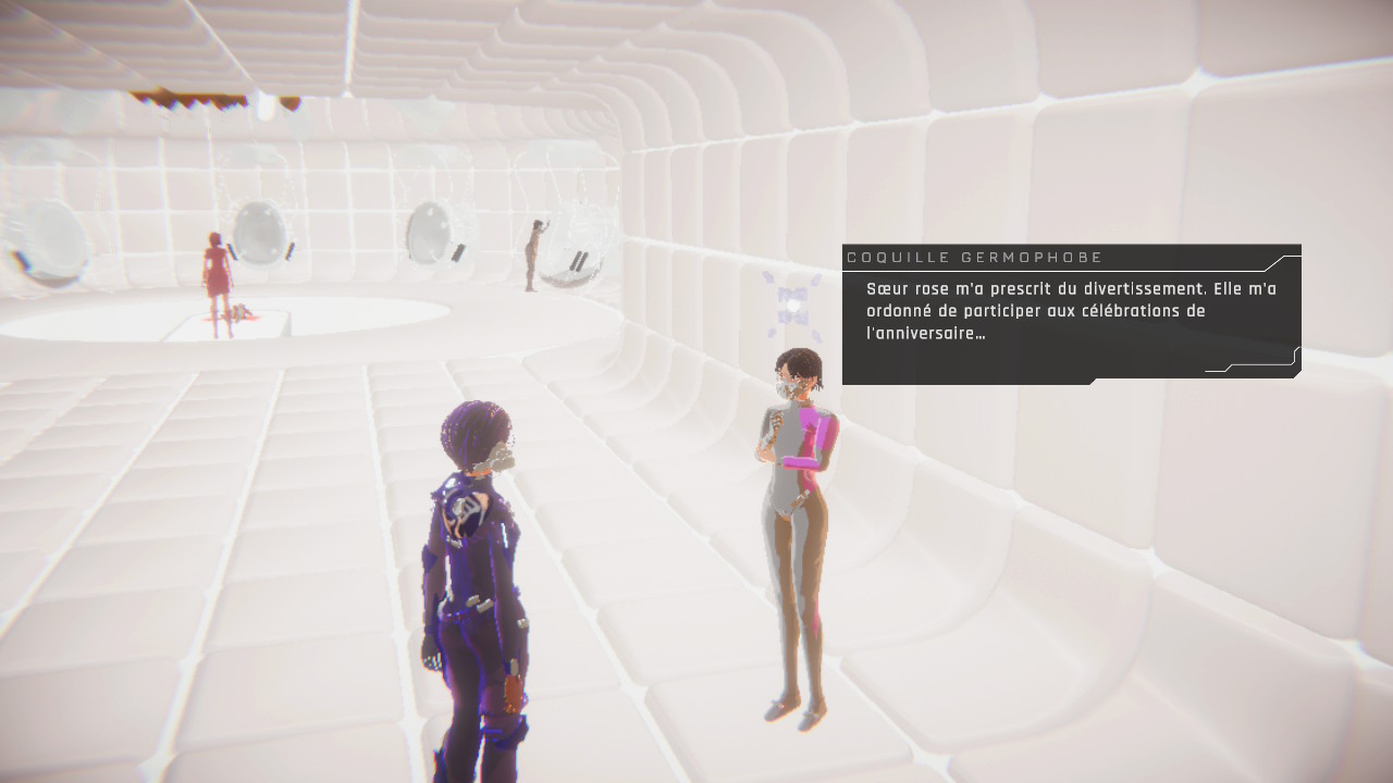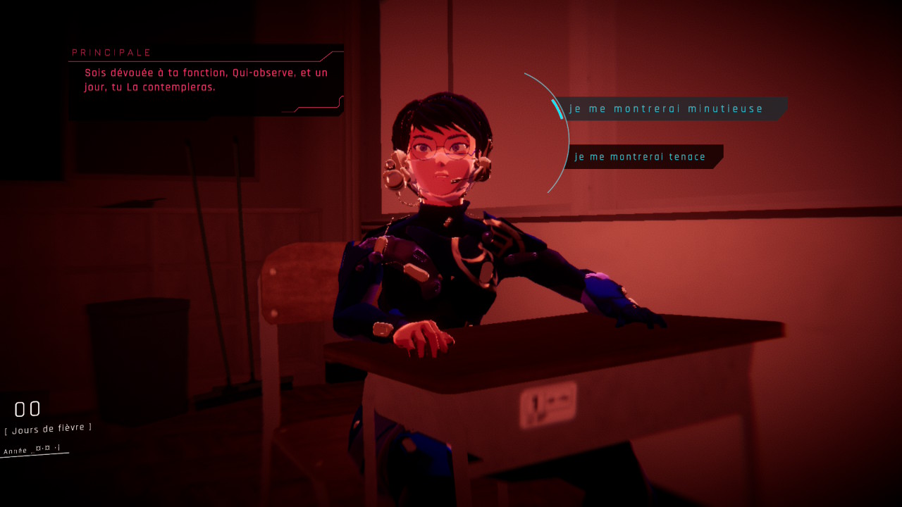 Chaque sœur a donc une fonction bien précise qui lui est attribuée au sein du Verger. Six d’entre elles ont des rôles particuliers. La Principale est responsable de la surveillance des lieux, Qui-fait-Boum est la responsable militaire, Qui-sait est la responsable de la préservation de la connaissance, Qui-répare est la responsable de l’ingénierie, Qui-soigne est la responsable du pôle médical et du clonage, et on incarne donc Qui-observe, qui est la nouvelle, qui a la capacité unique de revivre et interpréter les souvenirs de la MÈRE-DE-TOUTES via la communion.