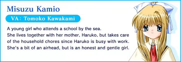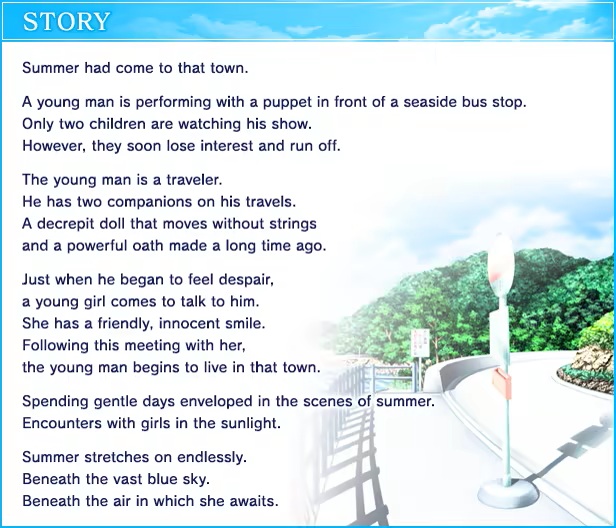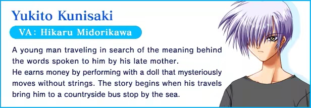 L’histoire commence avec le protagoniste Yukito Kunisaki qui va rencontrer différentes héroïnes avec qui il tissera des liens plus ou moins importantes. Dans la toute première branche de l’histoire, nommée Dream, on découvre donc la vie de Yukito, un jeune homme qui voyage de ville en ville avec très peu d’argent, qui essaye de vivre de son spectacle de marionnette. Il n’a plus de famille depuis que sa mère est morte, mais il parvient à avancer grâce à l’héritage unique qu’elle lui a laissé, une marionnette et son dernier souhait : que Yukito puisse voir la « fille dans les cieux », car son destin est de la sauver. S’il voyage de ville en ville, c’est parce qu’il a pour objectif de trouver cette fameuse fille, même s’il ne comprend pas ce que sa mère a voulu lui dire. Mais un jour, il arrive dans une petite ville paisible juste au début de l’été. Ici, il va rencontrer une jeune fille du nom de Misuzu Kamio, ce qui va changer sa vie à jamais…