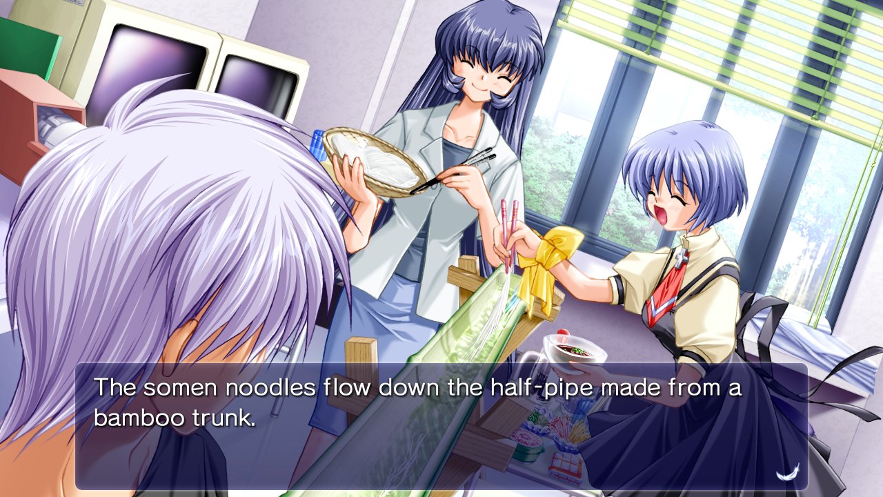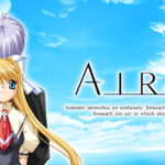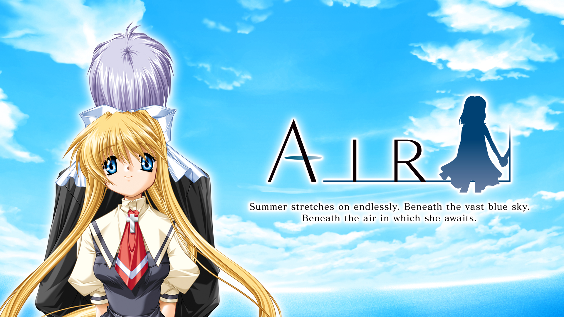 Air est le deuxième visual novel de Key après Kanon, connu également pour le genre « nakige » dont le pionnier est Jun Maeda (célèbre scénariste, parolier et compositeur du studio Key, dont il est aussi le cofondateur), qui donne envie de pleurer en lisant l’histoire et en suivant le développement des personnages, pouvant amener à des tragédies. Il est tout d’abord sorti sur PC en 2000 et a connu plusieurs portages sur d’autres supports (Dreamcast, PlayStation 2, SoftBank Mobile, PSP, FOMA, Android, iOS et PS Vita). Air permet de suivre l’aventure de trois personnages principaux dans cinq branches principales, et comme dans un visual novel classique, il suffit simplement de suivre l’histoire et les dialogues entre les personnages pour avancer. Il y a cependant plusieurs fins que l’on peut atteindre en fonction des choix effectués, avec la possibilité de revenir en arrière si l’on a commis une erreur. Il existe aussi des « mauvaises fins » qui poussent à revenir à la dernière sauvegarde, et il faut donc recommencer le jeu plusieurs fois pour assister à tous les dénouements. À noter que la version d’origine d’Air était qualifiée d’eroge, mais tous les portages ne comportent pas les scènes de sexe.