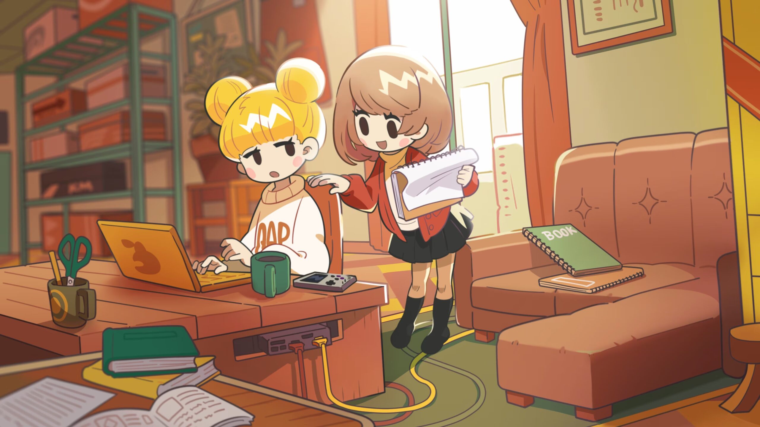 Goodbye World montre aussi comment les relations changent, alors que Kanii et Kumade essayent de travailler sur leur nouveau projet en le finançant avec les revenus de leur œuvre précédente. C’est Kanii qui traverse une crise, d’autant plus qu’elles n’ont pu rien créer aux cours des deux dernières années, et que le temps presse en plus de l’argent. En désespoir de cause, elles contactent un éditeur, mais il y a des complications… En progressant dans la partie aventure du jeu, le niveau de développement du projet des héroïnes avancera, et cela permettra de débloquer les autres niveaux de BLOCKS.