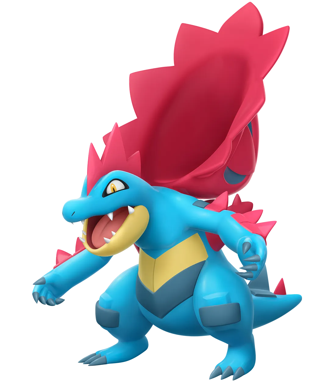 « La Méga-Évolution a donné à son aileron dorsal une taille gigantesque. Quand cet aileron est combiné à la force de ses bras, la puissance des « morsures » de Méga-Aligatueur devient 10 fois plus grande qu’elle ne l’était avant sa Méga-Évolution. Il peut désormais déchiqueter tout ce qui pouvait être trop gros pour lui auparavant.