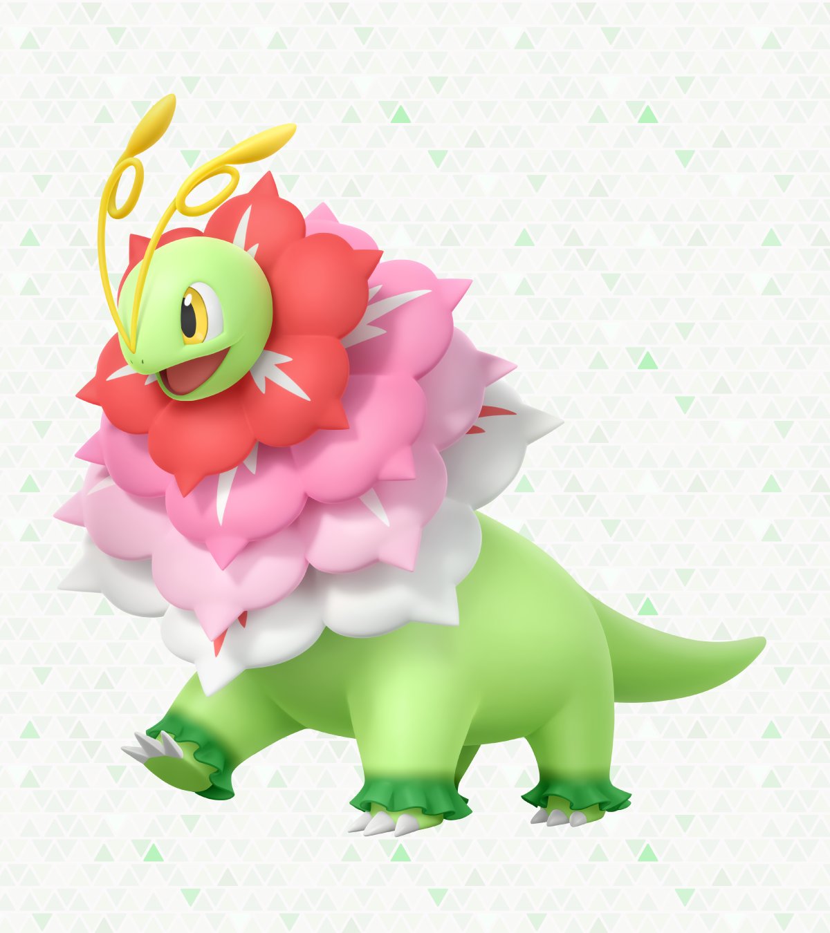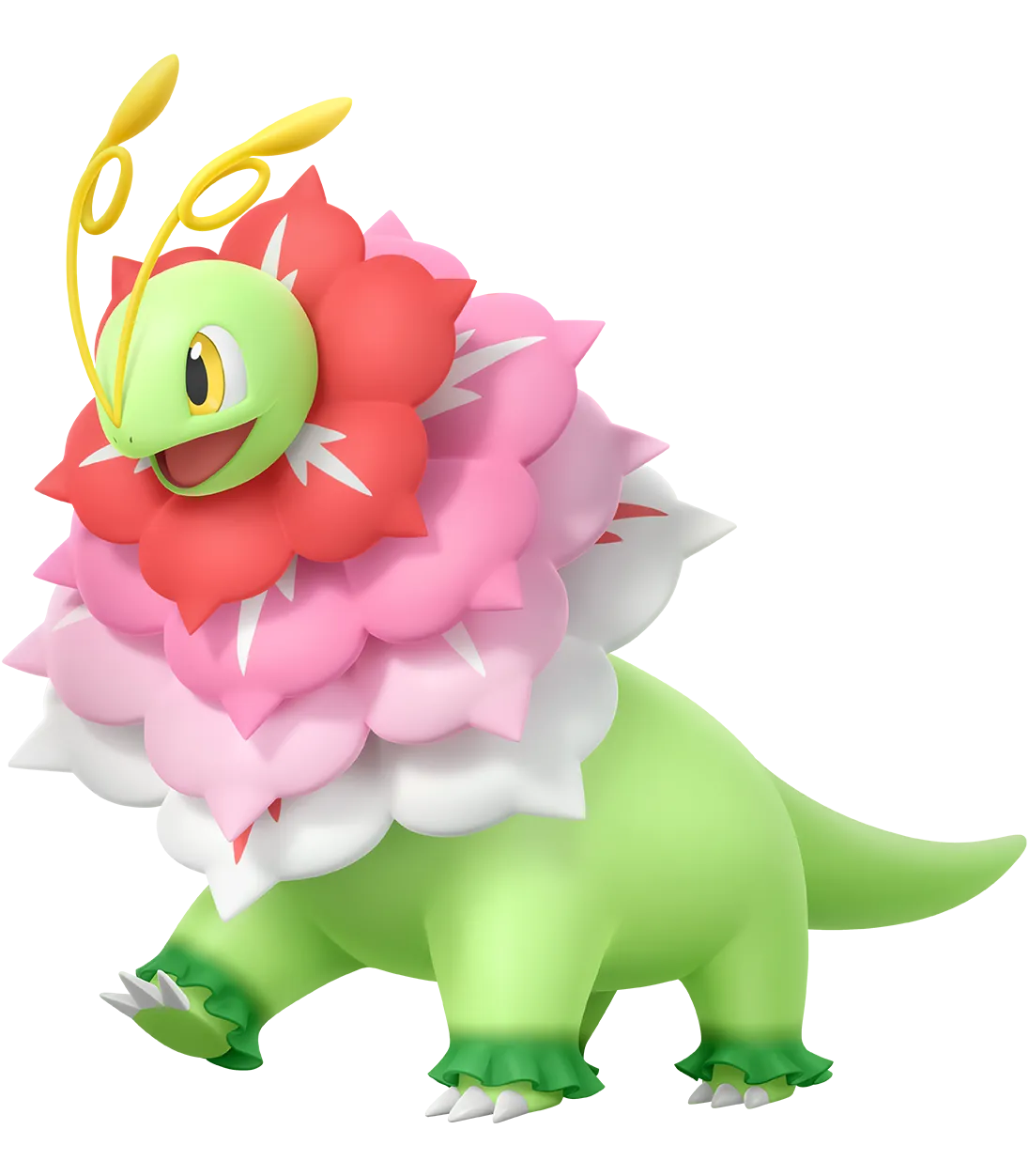 Méga-Méganium possède les types Plante et Fée. Ses quatre fleurs peuvent stocker une grande quantité d’énergie solaire, tout en créant une substance qui dégage un parfum particulier.