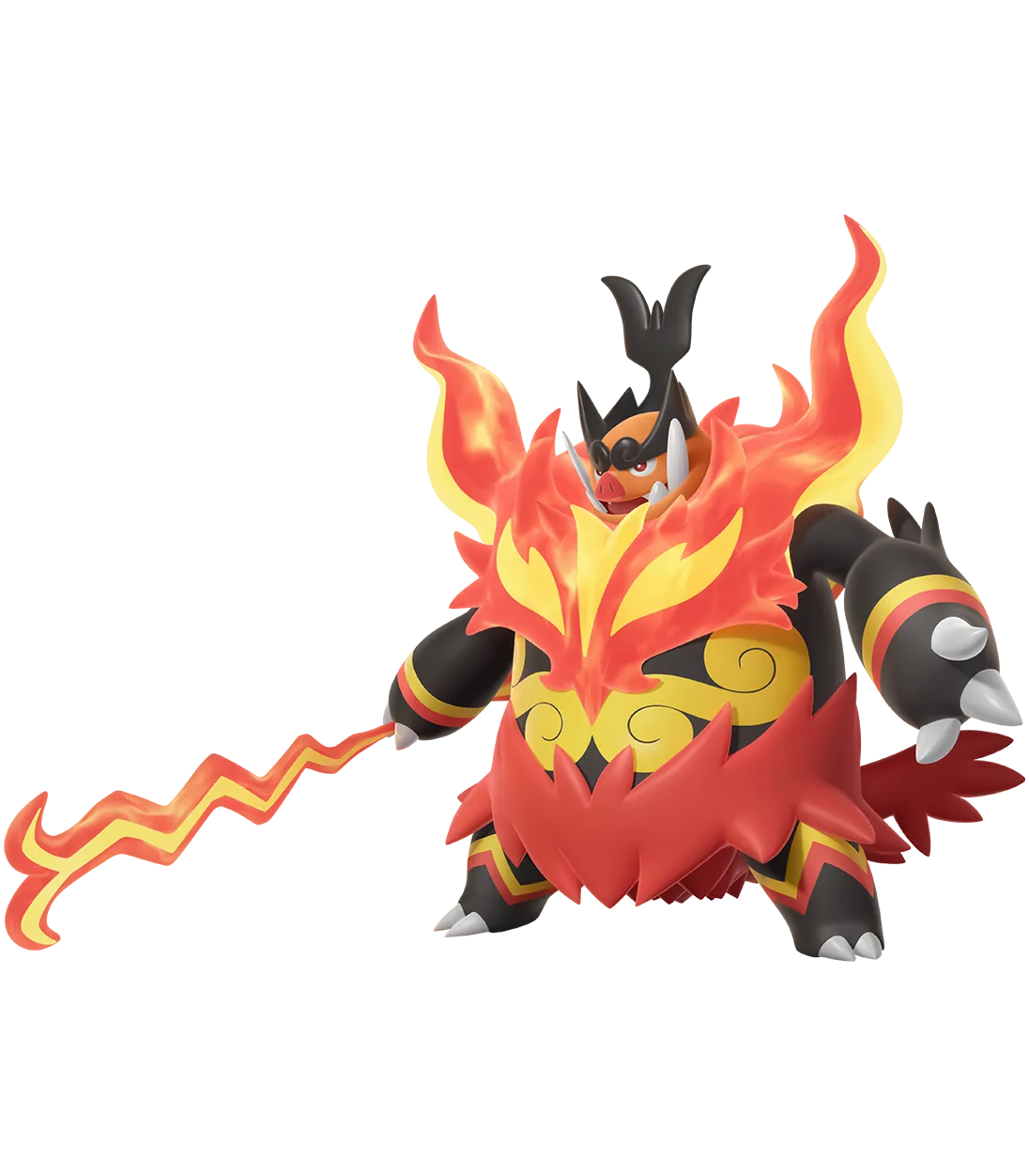 La Méga-Évolution lui a octroyé une puissance phénoménale : ses muscles et son énergie ardente en ont bénéficié. Plus sa motivation est grande, plus les flammes de sa barbe sont intenses. La fougue de ce Pokémon est parfois si grande que la pointe de sa lance serpentine peut atteindre une température avoisinant les 10 000 °C ! »
