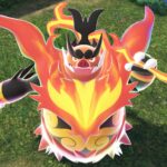 « Grâce à la Méga-Évolution, Roitiflam est devenu plus grand et plus musclé. Sa barbe de feu brûle encore plus intensément et enveloppe le haut de son corps comme une pièce d’armure. Depuis la paume de ses mains, il peut libérer de l’énergie ardente et matérialiser des flammes sous la forme d’une lance serpentine dont il se sert pour se battre.