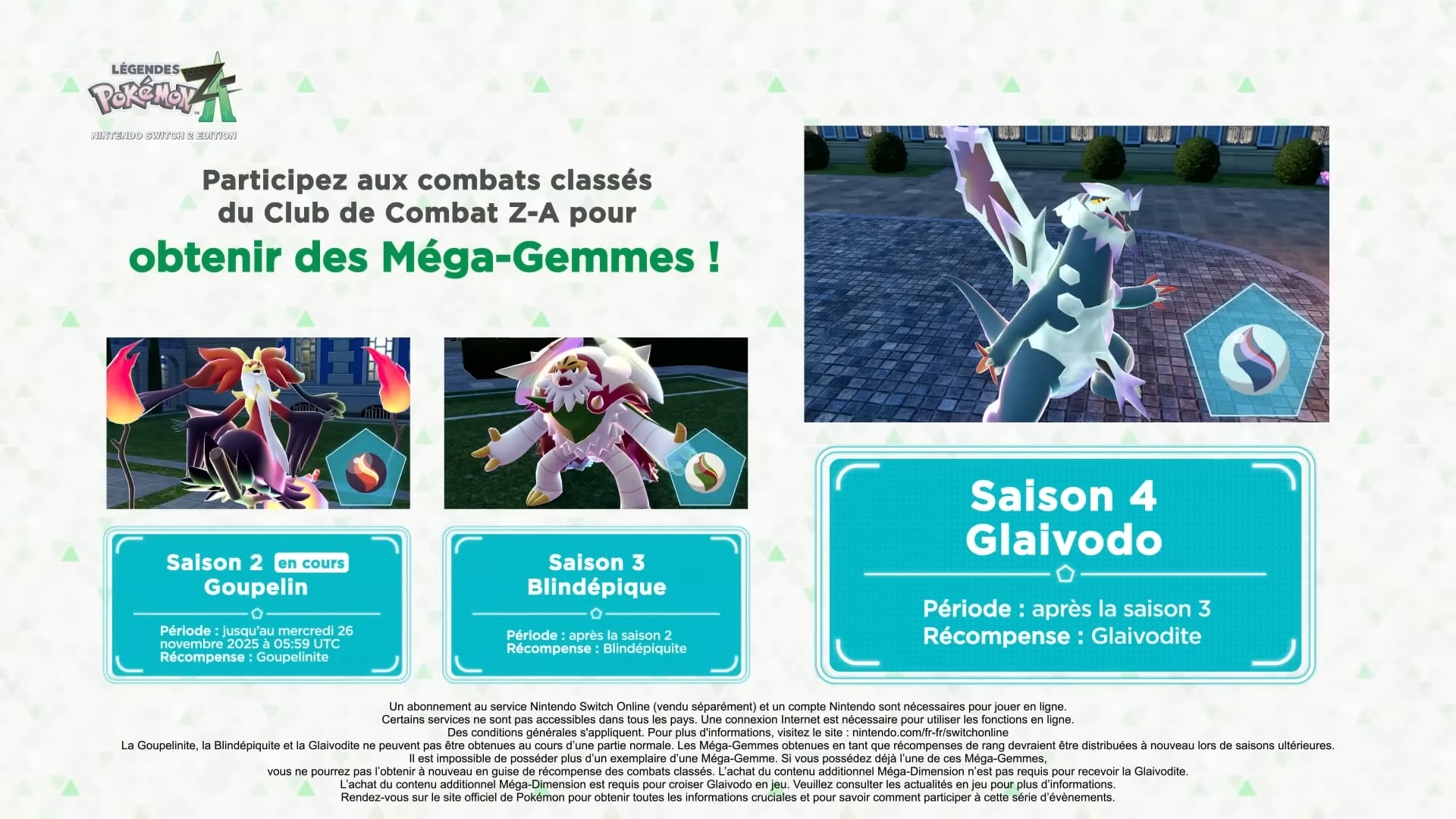 Pour rappel, il existe trois types de récompenses dans les combats classés : les récompenses de combat obtenues après chaque combat, les récompenses de rang obtenues en montant dans les rangs, et les récompenses saisonnières que l’on obtiendra en fin de saison qui dépendent de notre rang final. Il faudra enchaîner les combats et affûter nos compétences pour obtenir une grande variété de récompenses. Certaines Méga-Gemmes s’obtiennent uniquement en montant de rang. Celle de Méga-Glaivodo, la Glaivodite, pourra être obtenue durant la saison 4, à la suite de la saison 3. The Pokémon Company note que les Méga-Gemmes obtenues en tant que récompense de rang devraient être distribuées à nouveau lors de saisons ultérieures.