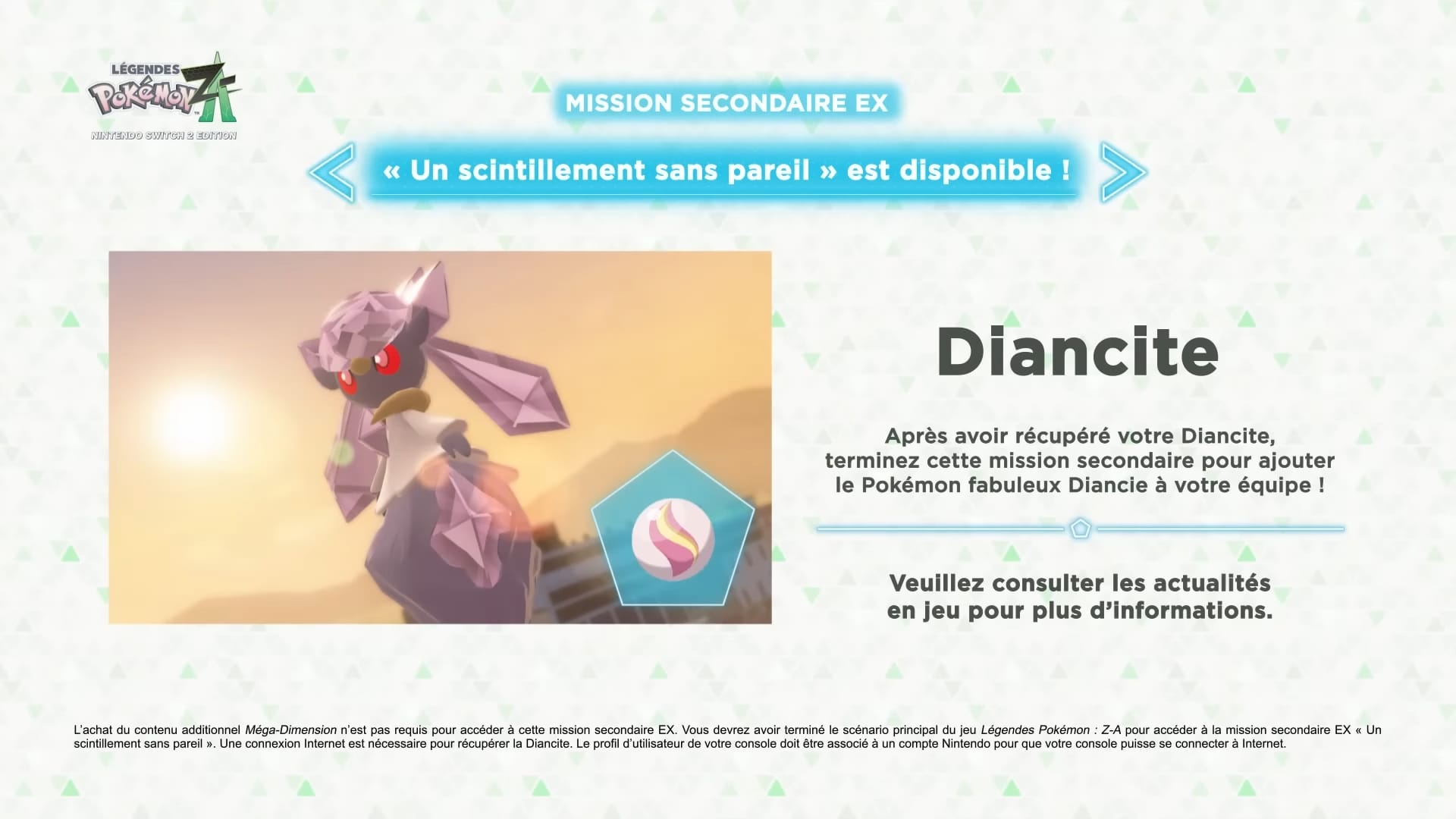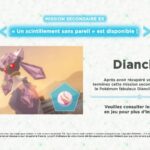 Une nouveauté attend les personnes qui ont déjà terminé l’aventure principale du jeu de base. Il est désormais possible de recevoir une Diancite via la fonction Cadeau Mystère dans Légendes Pokémon : Z-A et la mission secondaire EX « Un scintillement sans pareil » devient accessible. Terminer cette mission permettra d’ajouter le Pokémon fabuleux Diancie dans l’équipe. La Diancite permettra donc de le faire méga-évoluer en Méga-Diancie. Il faudra avoir terminé le scénario principal de Légendes Pokémon : Z-A pour accéder à la mission. La Diancite peut être récupérée depuis le menu « Cadeaux Mystère » du jeu en sélectionnant « Via Internet ». Après avoir récupéré la Diancite, il faudra se rendre à l’Agence Beladonis. Si l’on parle à Gribouille, le Psystigri de Millie, il s’intéressera à la Méga-Gemme.