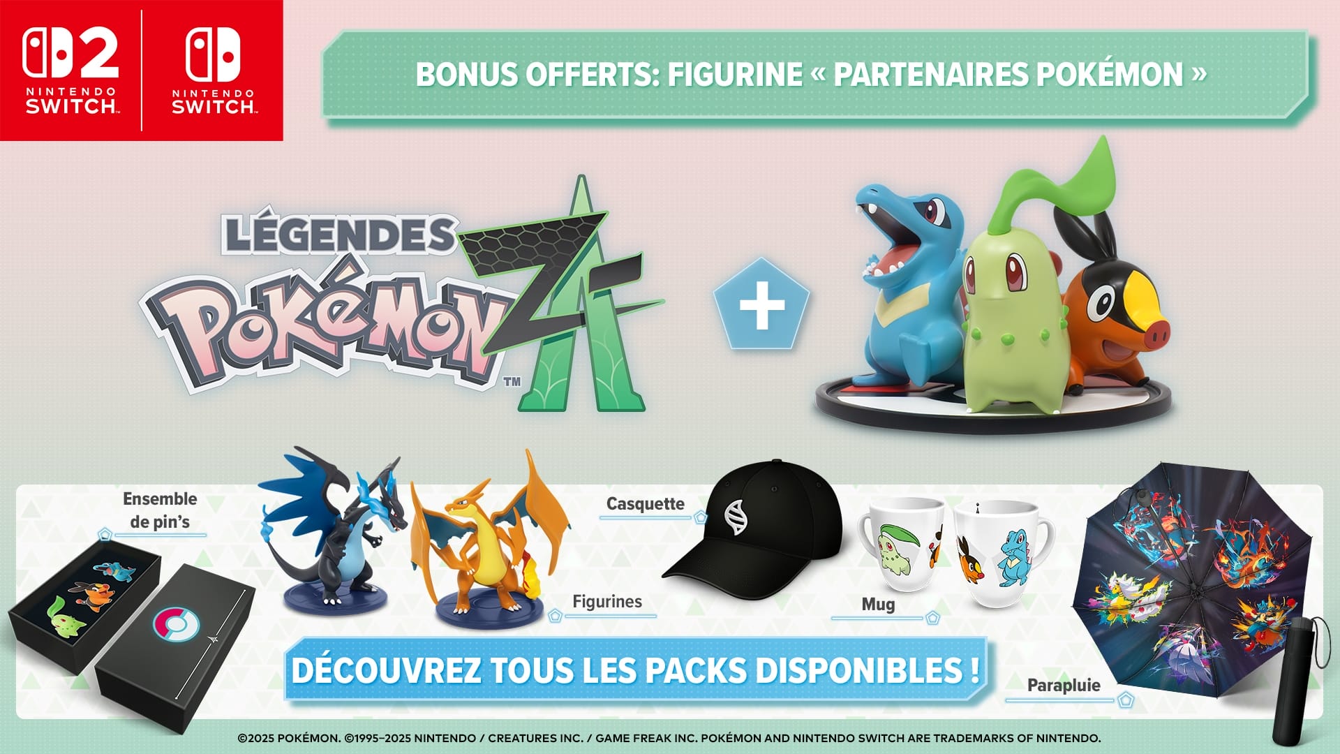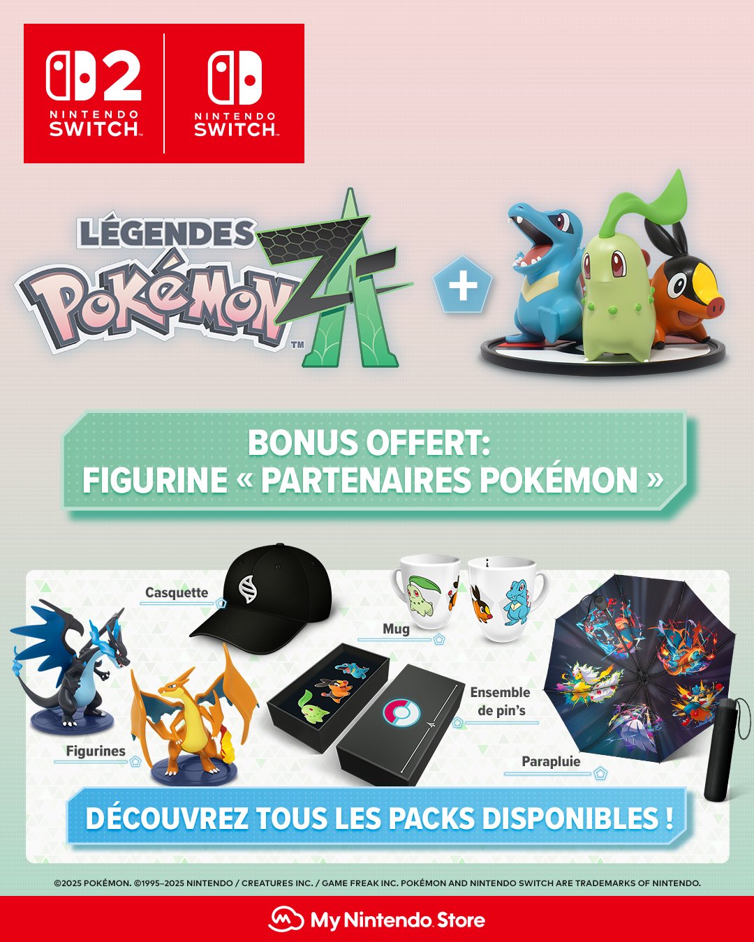 Nintendo of Europe a aussi annoncé que plusieurs packs incluant Légendes Pokémon : Z-A sur Switch et sa version Switch 2 Edition avec divers produits dérivés seront disponibles en exclusivité sur la boutique My Nintendo Store. Il est possible de faire part de notre intérêt à cette adresse. On sait que pour tout achat, une figurine avec les Pokémon de départ du jeu (Germignon, Gruikui et Kaiminus) sera offerte. Les produits dérivés des packs seront un ensemble de pin’s, des figurines de Méga-Dracaufeu X et Méga-Dracaufeu Y, une casquette, un mug et un parapluie. Les packs sont nommés « Méga-Évolution », « Dresseur » et « Choix de Maître ». La boutique nous apprend que les versions physiques et numériques de Légendes Pokémon : Z-A seront disponibles en précommande à partir du 11 juillet 2025 sur le My Nintendo Store. Sur l’eShop, les versions numériques seront disponibles en précommande à partir du 5 juin 2025.