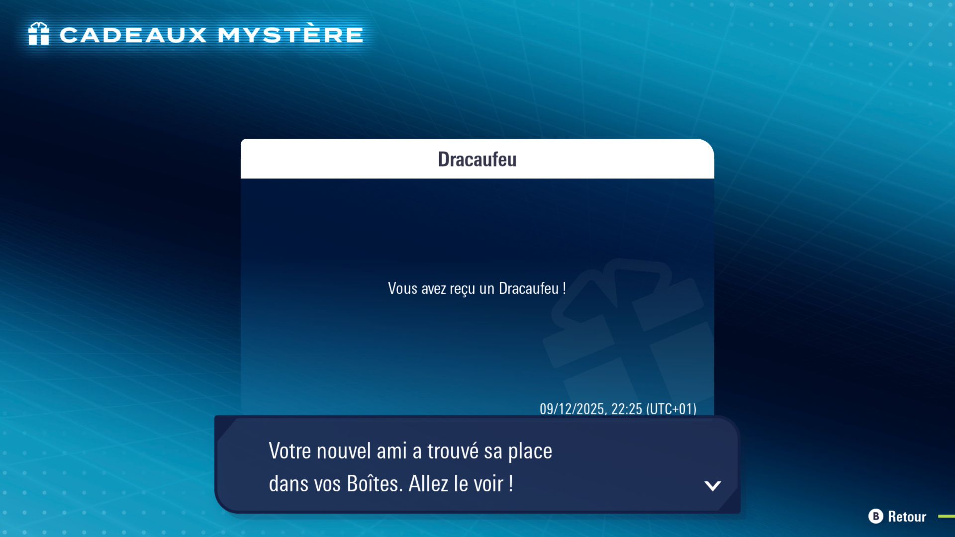 À l’occasion de la sortie imminente du DLC Méga-Dimension de Légendes Pokémon : Z-A sur Nintendo Switch et Nintendo Switch 2 (prévue pour ce 10 décembre 2025 dans la matinée), une nouvelle distribution via Cadeaux Mystère a été lancée pour le jeu de base. Il est désormais possible d’obtenir un Dracaufeu Baron au niveau 36 avec le mot de passe B1G0006, à entrer dans le menu « Cadeaux Mystère » après avoir sélectionné « Via un code ou mot de passe ». Le Pokémon dispose des attaques Lance-Soleil, Lance-Flammes, Draco-Griffe et Lame d’Air. Une nouvelle bande-annonce pour la sortie du DLC Méga-Dimension a été partagée, mettant d’abord en avant ce Dracaufeu Baron :