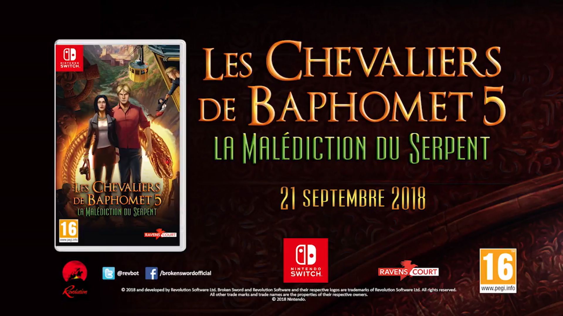 Après être sorti en décembre 2013 sur PC/Mac et PlayStation Vita, début 2014 sur iOS et Android, puis septembre 2015 sur PS4 et Xbox One, voici que Les Chevaliers de Baphomet 5 : La Malédiction du Serpent arrive sur Nintendo Switch le 21 septembre 2018. Sous la houlette de Revolution Software et Ravenscourt, le jeu profitera, à cette occasion, d’une nouvelle interface innovante et de commentaires vidéo inédits du réalisateur du jeu.