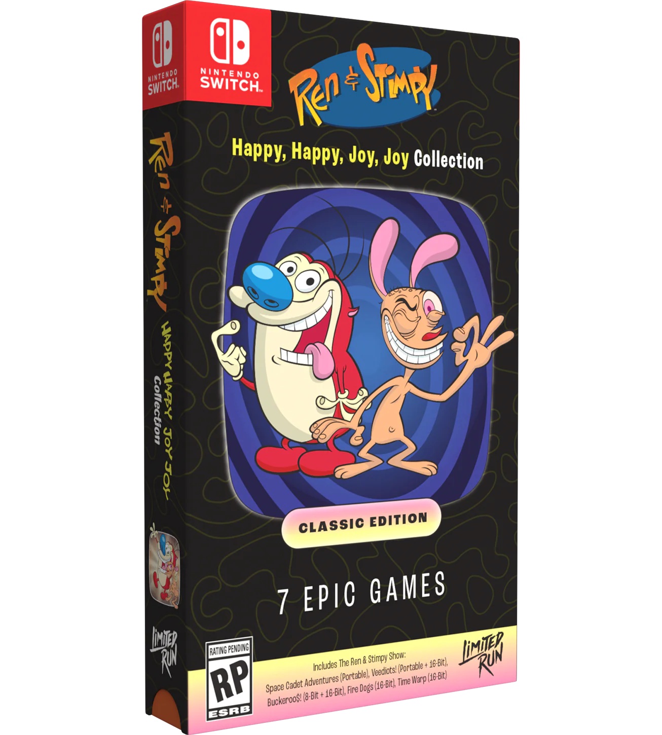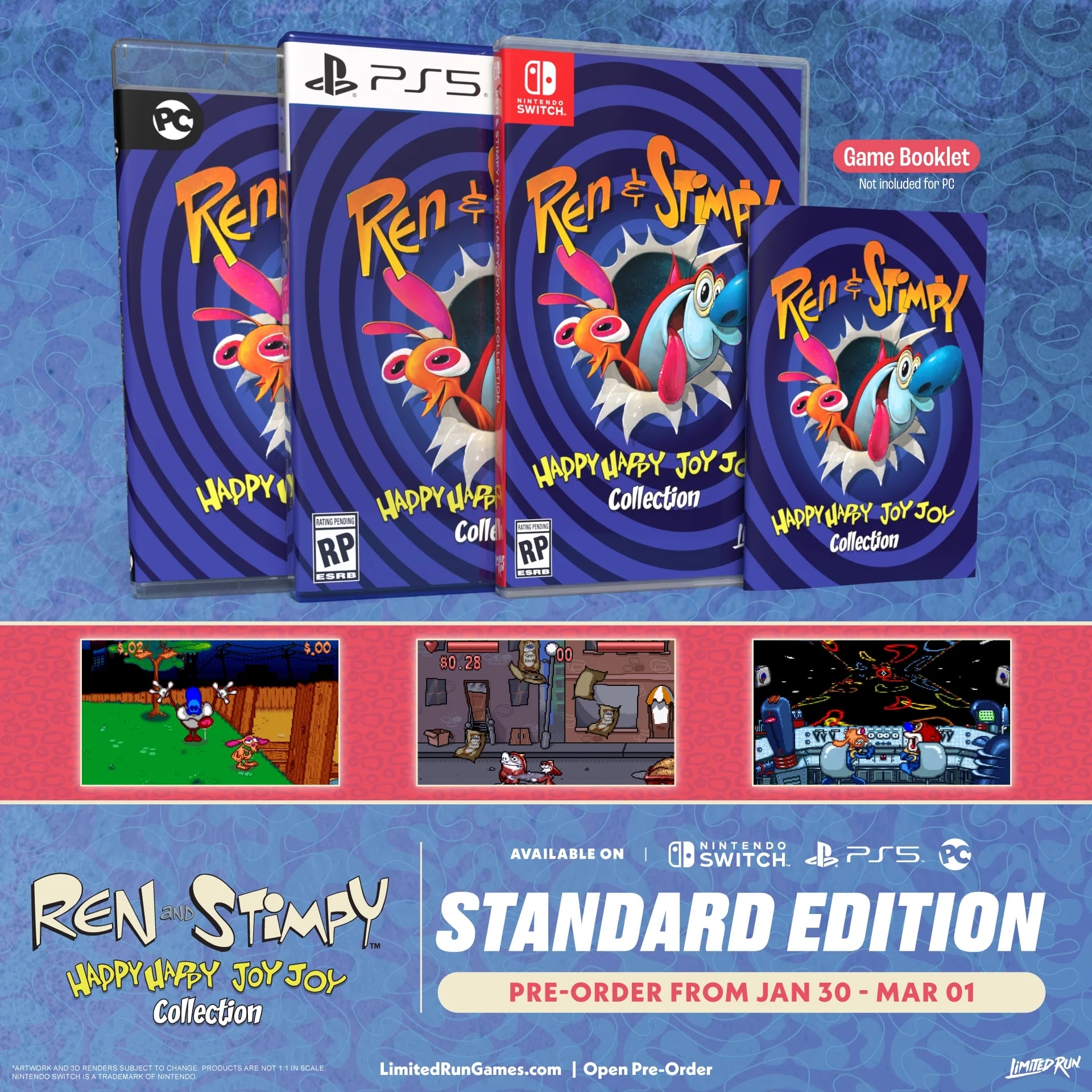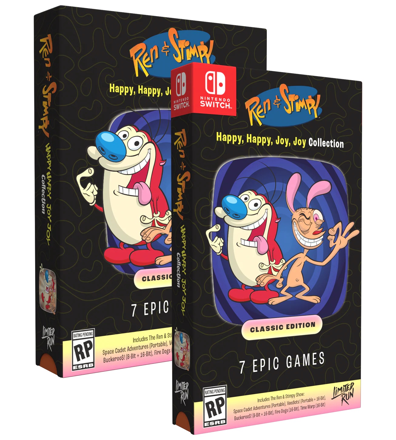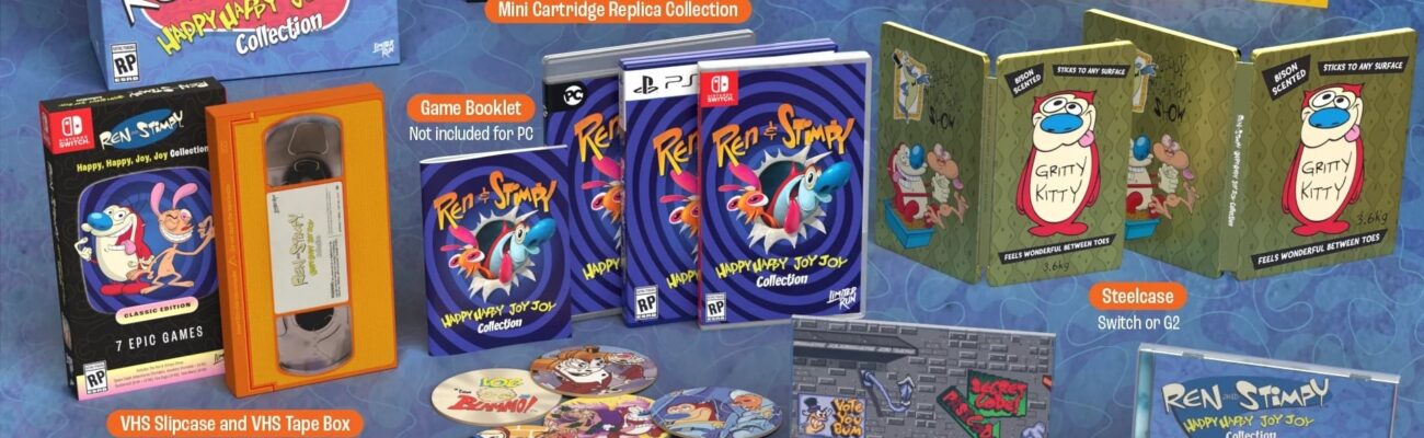 Sortie le 20 février 2026 en téléchargement sur Nintendo Switch, PlayStation 5 et PC, la compilation Ren & Stimpy Happy, Happy, Joy, Joy, Collection a aussi droit à des éditions physiques en version américaine qu’il est possible de précommander en exclusivité sur la boutique de Limited Run Games jusqu’au lundi 2 mars 2026 à 05:59 (heure française). Trois éditions différentes sont proposées : une version standard à 34,99 $, une version Classic à 69,99 $ et une version Collector à 109,99 $. Les versions standard et Classic seront expédiées entre le 1er juillet et le 30 septembre 2026, tandis que l’expédition de la version Collector est expédiée entre le 1er octobre et le 31 décembre 2026. La version téléchargeable coûte 19,99 € sur l’eShop.