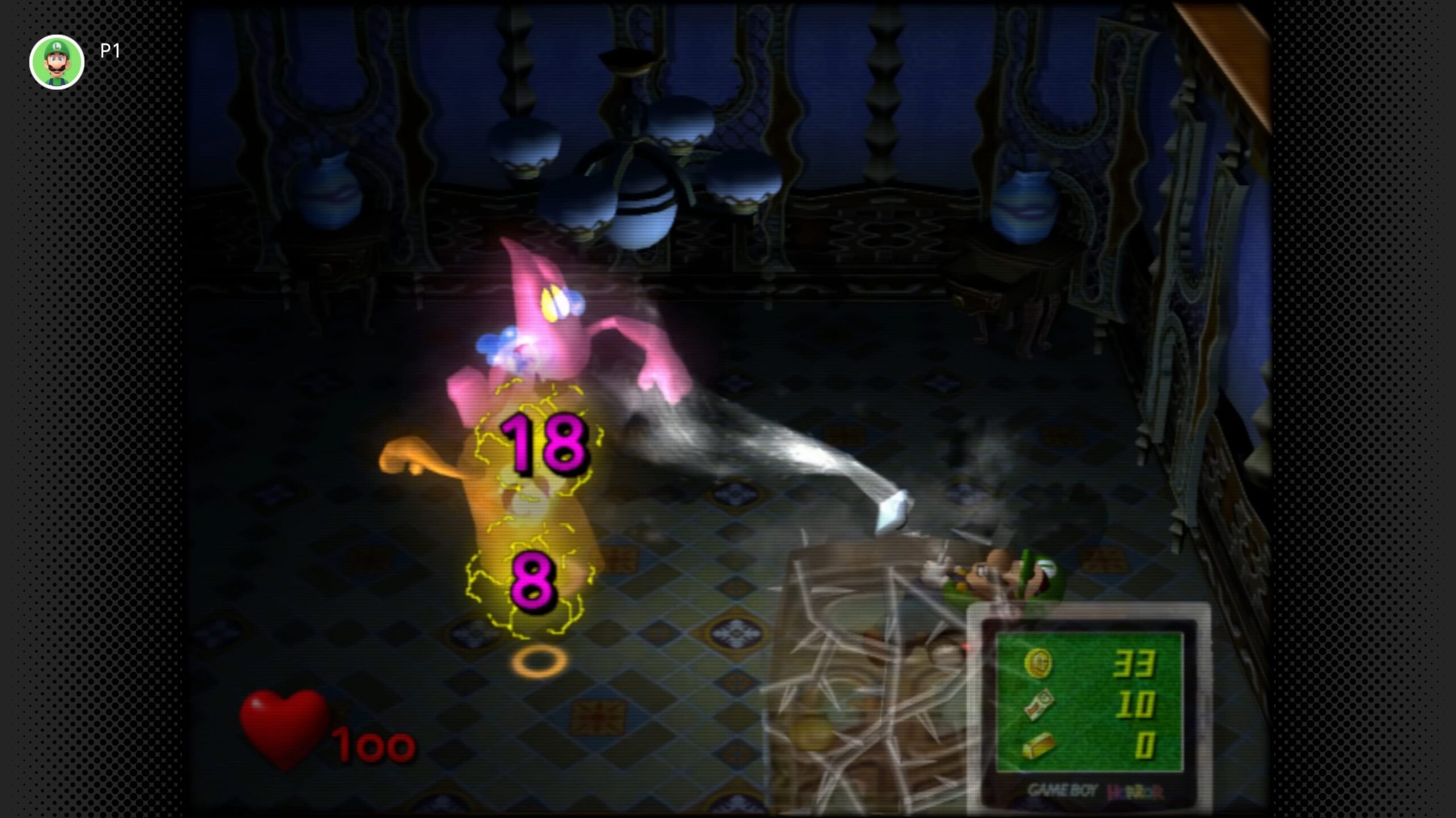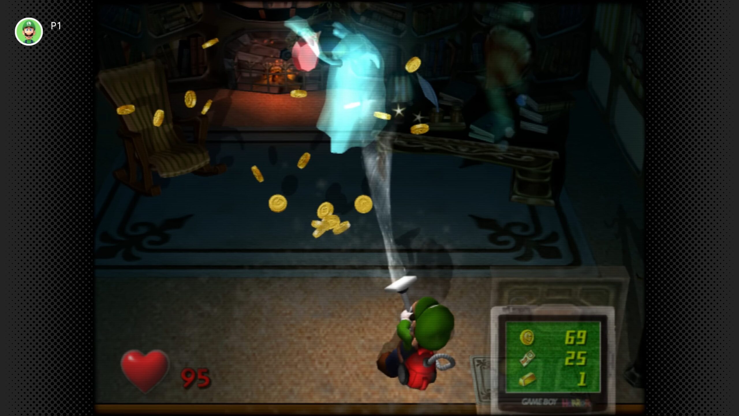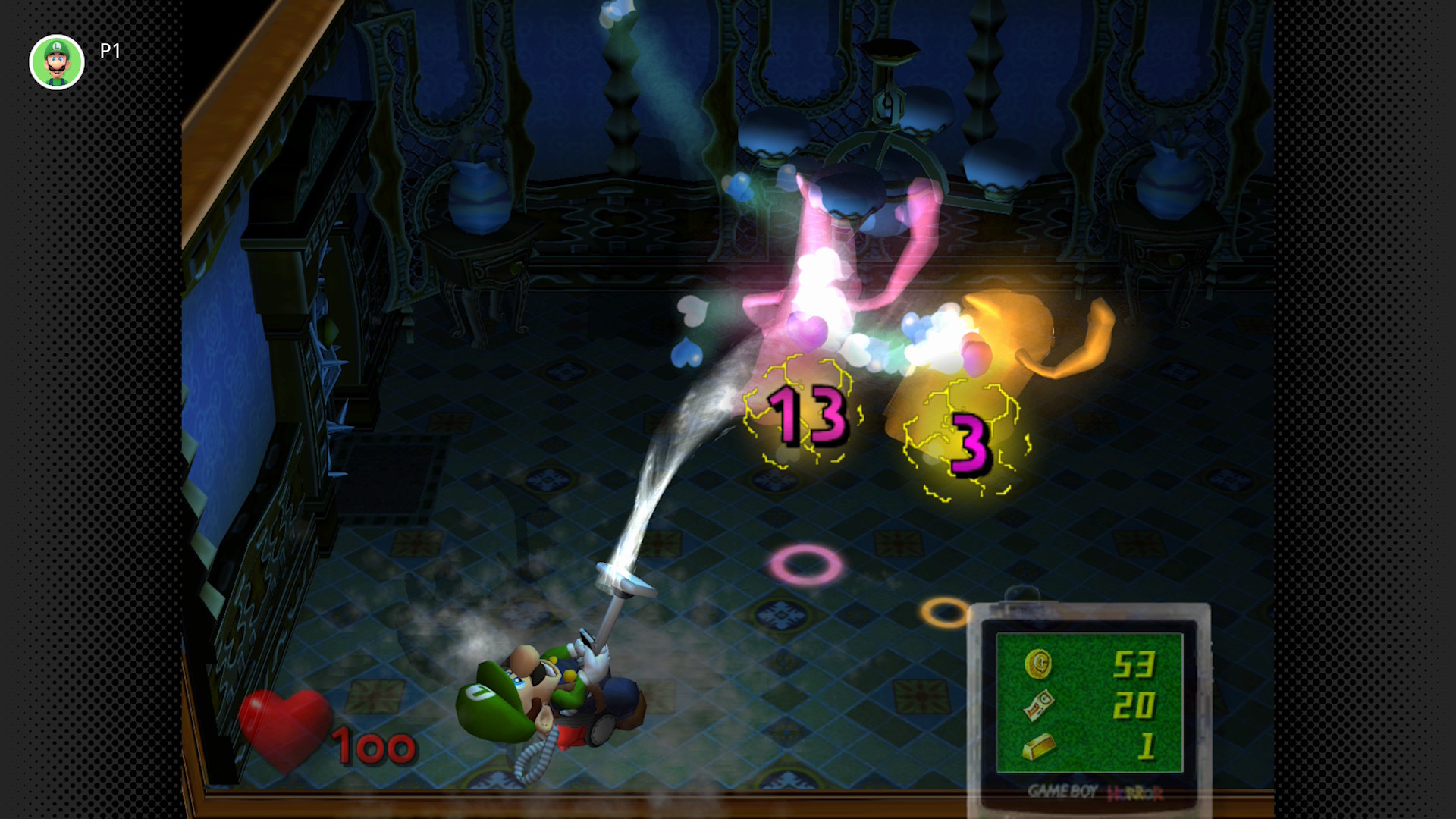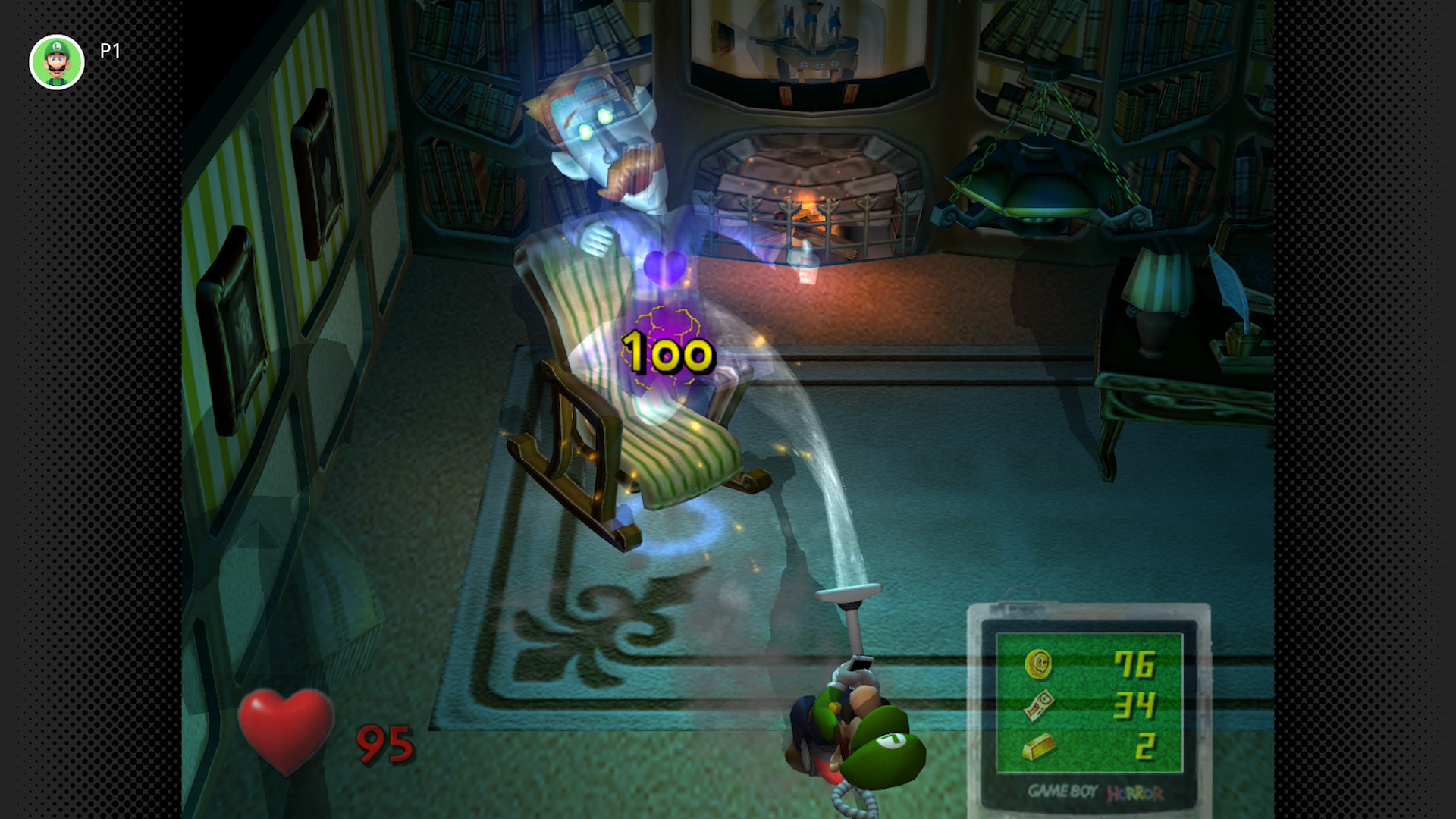 Luigi devra progresser dans cette maison, salle après salle, en résolvant des énigmes en chemin. Très vite, Luigi tombera sur quelques-uns des habitants ectoplasmiques du manoir. Ceux-ci, de tailles et de formes très diverses, ne manquent pas de personnalité. Heureusement, Luigi sera secouru par l’excentrique professeur K. Tastroff qui lui apprendra tout des mystères de cette demeure. Le professeur deviendra le conseiller de Luigi durant le jeu et lui apportera son aide par l’intermédiaire du Game Boy “Horror”, un Game Boy modifié permettant de consulter le plan du jeu, les objets recueillis, etc. Gad présentera à Luigi son aspirateur très spécial, le Poltergust 3000, qui occupe une place centrale dans le jeu. La lampe torche de Luigi permettra de figer les fantômes afin que l’aspirateur puisse les avaler. Mais les fantômes ne se laisseront pas faire et se battront pour conserver leur liberté. Luigi devra rester à distance et, à l’instar d’un pêcheur vis-à-vis de sa prise, devra “remonter” chaque fantôme.