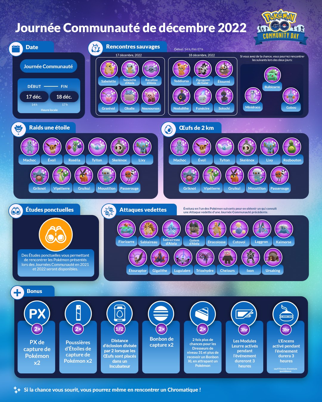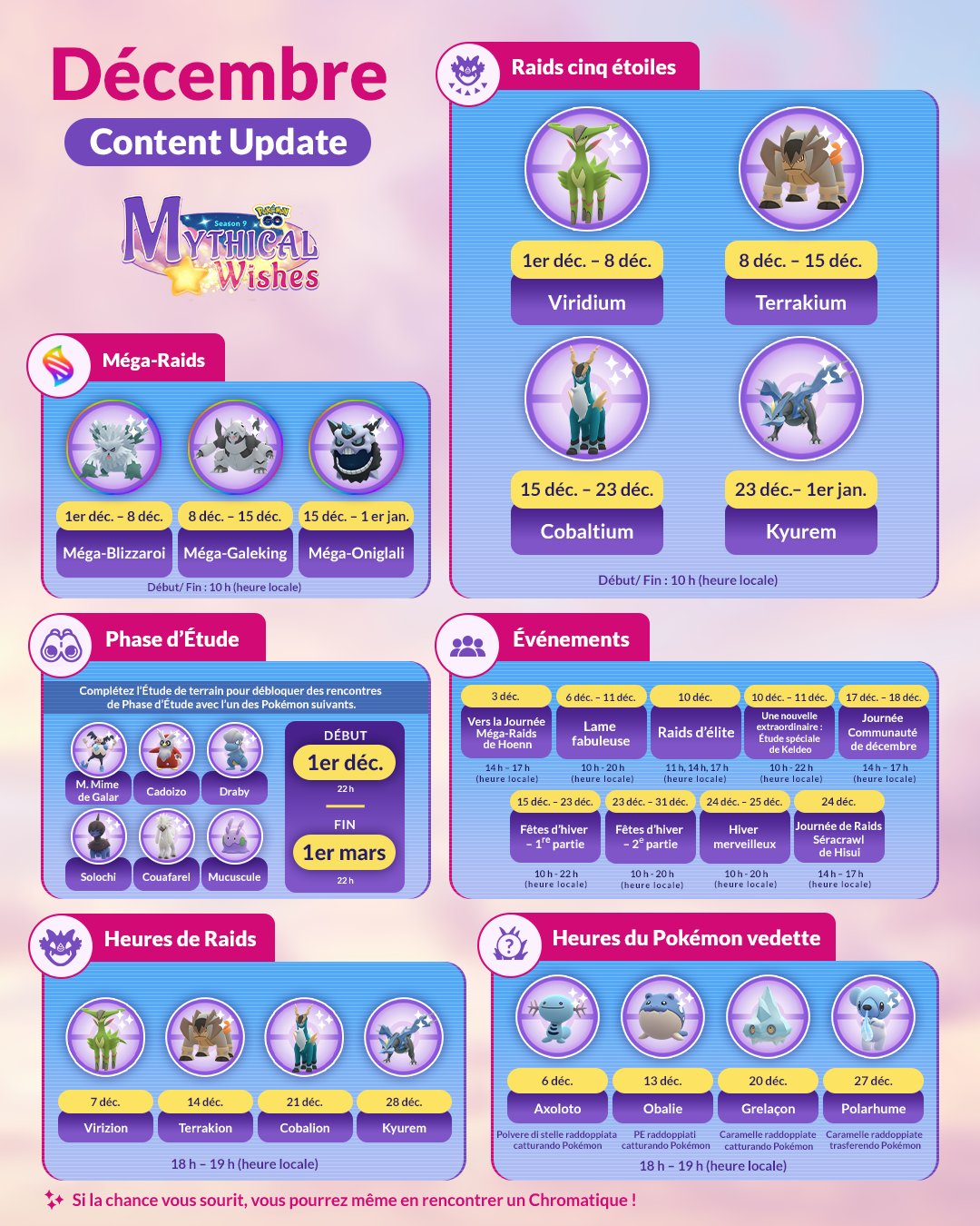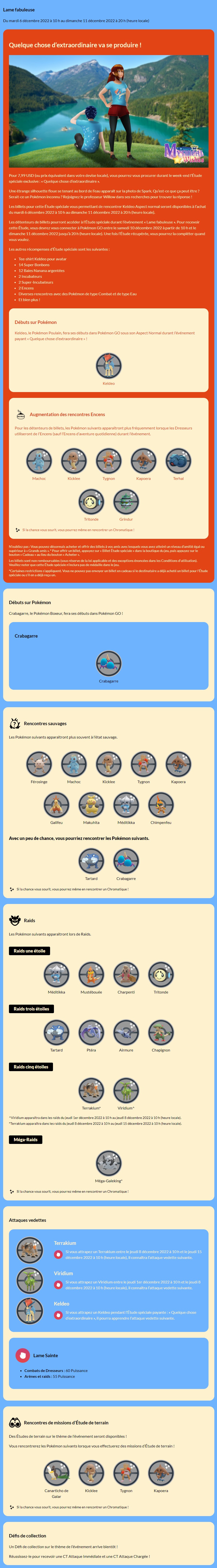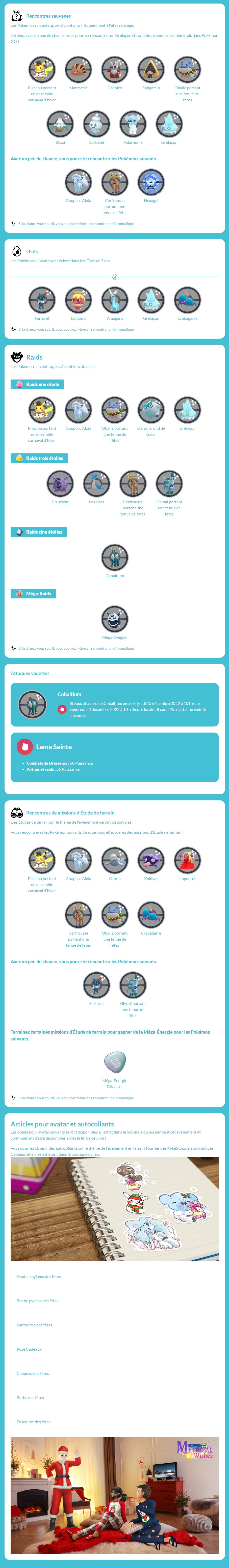 Mise à jour : l’événement « Lame fabuleuse » et la Journée Communauté de décembre ont été détaillés. Les nouvelles tailles de Pokémon sont également arrivées dans Pokémon GO (tous les détails se trouvant à cette adresse).