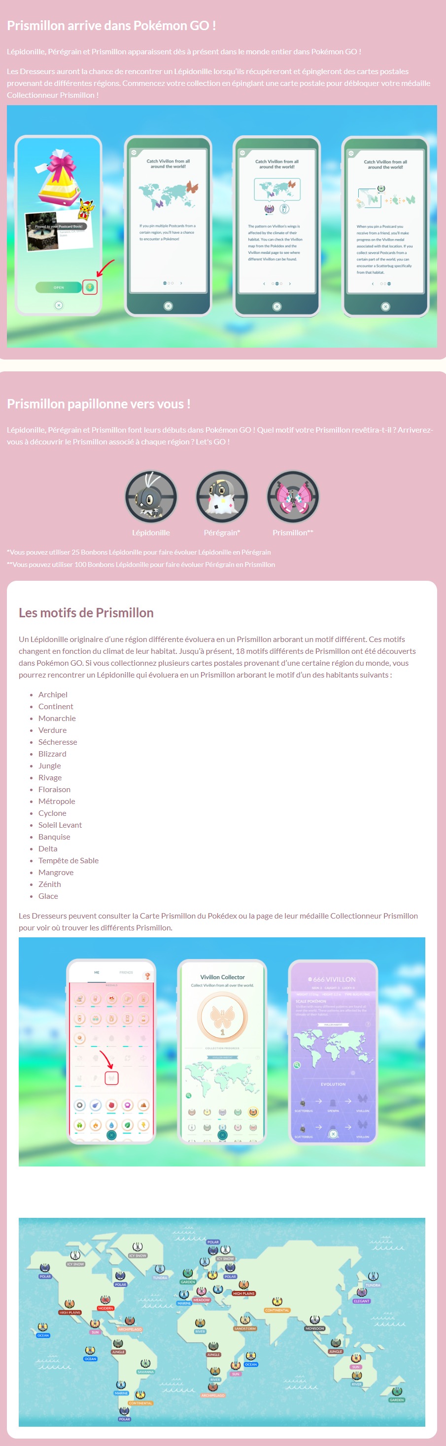 « Prismillon (Pris-mi-yon), le Pokémon Lépidécaille, est célèbre pour ses différents motifs. Les Dresseurs peuvent collectionner des Prismillon arborant un motif différent sur leurs ailes à travers le monde en épinglant des cartes postales reçues de la part de Dresseurs ou provenant de PokéStops et d’Arènes de différentes régions. Épinglez des cartes postales provenant des régions éligibles pour débloquer votre médaille Collectionneur Prismillon et faire progresser vos sous-médailles associées à la région d’origine de la carte postale pour rencontrer Pérégrain. Un Pérégrain originaire d’une région distincte évoluera en un Prismillon arborant un motif différent sur ses ailes ! Arriverez-vous à découvrir et capturer tous les Prismillon qui existent ?
