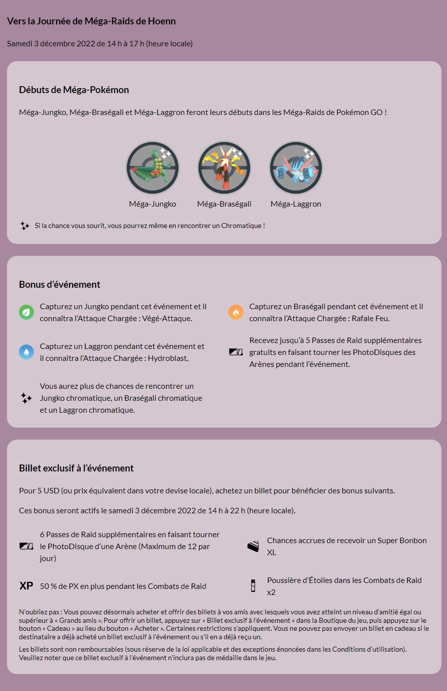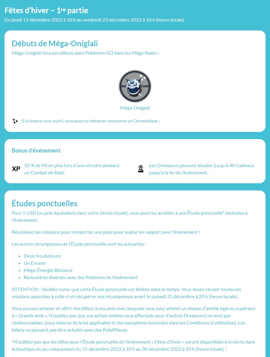 Une nouvelle saison a débuté dans Pokémon GO, et plusieurs événements auront bien évidemment lieu en décembre. Comme d’habitude, un programme est disponible sur le site officiel de Pokémon GO pour se tenir au courant des différents événements et raids, ainsi que sur la Phase d’Étude. Dès demain, le samedi 3 décembre, il y aura un événement payant pour marquer le coup d’envoi de la nouvelle Saison et célébrer l’annonce et l’arrivée du Circuit Pokémon GO : Hoenn. Pour y participer, il faut acheter un ticket à 5,99 € (il est aussi possible de l’offrir à un ami en l’achetant au même prix). Il aura lieu de 14h à 22h (heures locales) et permettra de participer à des Méga-Raids contre les Méga-Évolutions de Jungko, Braségali et Laggron. Ils ne reviendront pas avant le Circuit Pokémon GO : Hoenn, qui se déroulera avec un événement uniquement à Las Vegas les 18 et 19 février 2023 et un événement mondial, dont une version payante, auquel tout le monde pourra participer les 25 et 26 février en achetant un ticket comme pour les Circuits de Kanto et Johto. Il est déjà en vente pour l’événement à Las Vegas, mais celui pour l’événement mondial sera disponible à partir du 20 février. Cet événement sera l’occasion d’attraper les Pokémon qui manquent à notre Pokédex de Hoenn, ou encore d’obtenir Primo-Kyogre, Primo-Groudon et la forme chromatique du Pokémon fabuleux Jirachi. La page officielle de l’événement est accessible à cette adresse. Pour mieux s’y retrouver, nous avons aussi répertorié ci-dessous tous les liens nécessaires pour comprendre le fonctionnement de l’événement.