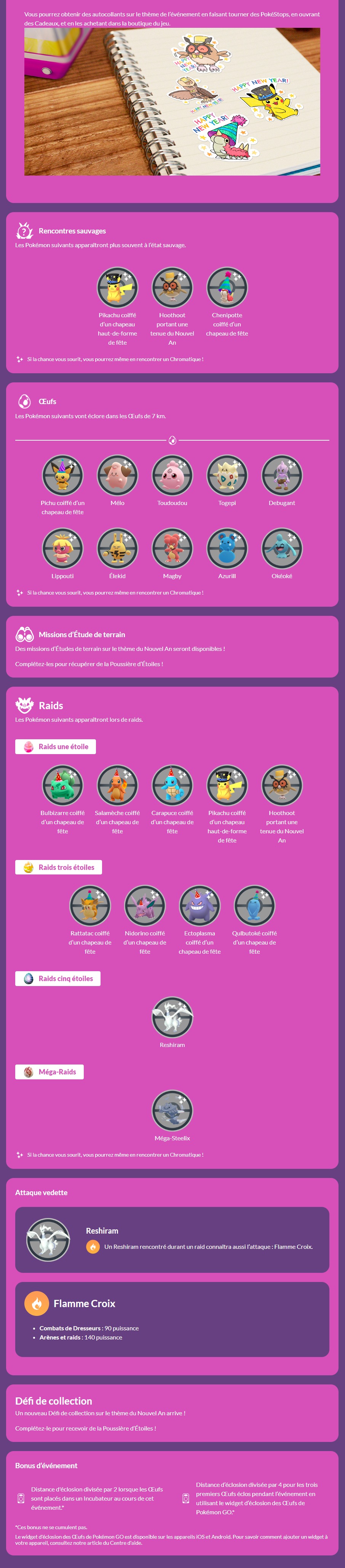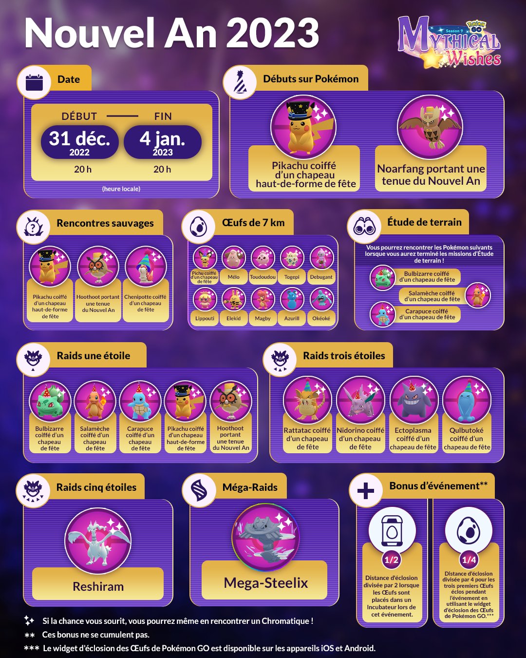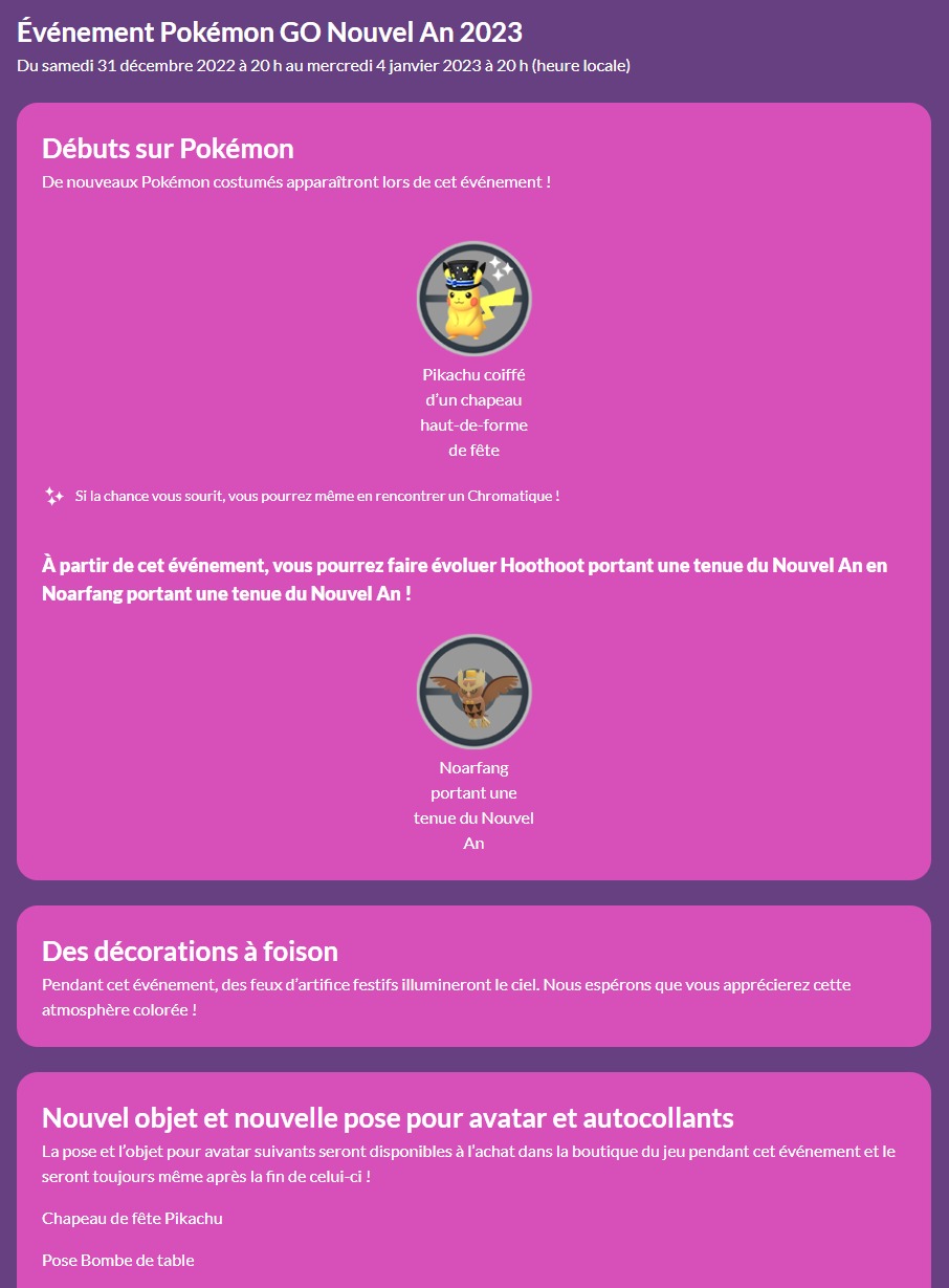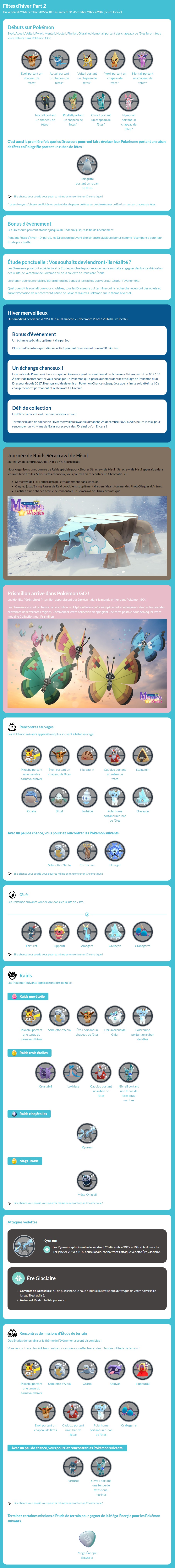 Concernant les événements, on note l’arrivée de Keldeo dans le jeu via une Étude spéciale et de Séracrawl de Hisui via une Journée de Raids (ce qui permettra donc de l’avoir facilement sous sa forme chromatique, comme ce fut le cas pour Gueriaigle de Hisui). Étant donné que nous n’avons pas encore les détails sur les événements, nous mettrons à jour régulièrement cet article. Concernant la nouvelle saison, intitulée « Vœux fabuleux », elle a déjà commencé et se déroulera jusqu’au 1er mars 2023 à 10h. Tous les détails se trouvent à cette adresse. Il y a aussi toutes les informations sur la mise à jour de la Ligue de Combat GO ici (date à retenir : la Journée de Combat GO avec Goupix le dimanche 12 février 2023 de minuit à 23h59, qui permettra d’avoir plus de chance de l’obtenir sous sa forme chromatique). Par ailleurs, Niantic et The Pokémon Company vont introduire les Pokémon XXS et XXL durant la nouvelle saison, des tailles de Pokémon encore jamais vues.