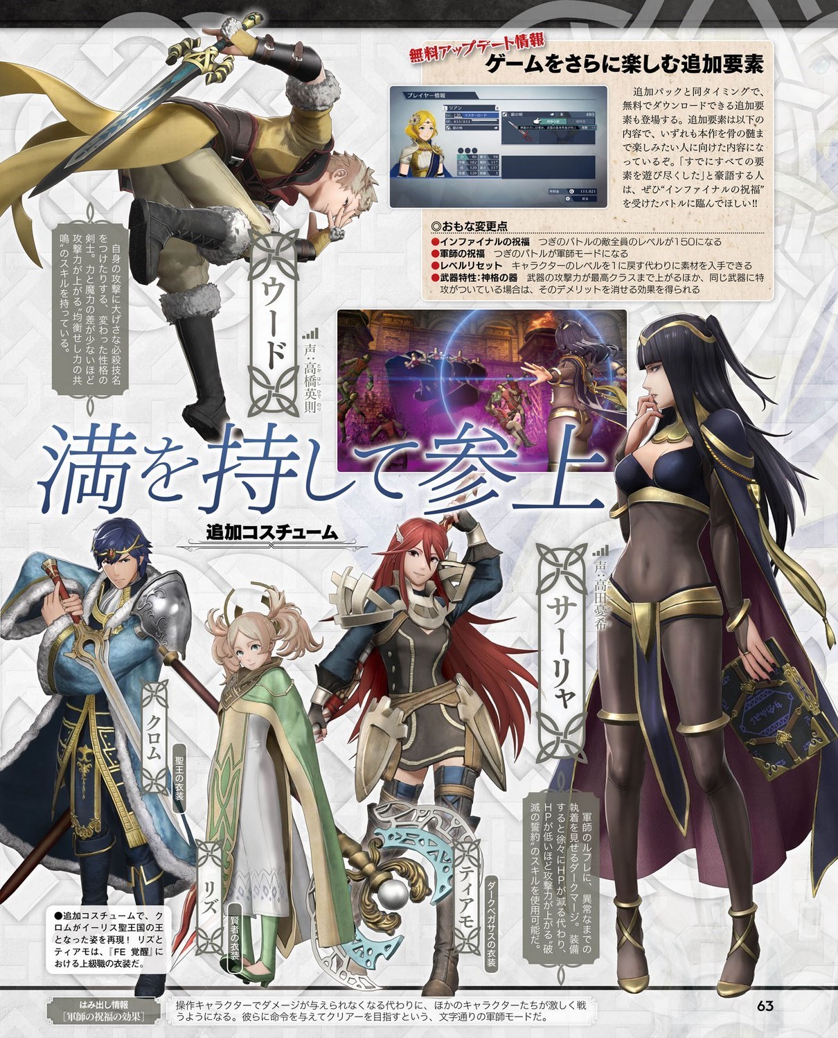 – Trois nouveaux costumes : Roi d’Ylisse pour Chrom (inspiré d’une carte de Chrom du jeu de cartes à collectionner Fire Emblem Cipher), Sage pour Lissa (inspirée de la tenue d’Emmeryn) et Chevalier pégase noir pour Cordelia