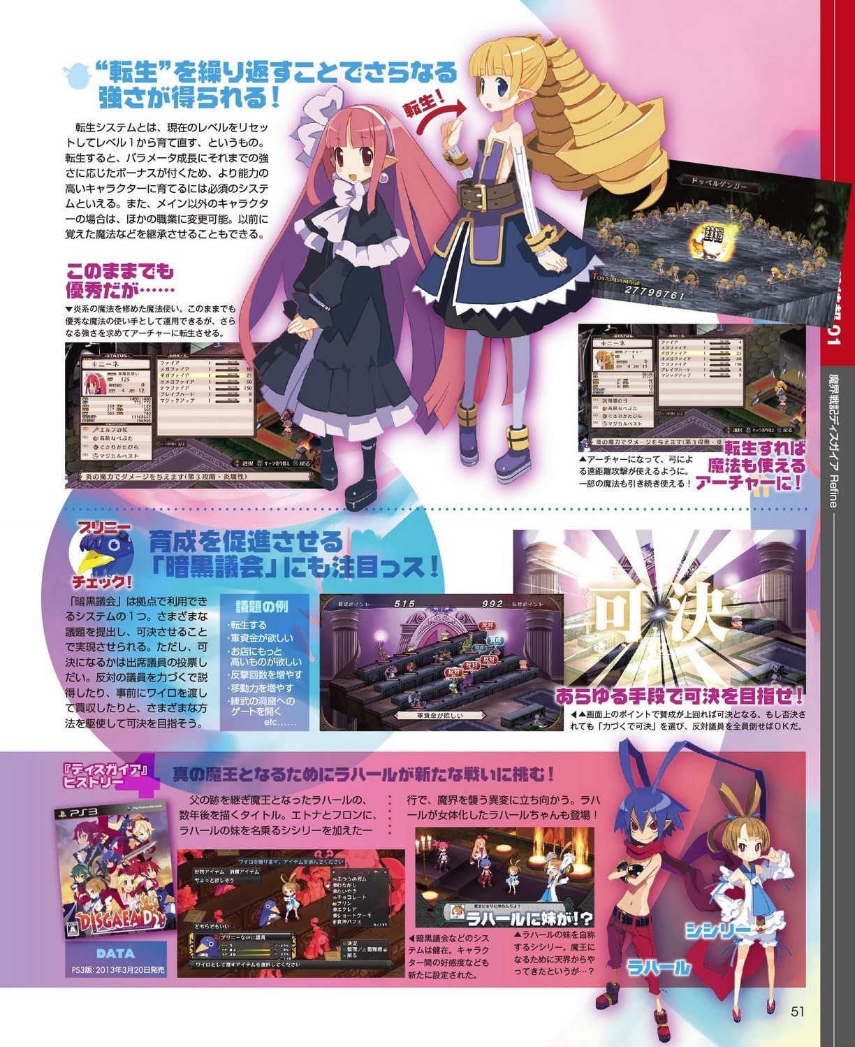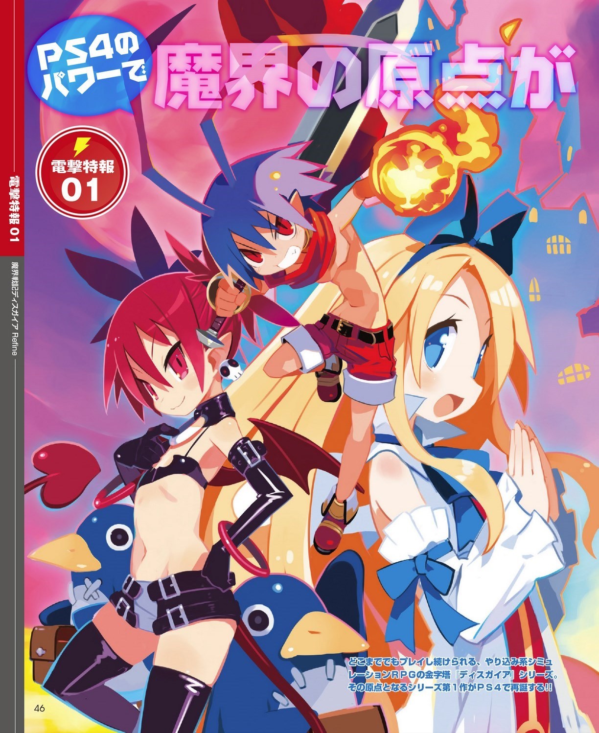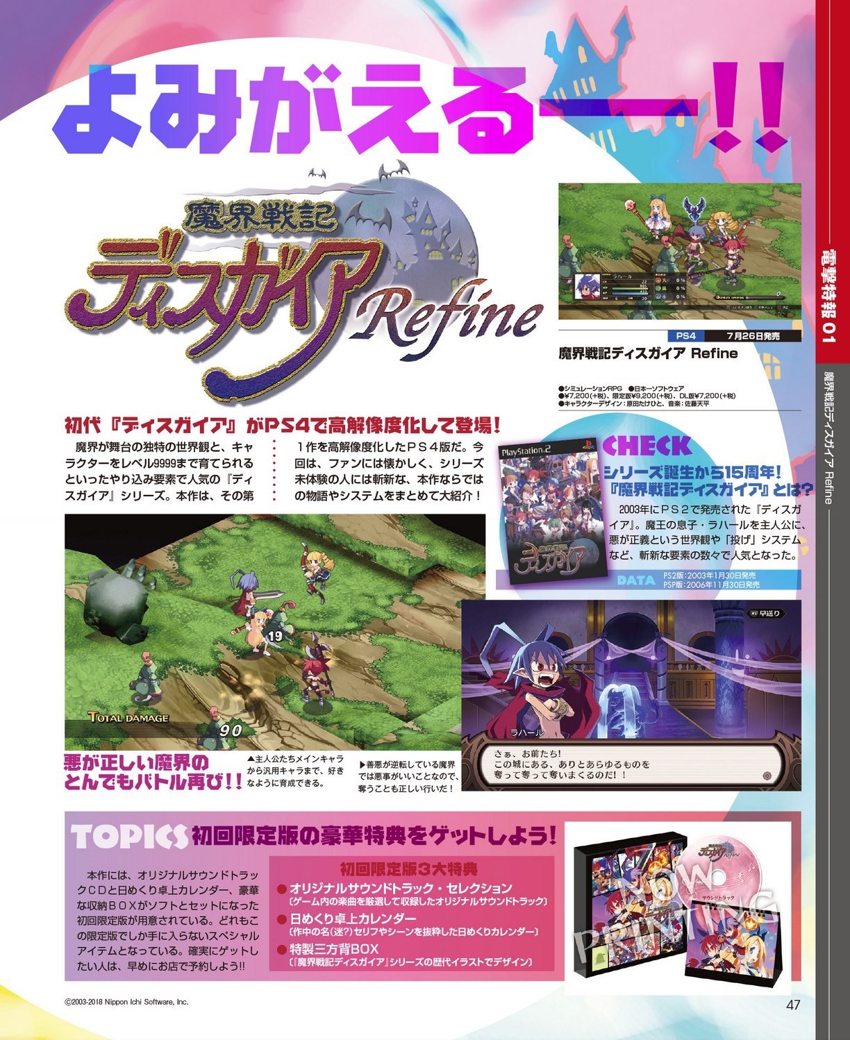 Mise à jour du 11 avril : nous avons désormais la confirmation via Dengeki Online que Disgaea Refine sortira bien sur Switch et PS4 le 26 juillet au Japon. Voici les scans de l’article de Dengeki PlayStation (toutes les images vienent bien de Disgaea Refine, sauf celles des bandeaux en bas des pages 48, 49, 50, 51, 52 et 53 qui font une rétrospective des différents épisodes de la série sortis sur consoles PlayStation) :