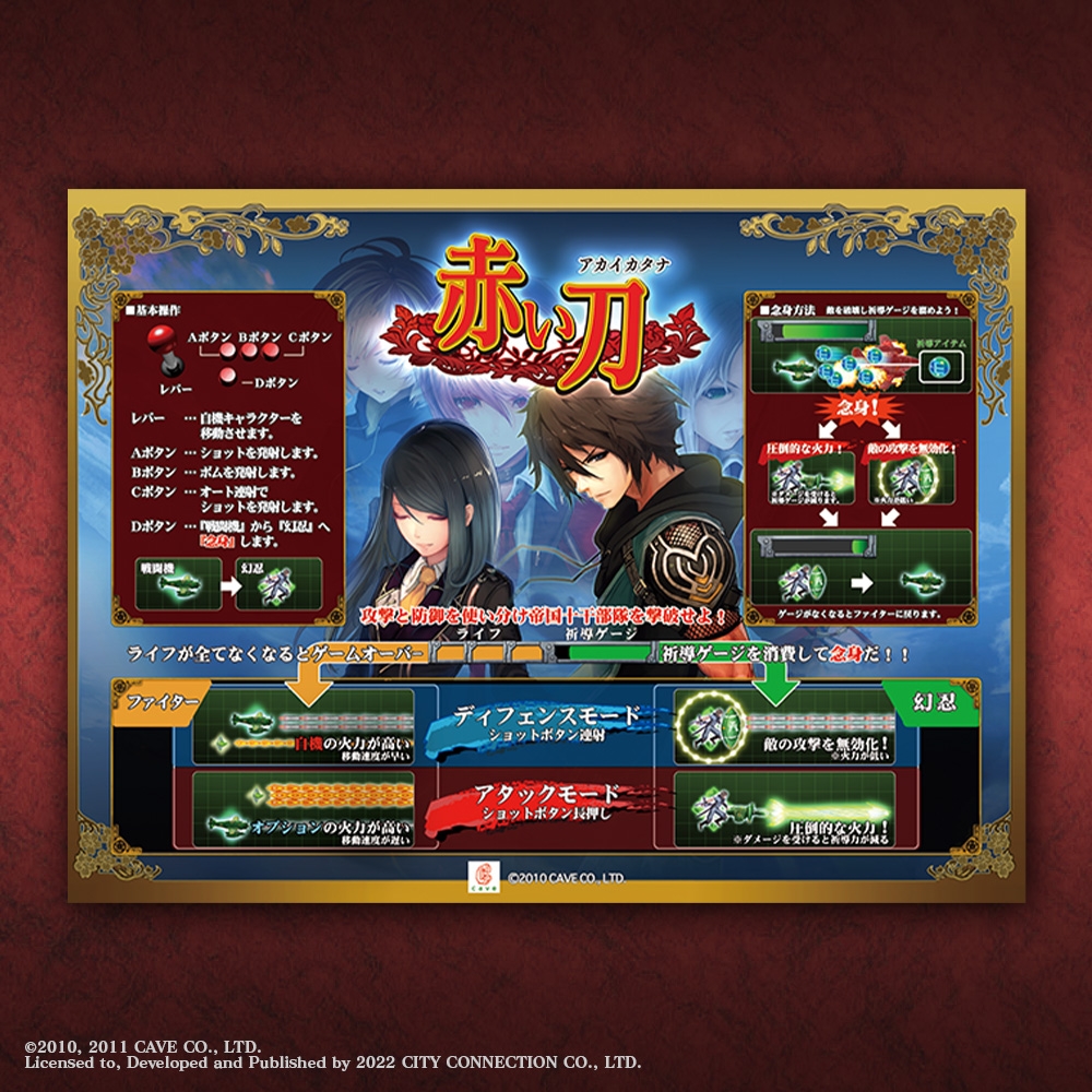 Akai Katana est un jeu de tir de type bullet hell sorti à l’origine le 20 août 2010 sur bornes d’arcade, mais uniquement au Japon. Cependant, le jeu a été porté sous le nom d’Akai Katana Shin sur Xbox 360, tout d’abord toujours seulement au Japon le 26 mai 2011, mais l’éditeur Rising Star Games a sorti le jeu en Europe et aux États-Unis le 15 mai 2012. Le jeu avait été réalisé par Shinobu Yagawa, avec un character design par l’artiste Mushimaro Tachikawa. Il s’agissait par ailleurs du quatrième shoot ’em up de Cave en vue horizontale, juste après Progear et la série Deathsmiles. 10 ans plus tard, Akai Katana Shin revient donc enfin, avec en plus quelques nouveautés. Daisuke Matsumoto, qui avait travaillé sur les musiques arrangées pour Deathsmiles I・II et les effets sonores d’Akai Katana (il a aussi été compositeur pour Armored Core), est en charge des nouvelles musiques arrangées pour le jeu. Il sera possible de choisir entre la bande-son d’origine composée par Ryu Umemoto, les musiques arrangées (toujours par Umemoto) qui avaient déjà été ajoutées dans Shin sur Xbox 360 et les nouveaux arrangements par Matsumoto pour le portage sur les nouveaux supports. Il y aura également des classements en ligne et trois versions différentes du jeu à choisir : Akai Katana / Akai Katana Origin permettant de découvrir la version d’origine telle qu’elle était sur bornes d’arcade, Akai Katana Shin / Akai Katana Slash qui est une nouvelle version pensée pour les grands écrans et avec des mécaniques de jeu revues, et enfin Zetsu Akai Katana / Akai Katana Climax qui se base sur le gameplay de la version d’origine, mais avec des ajustements rendant le jeu plus équilibré.