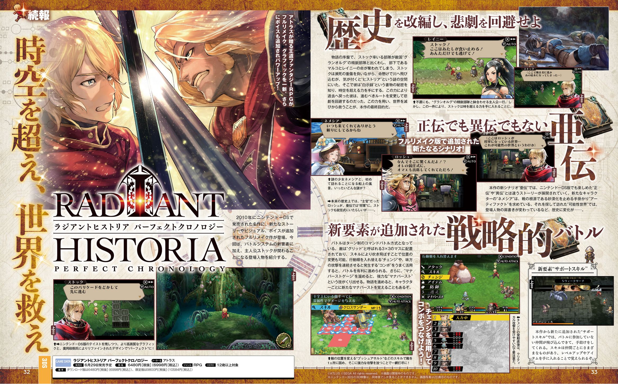 Radiant Historia : Perfect Chronology est un remake du RPG Radiant Historia, sorti sur Nintendo DS le 3 novembre 2010 et le 22 février 2011 aux États-Unis. Vous pouvez en apprendre plus en consultant nos anciens articles à cette adresse. Perfect Chronology sera disponible le 29 juin prochain au Japon pour 6998 yens (taxes incluses) en version standard et une Perfect Edition sera également proposée au prix de 10 584 yens avec une version physique du jeu, l’album complet de la bande-son (deux disques) comprenant toutes les musiques composées par Yoko Shimomura ainsi que les 5 pistes arrangées et d’autres arrangements inédits, un artbook spécial avec 100 pages en couleur et trois packs de DLC (cinq objets, quatre histoires secondaires, une fonctionnalité pour utiliser les illustrations d’origine des personnages réalisées par Hiroshi Konishi, à part pour les nouveaux personnages, et l’option Character Deformation qui permettra de modifier les illustrations des 10 personnages principaux en versions “chibi”, dessinées par CHANxCO). Des Famitsu DX Packs et des bonus de précommande seront aussi de la partie, dont des thèmes exclusifs pour le menu HOME de la 3DS (proposés par Amazon Japan et TSUTAYA Online).